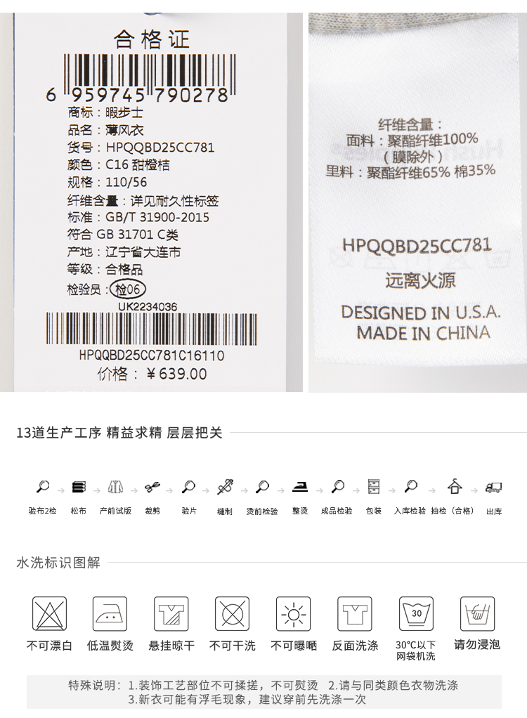 这款暇步士 儿童 连帽风衣,采用3D结构薄膜复合面料,透湿率≥3000G(M2.24H),,防风透湿,可长时间保持身体干爽舒适,表面特氟龙防水层,荷叶拒水耐脏耐油污,内里棉汗布,亲肤透气穿着更舒适,非常适合春秋季节穿着,也可在冬季不太冷的时候穿着。