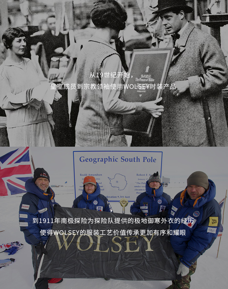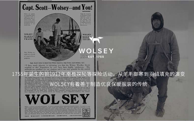 1755年,WOLSEY诞生于高尔夫运动的发源地英国,距今已有260多年的历史了。1755年,Henry Wood建立了自己的公司,为WOLSEY两百多年的辉煌发展奠定了起点。在英国工业发展鼎盛期的维多利亚女王时代,体育、休闲、娱乐日益盛行。WOLSEY正是在这一时期崛起,成为体育、时尚休闲类的服装著名品牌。特别是,由于当时高尔夫运动在大众化的体育休闲活动中最为受到关注和喜爱,WOLSEY开始涉足高尔夫系列服装的生产,并将这一传统领域延续至今。1935年和1959年,WOLSEY分别被乔治五世、二世授予“英国王室特供用品”的资格。1974年,狐狸的形象作为WOLSEY品牌高尔夫休闲类产品的标志终于在英国最好的狩狐猎场Leicester市诞生。今天,WOLSEY狐狸的标志已被全世界广泛认知。
