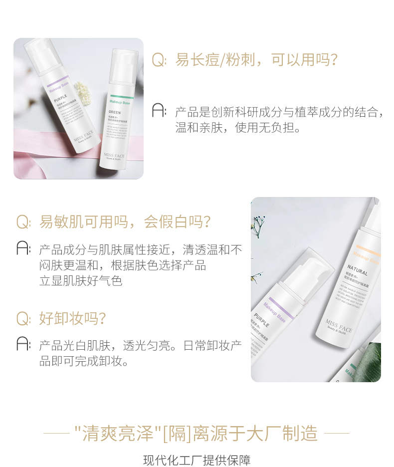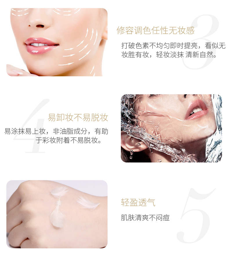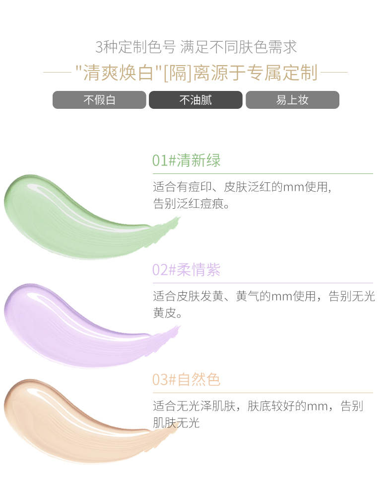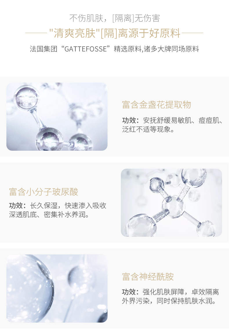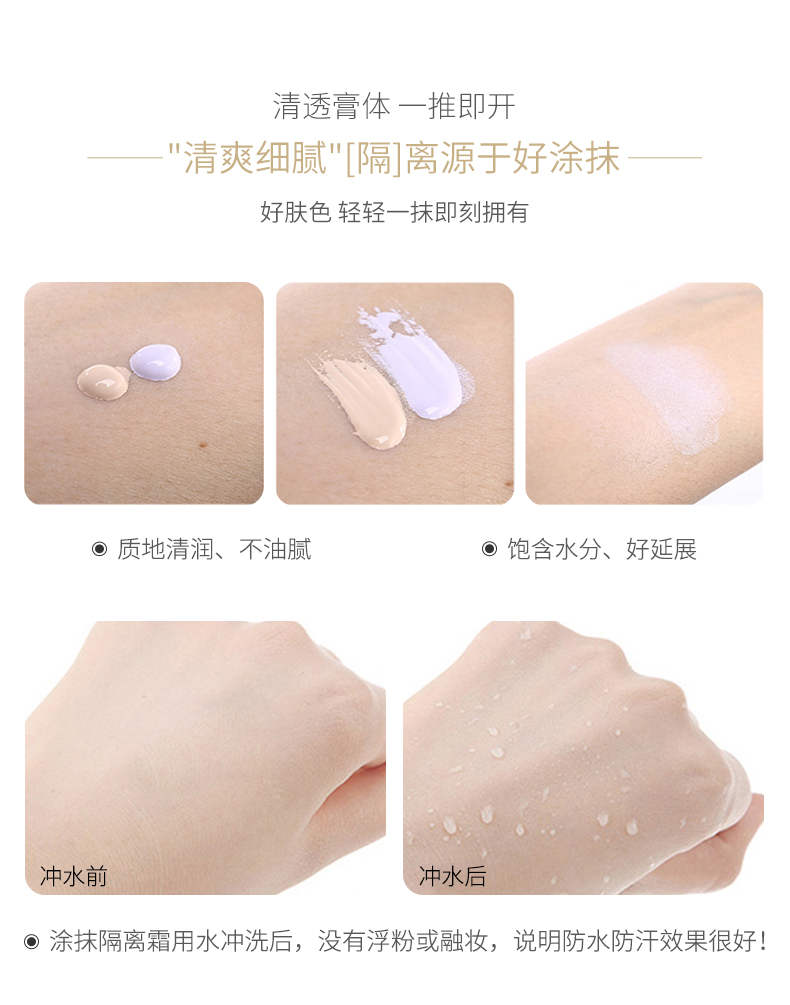 这款妆前乳隔离霜 是精选纯天然豆乳发酵液,能全面地深入渗透肌肤,维护细胞固有水份,保持肌肤细腻柔润,令老化肌肤恢复自然弹性及润白柔嫩光彩;并启动人体自我修护功能,增强细胞天然调节功能。即使是易长痘、粉刺的朋友们也可以使用。