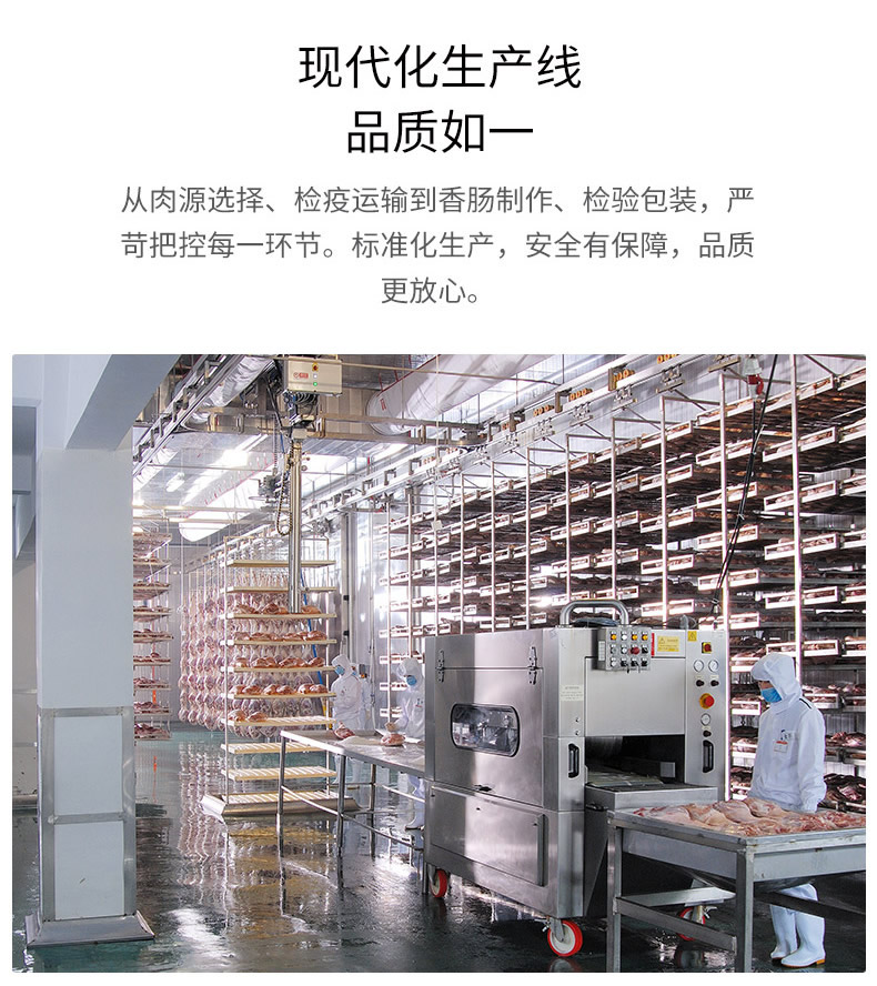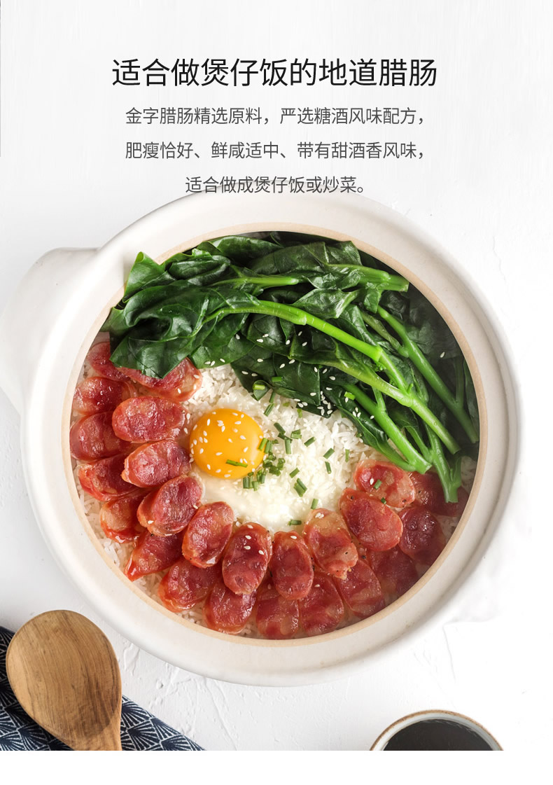 这款金字 广式腊肠香肠,精选肥瘦均匀好猪肉原料,采用地道的糖酒风味配方,以糖中和调味、嫩化肉质,以酒激发鲜味、增加醇香,造就鲜、香、微甜的风味。遵循传统腊肠制作技艺,历经十几道工序制成,外形紧致、色泽光润,肉质紧实有嚼劲。标准化生产车间,食用健康安全。规格:500g。