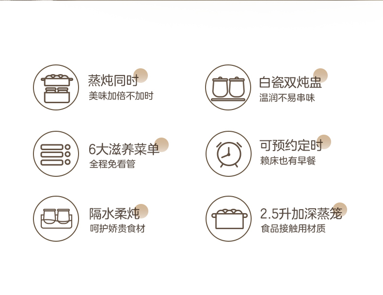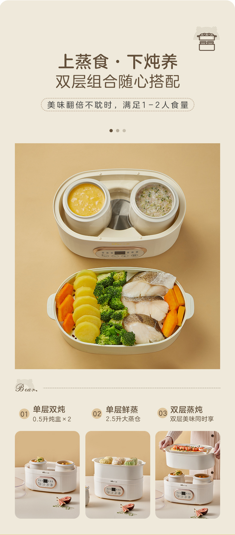 天猫小熊清致专卖店179元,可领50元优惠券,实付129元到手,第一款此价。这款Bear 小熊 多功能电炖盅,双层设计,上蒸食,下炖养,2.5L加深蒸笼,食品接触用材质,白瓷双炖盅(0.5L×2),温润不易串味,古法隔水柔炖,呵护食材娇贵养分,单层双炖、单层鲜蒸、双层蒸炖自由组合,6大功能菜单,轻松选,全程免看管,支持9.5小时预约,可视化视窗,蒸炖一目了然,防烫提手,可拆电源线,便捷收纳。
