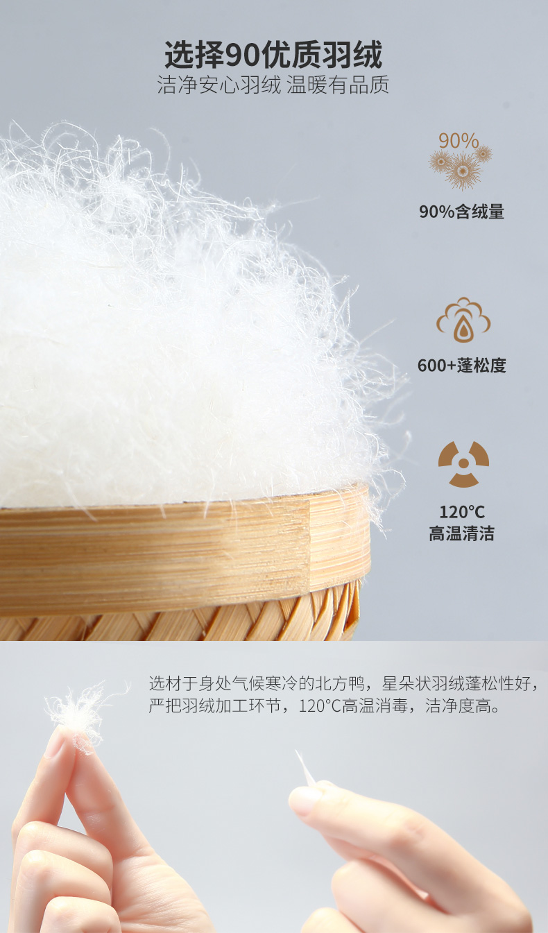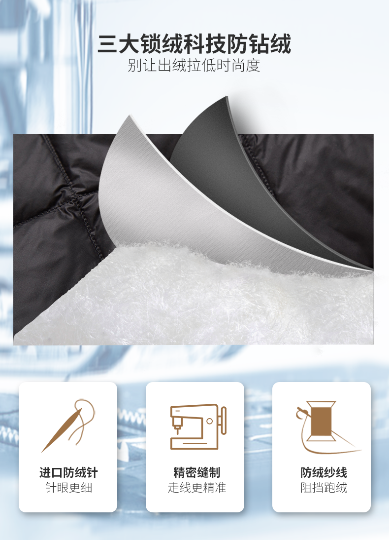 这款羽绒服充绒量90%,精选鸭腹部大绒朵羽毛,蓬松度高,保暖效果好。超纤尼龙面料,防风防泼水,并有效防止钻绒。