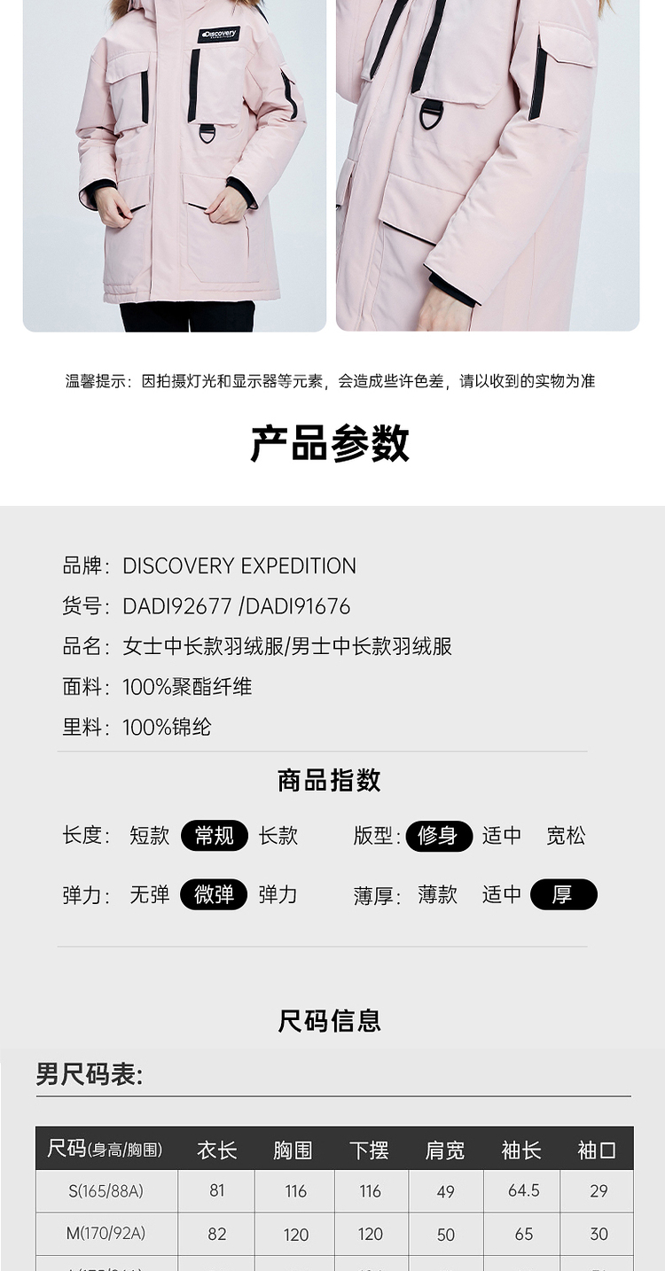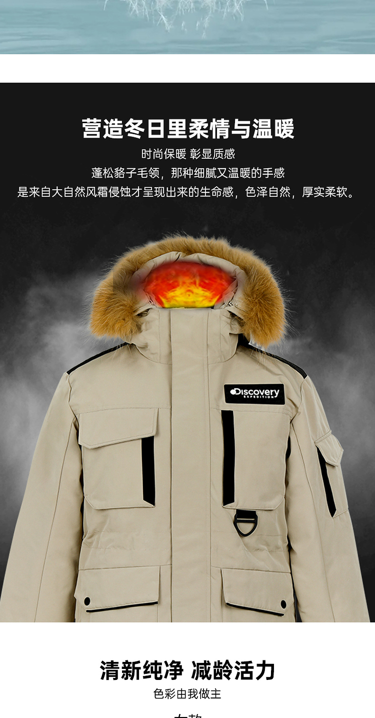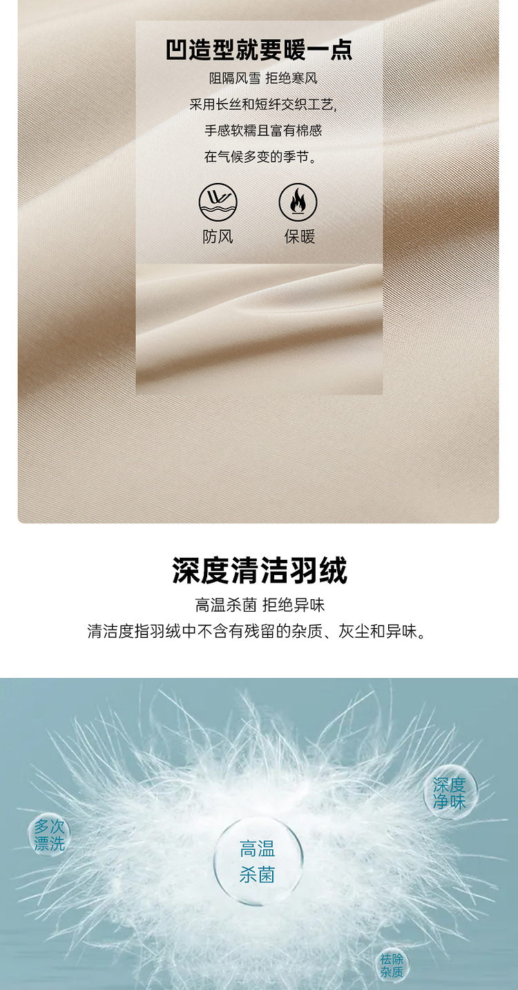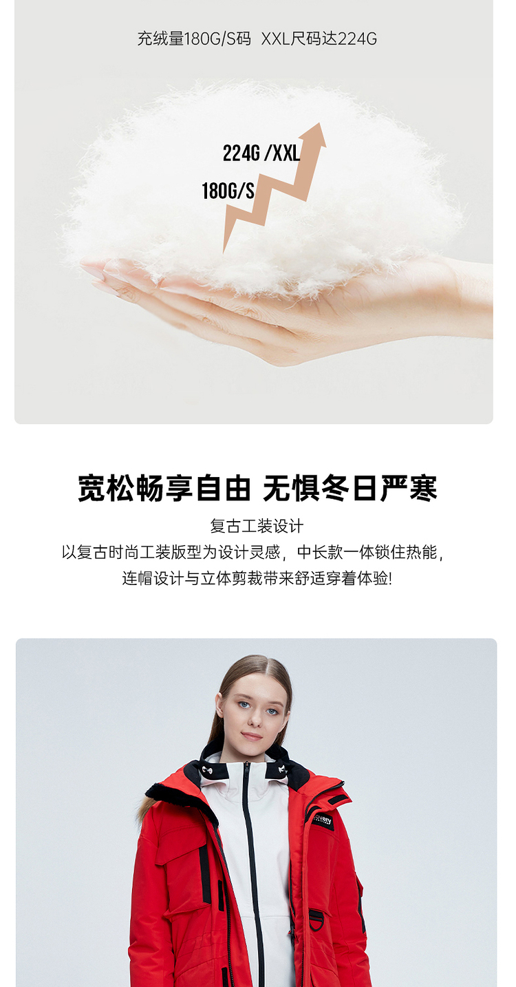 这款羽绒服,复古时尚工装风设计、面料采用长丝和短纤交织工艺,手感软糯且富有棉感,同时防磨耐刮,隔绝风雪,内填充的是大绒朵绒,90白鸭绒,且羽绒经过多道工序、清洗、高温除菌,干净卫生无异味。充绒量L码高达220g,抵御严寒不惧风雪,在南方不太冷的情况下,简单内衣就可满足保暖需求。