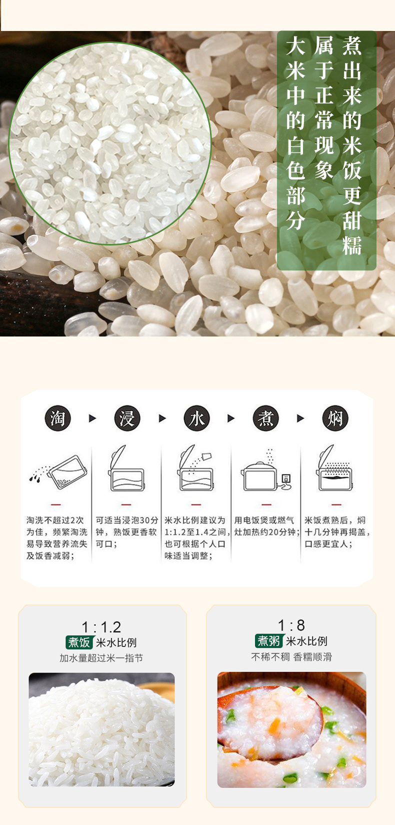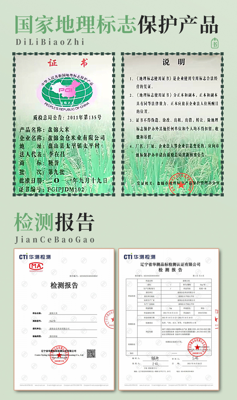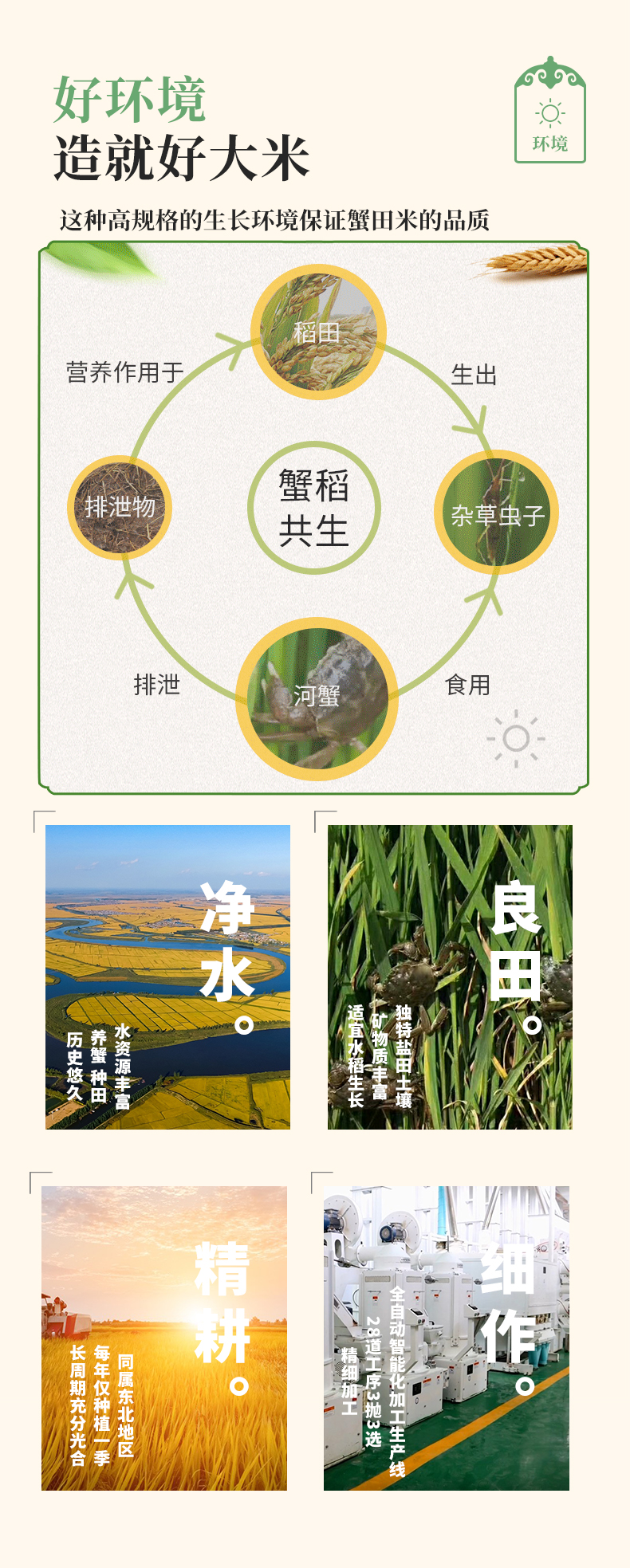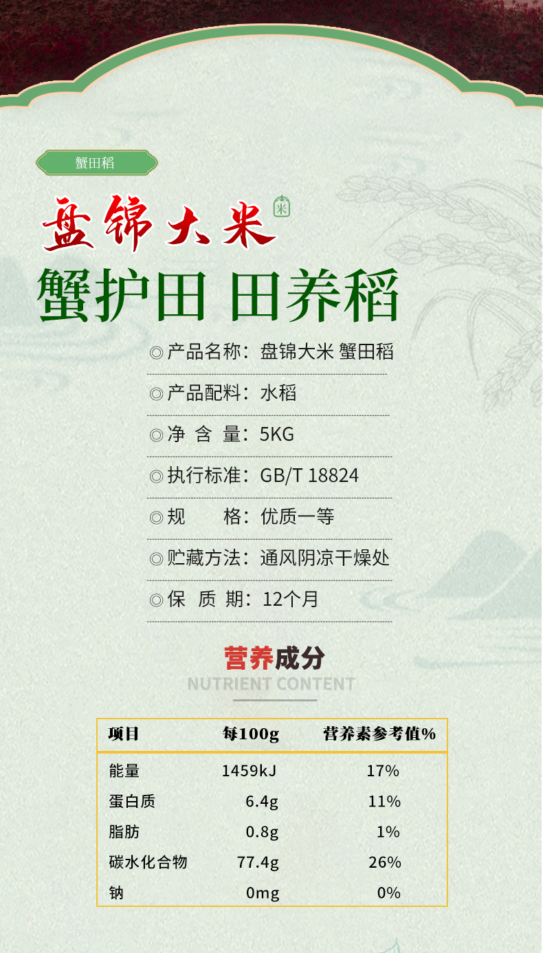 盘锦大米,在稻田内既种稻又养蟹,形成了水稻护蟹,蟹吃虫饵,蟹粪肥田的天然食物链。所生大米粒大而圆,煮饭汁液晶莹剔透,细腻润滑,为稻米中之上乘。颗粒饱满,入口香甜。清新自然香味,口感软弹,米质精良。