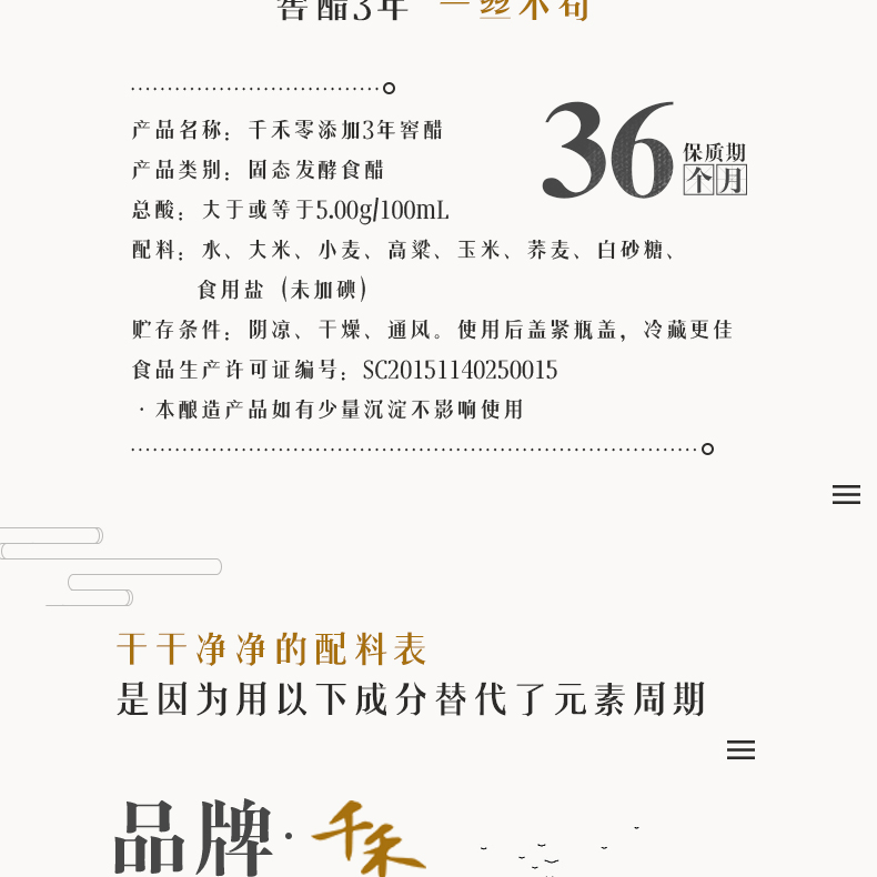 千禾窖醋3年采用糯米、小麦、高粱、玉米和荞麦五种粮食传统醋缸古法窖藏酿造,不添加酸味剂、色素和防腐剂等食品添加剂,零添加的厨房好味道。总酸≥6g/100ml。醋香绵长、味醇厚。规格:1L。领券链接点此