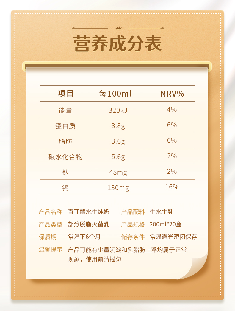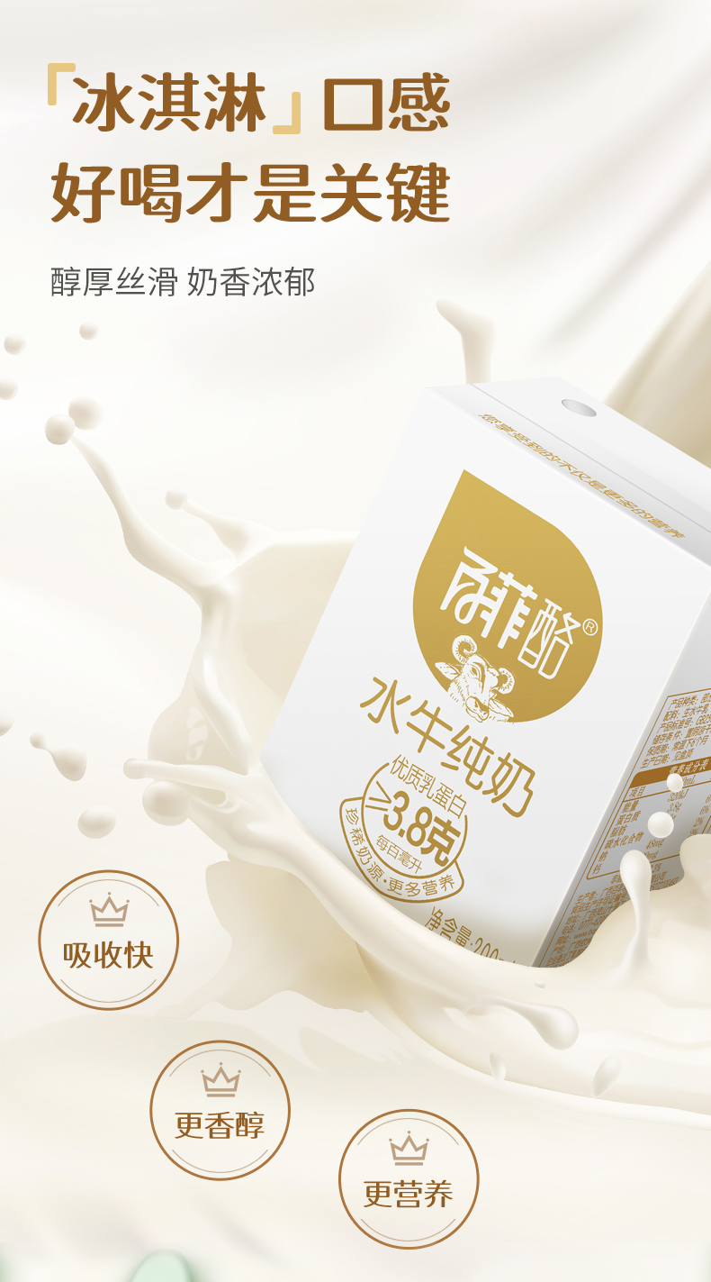 百菲酪水牛奶,来自著名的“中国奶水牛之乡”——广西灵山。100%的纯牛乳,没有任何添加剂,奶味醇厚,无腥味,比一般牛奶略浓稠,微带甜味,口感丝滑,有点像冰淇淋或者奶酪的口味,加热后牛奶表面会结出一层厚厚的奶皮,用来做甜品更棒,适合全年龄段食用。