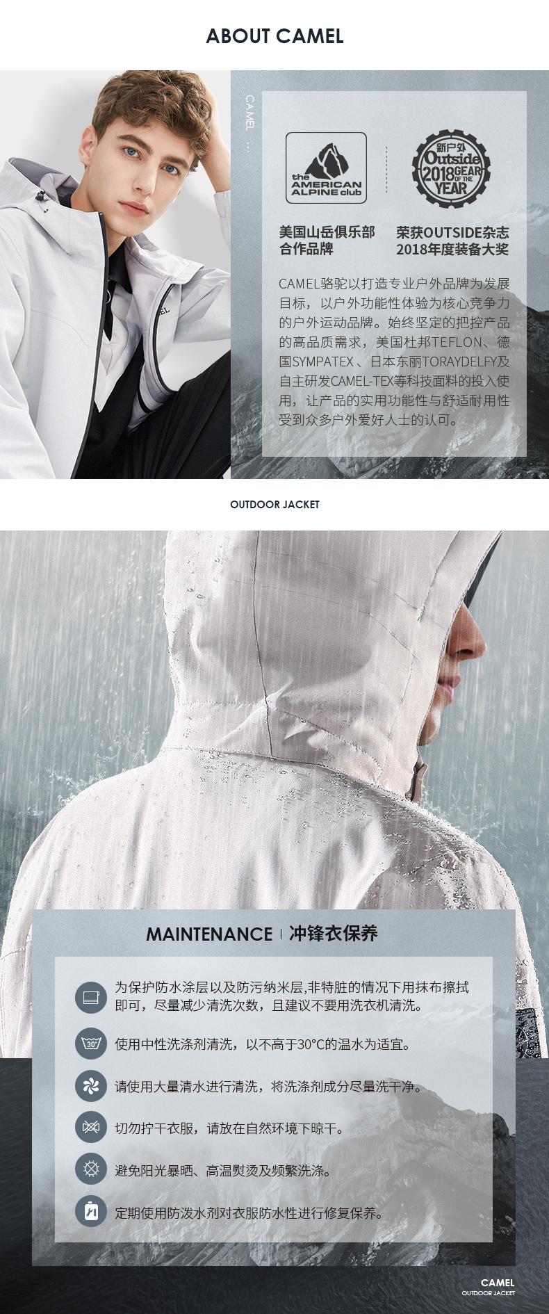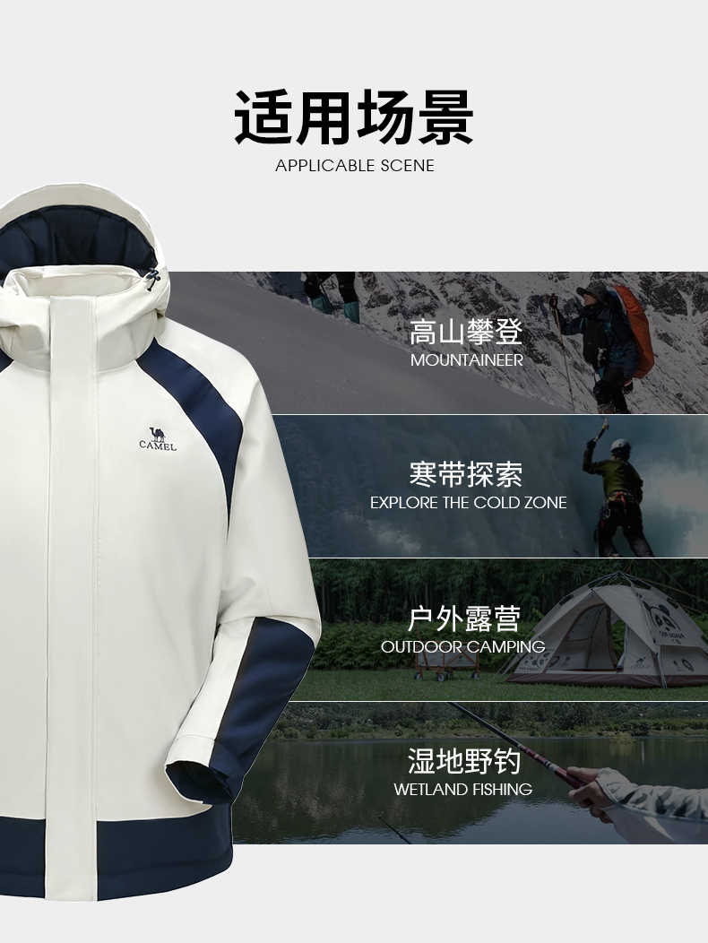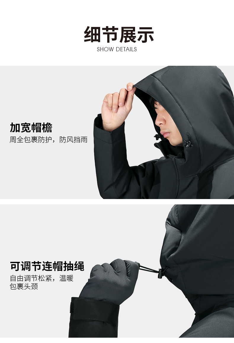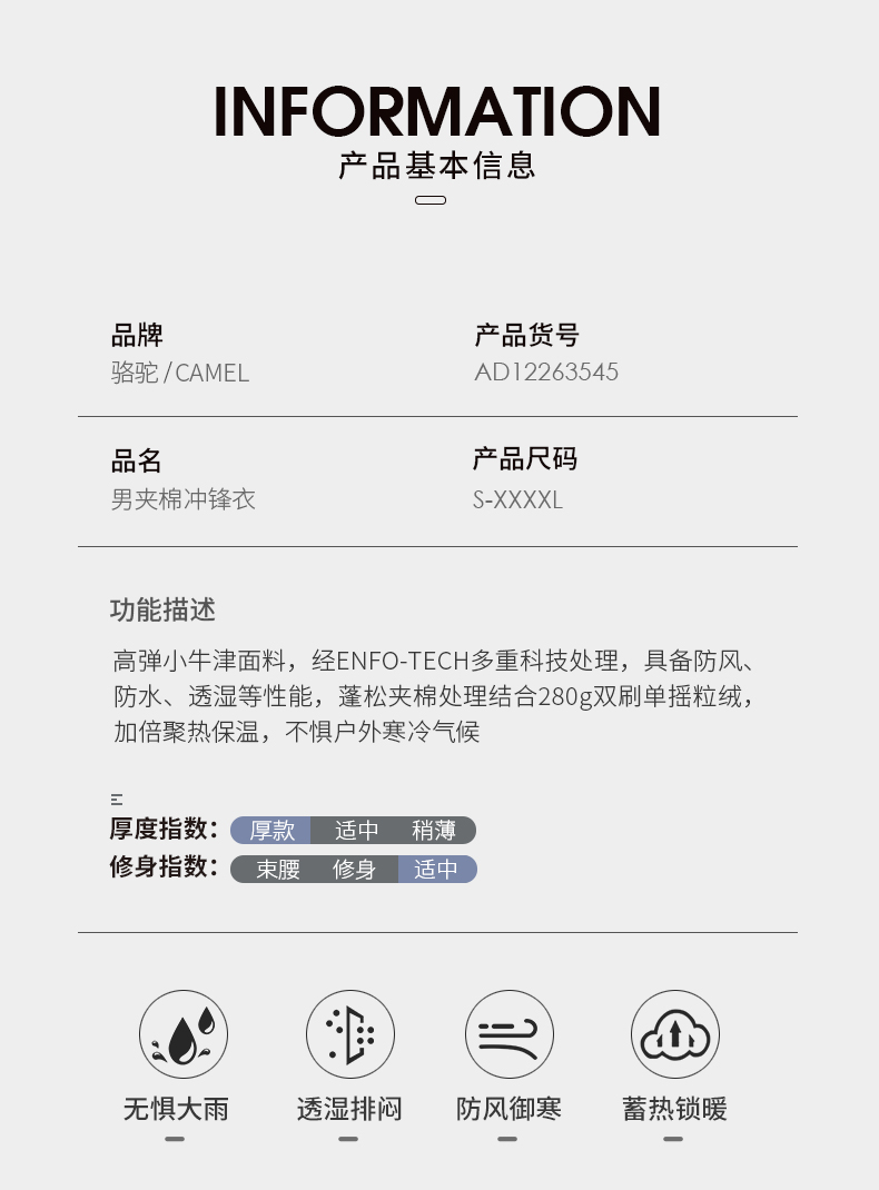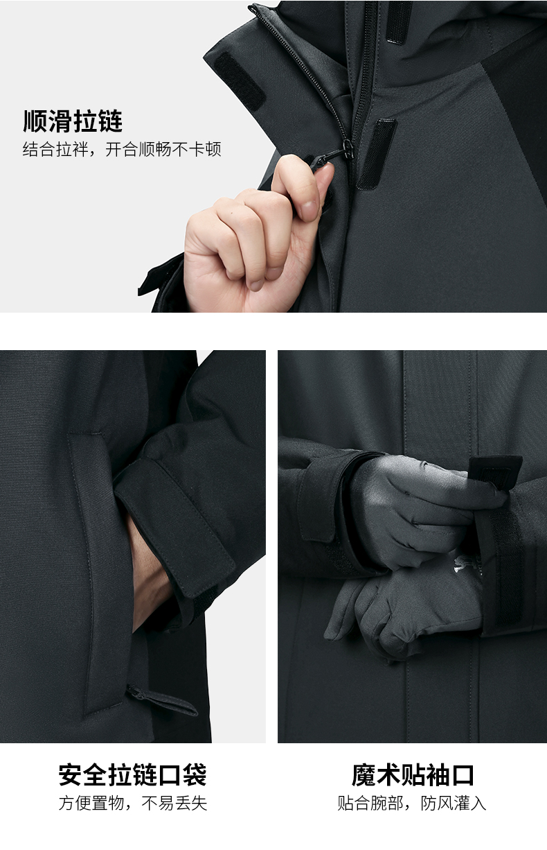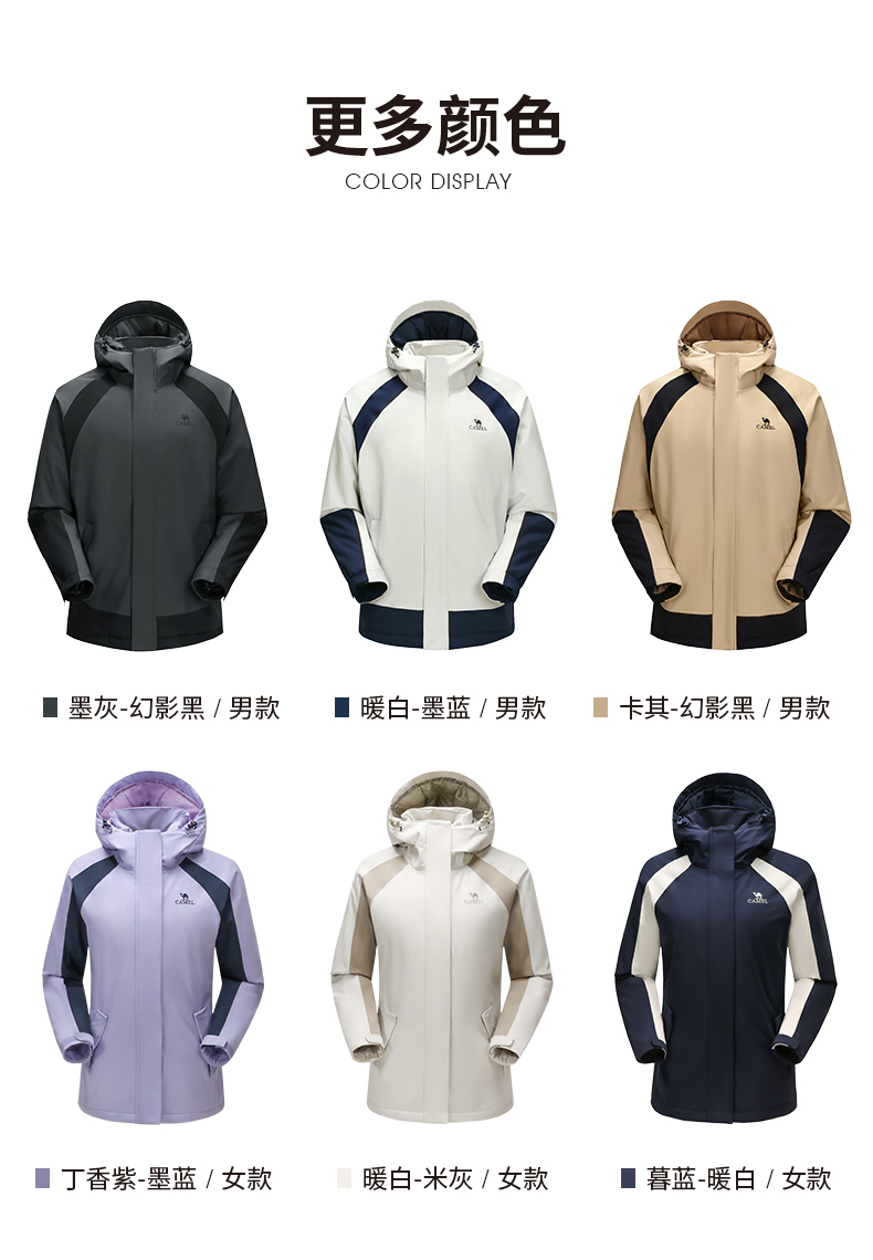这款冲锋衣,柔韧高弹小牛津面料经科技处理,具备出色的防水、防风、透湿功能,防水指数可达无忧风雨天气,夹棉内层,快速聚热保暖,抵御寒冷,立体剪裁版型,上身利落有型。