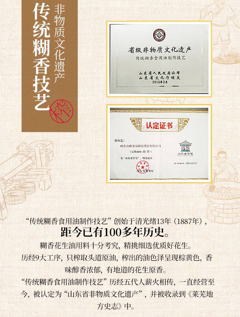 糊香工艺是当今花生榨油工艺中的一种独门绝艺,还被列为省级非物质文化遗产。“去皮、分拣、碾糁、蒸糁、炒糁、入榨、出榨、过滤、沉淀等九大工序可称之为糊香食用油制作技艺的核心。用这种古法工艺榨出的花生油颜色金黄且色泽鲜亮,糊香味醇厚,热度低,桶底没有花生油沉淀物,而且搁置时间也比机榨的花生油长。