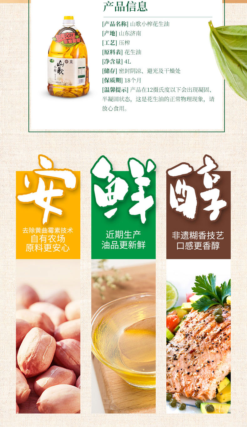 天猫山歌粮油旗舰店129.9元,可领30元优惠券,实付99.9元到手;山东老字号,非物质文化糊香工艺,锁鲜压榨工艺,保留原始营养,浓香纯正,天然清香,不添加防腐剂,油烟少,易吸收。