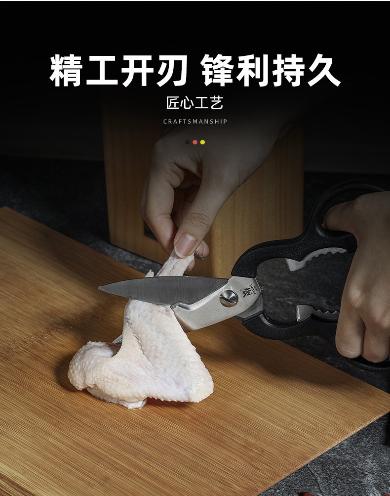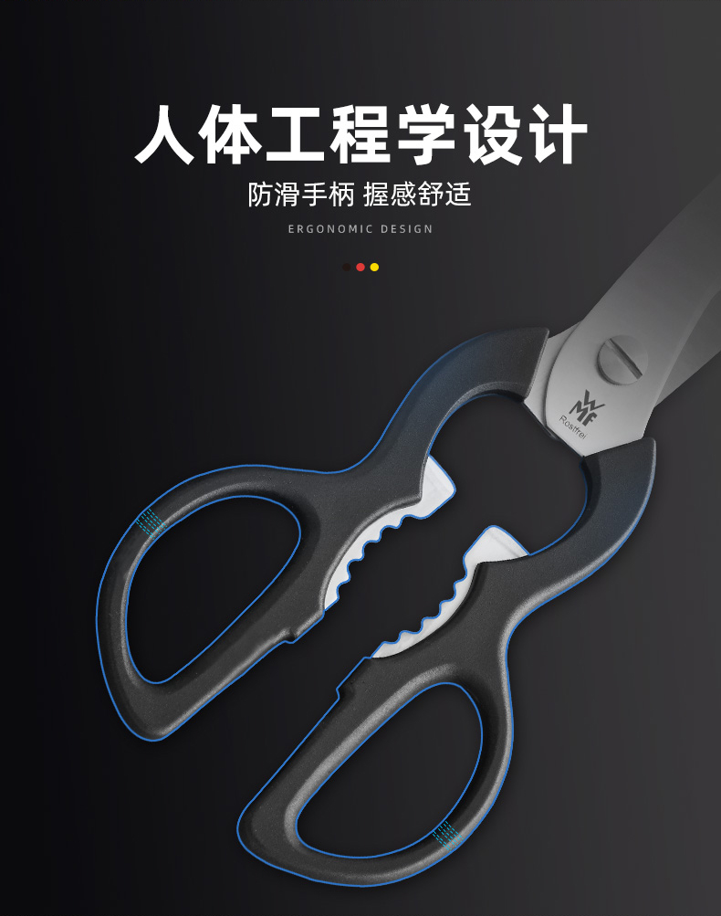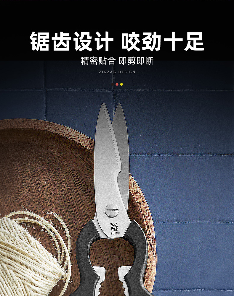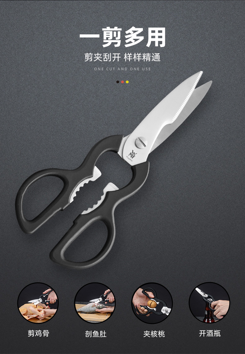 这款WMF 福腾宝 不锈钢多功能厨房剪刀 ,属于Touch系列,采用30Cr13不锈钢材料,耐酸碱,耐刮擦,易清洗,不吸收异味,长度约20cm,在刀刃的外侧还带有锯齿,有助于在切割过程中保持稳定的切割位置。手柄内侧采用硅胶防滑设计,符合人体工学设计,使用舒适耐用。另外,在手柄的中央还设有一个螺丝开瓶器,可以用于开启酒瓶,功能性很强。舒适的手感,实用性强,更加灵活方便。