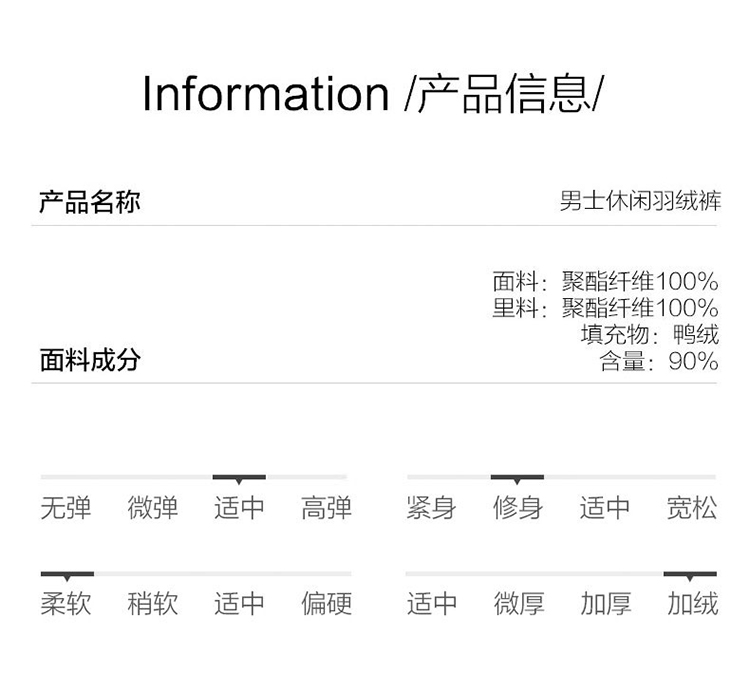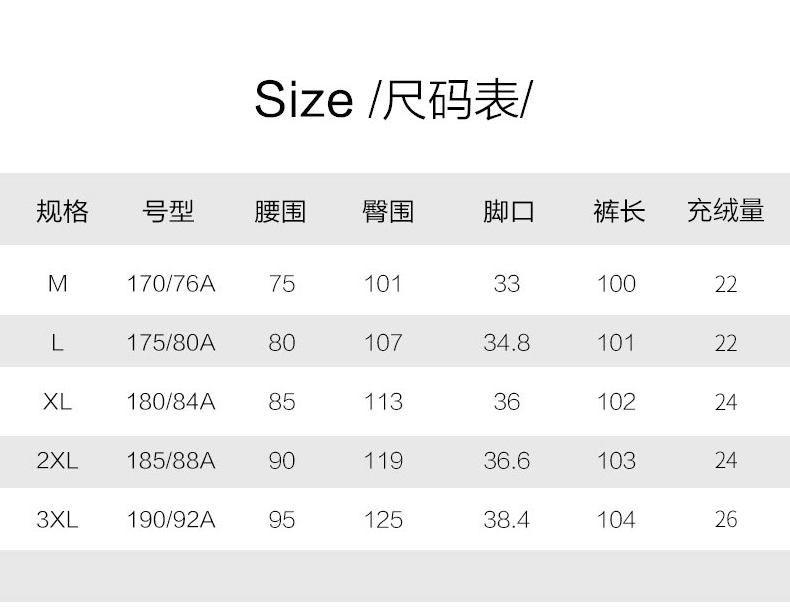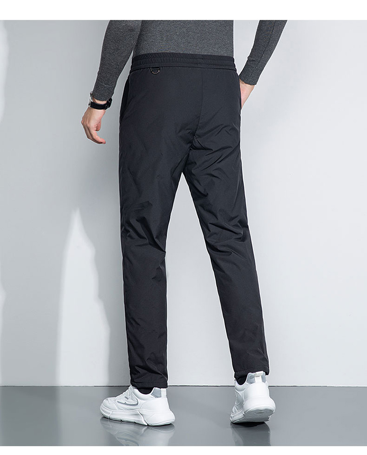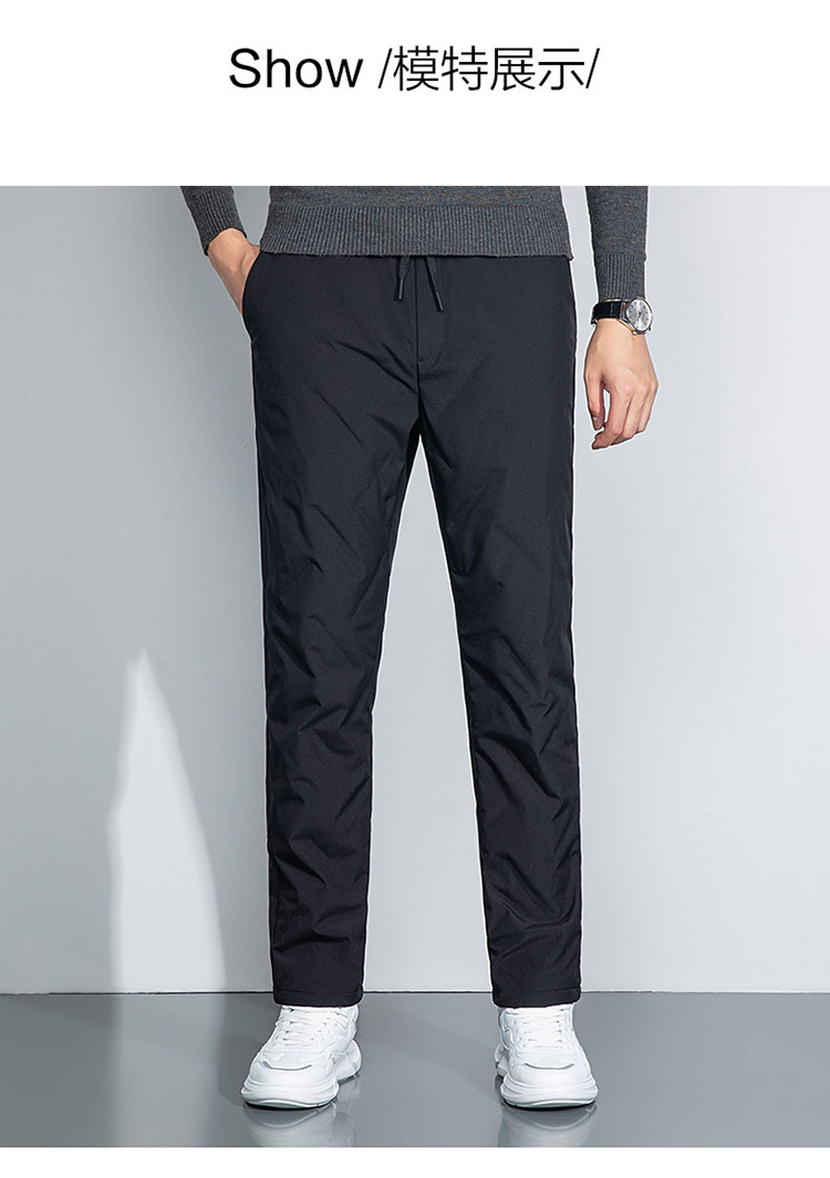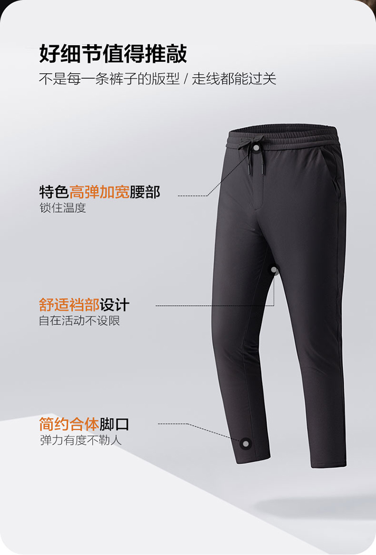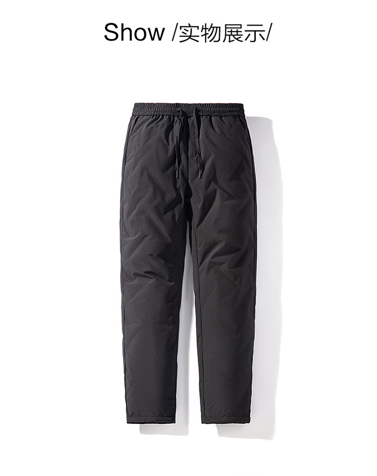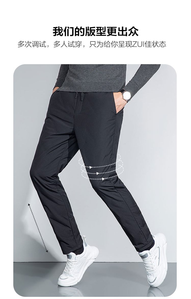 雪中飞 轻便保暖羽绒裤,休闲款式,外层高密面料,防风防泼水,内充大绒朵白鸭绒,合体版型,充绒均匀上身舒适不臃肿。弹力腰口搭配抽绳,穿脱方便舒适不勒。