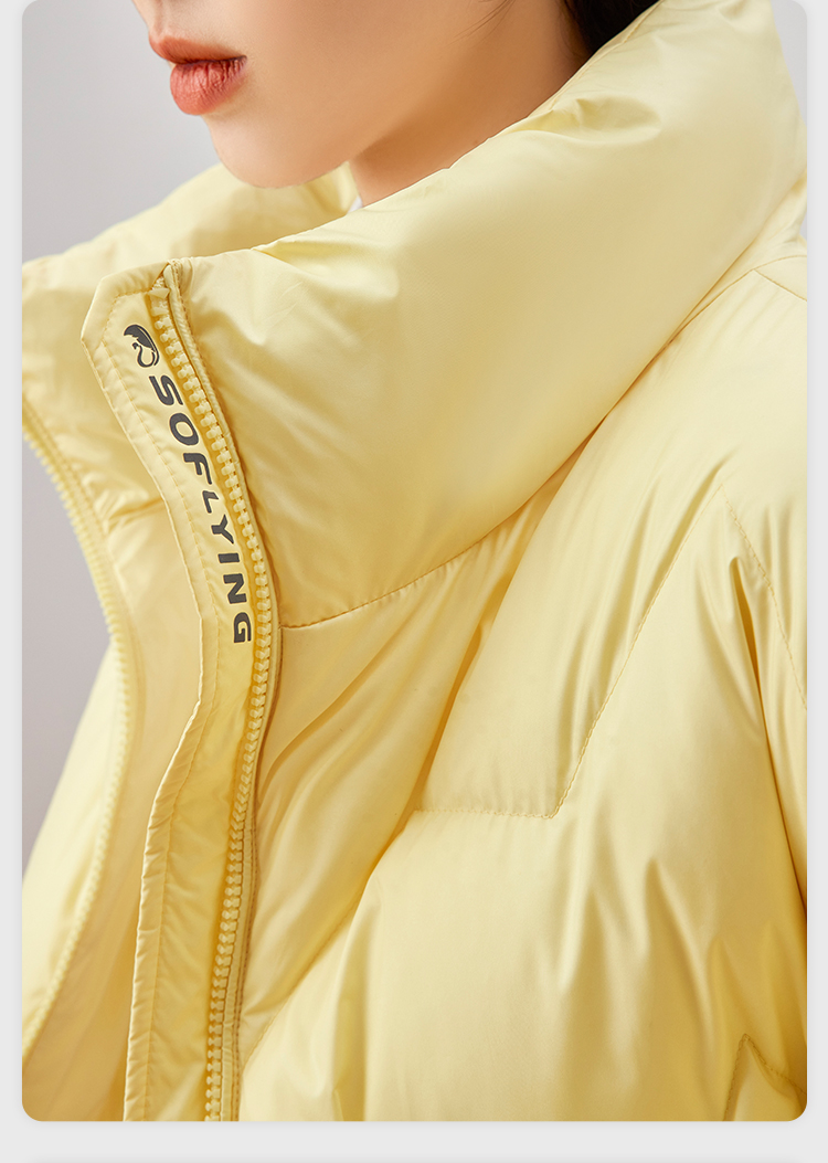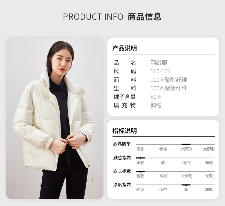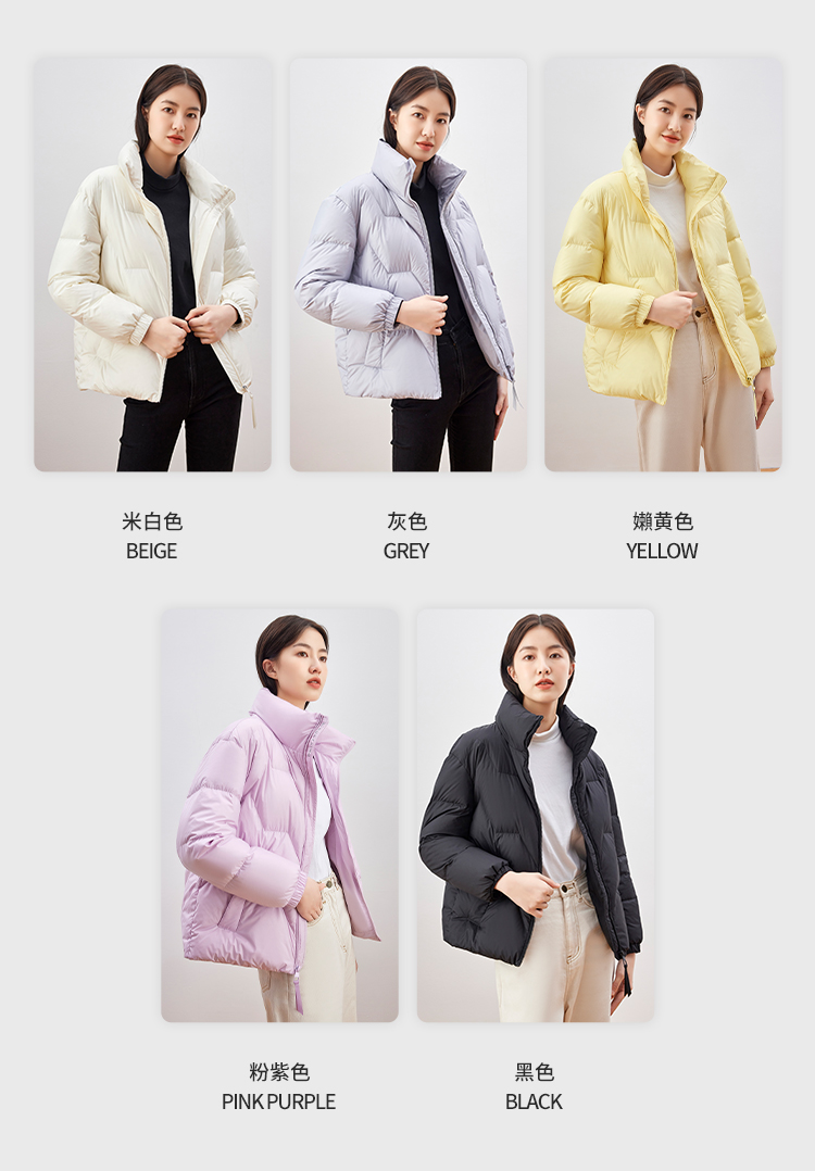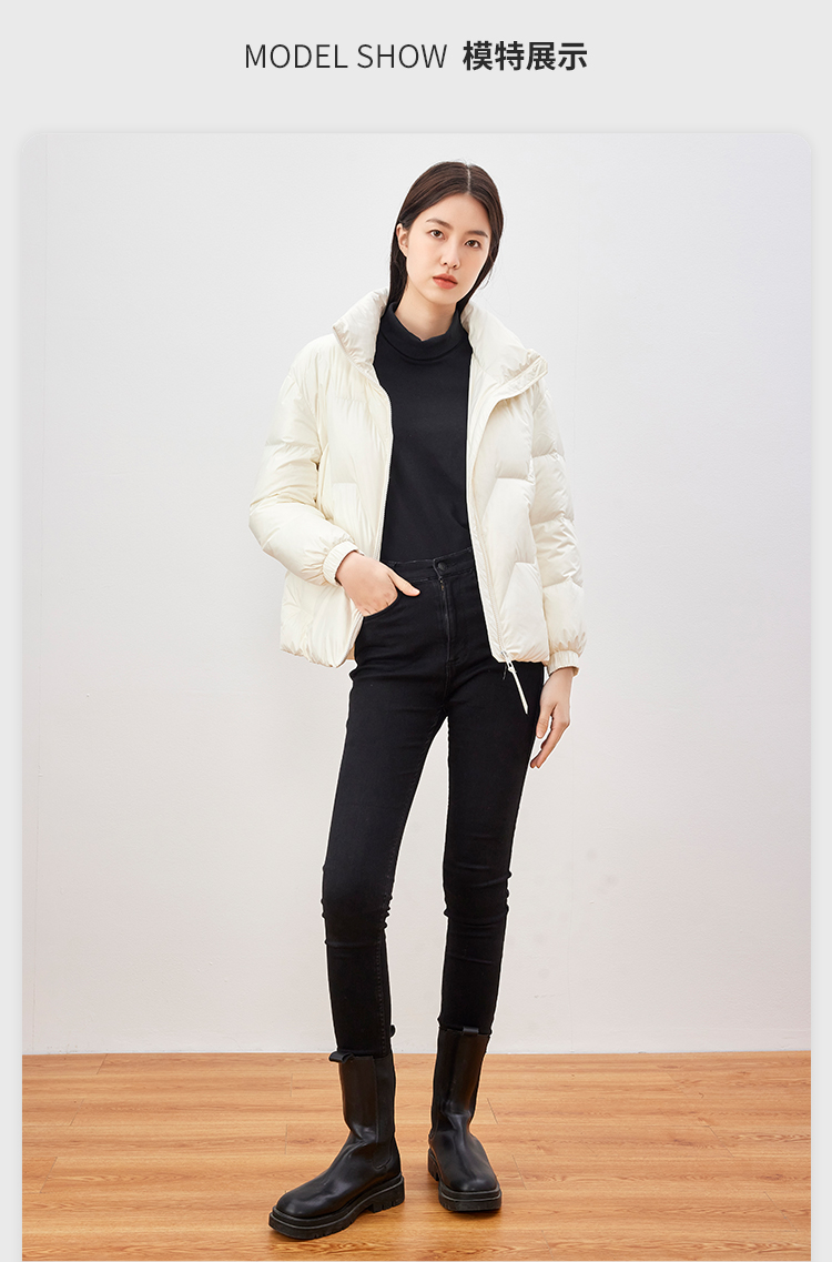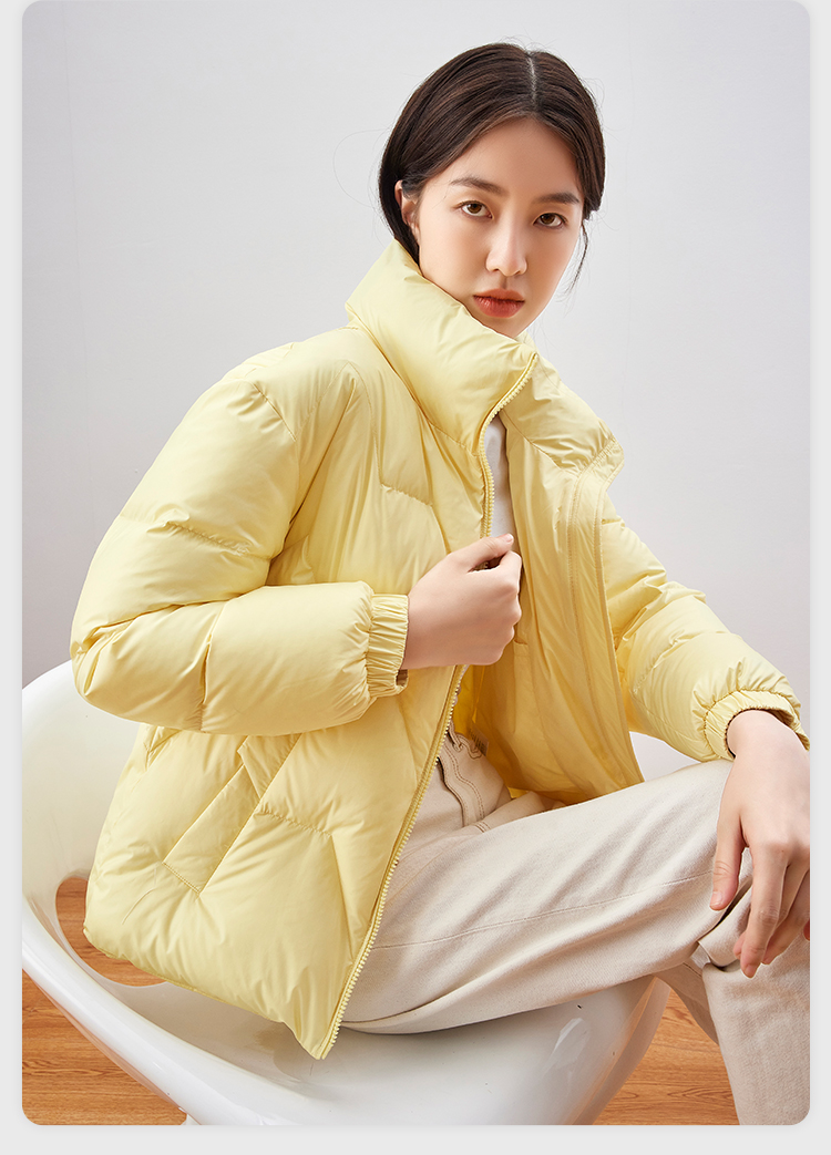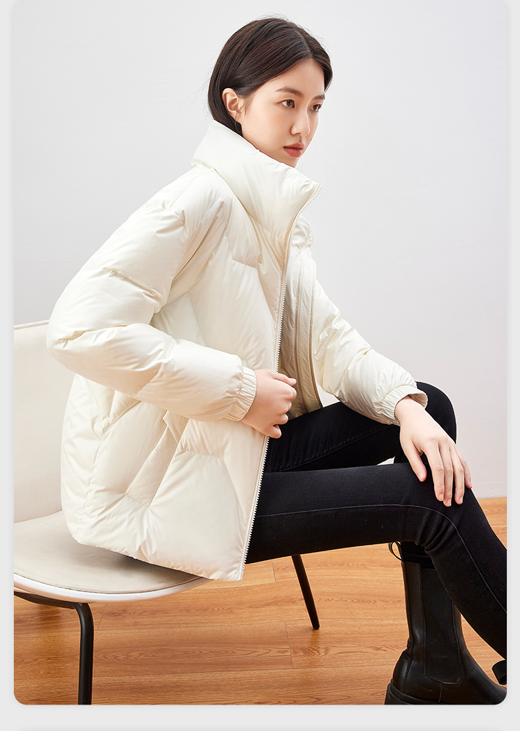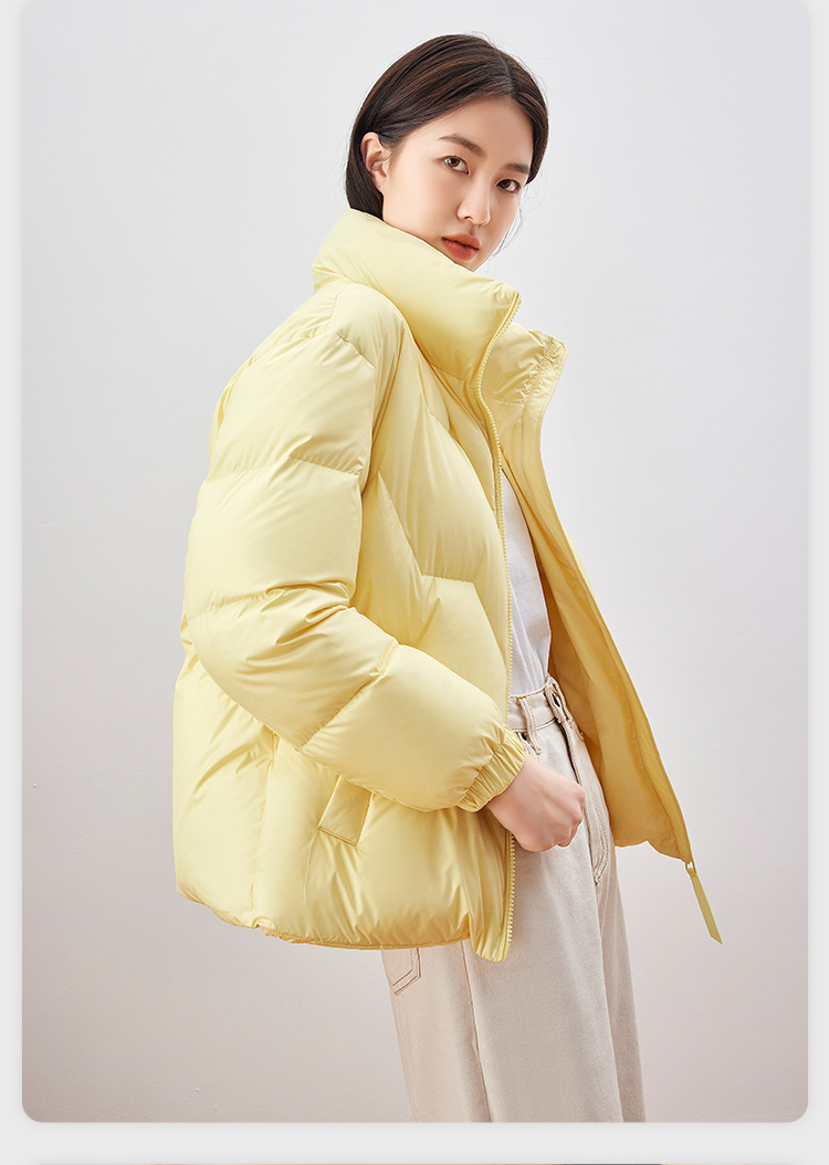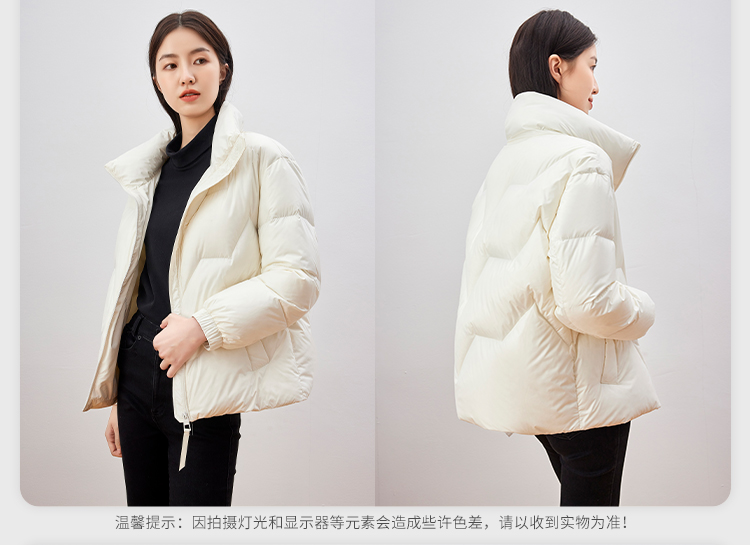 雪中飞 时尚保暖鹅绒服,填充大绒朵优质鹅绒,绒子含量80%,充绒量65-78g,蓬松保暖上身不臃肿,双层高密里料,分格填充,充绒均匀、不跑绒,外层面料100%聚酯纤维,高支高密,防风防泼水,短款H版型立领设计,适合多种身材,穿着时尚百搭。