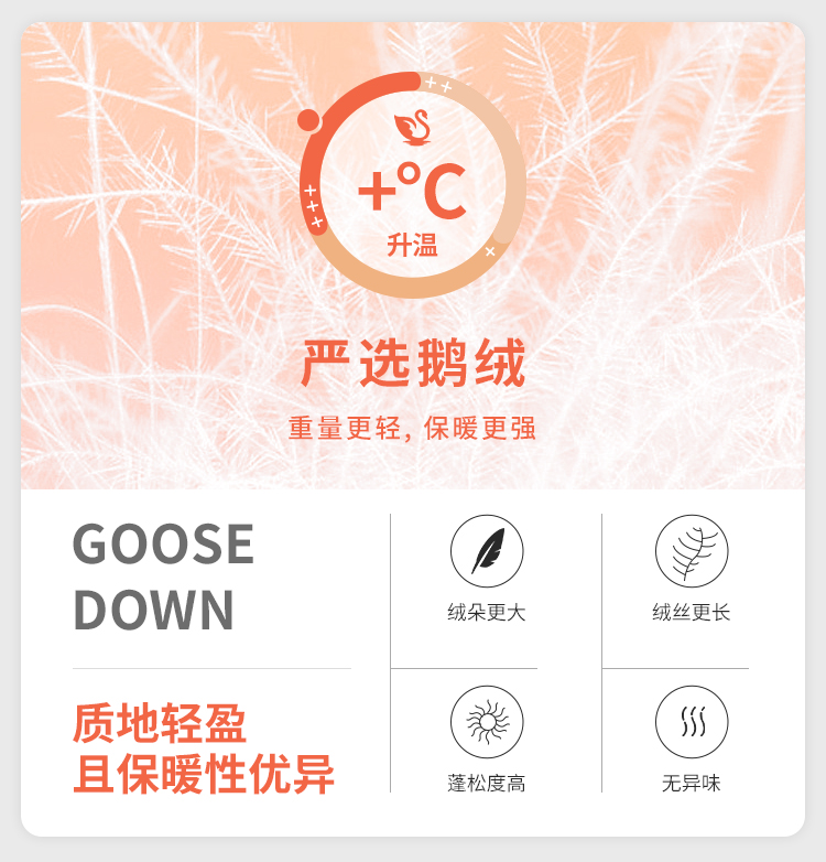 鹅绒相比鸭绒优点,一般鹅的生长期到成熟至少100天,而鸭为40天,所以鹅的绒朵比鸭的绒朵更饱满,绒朵大,绒丝长,蓬松度更高,而蓬松度越高的羽绒服品质更好。另外鹅是吃草的,而鸭子是吃杂食的,所以鹅绒的异味会小很多,处理好基本没有异味。