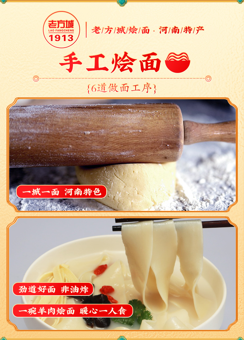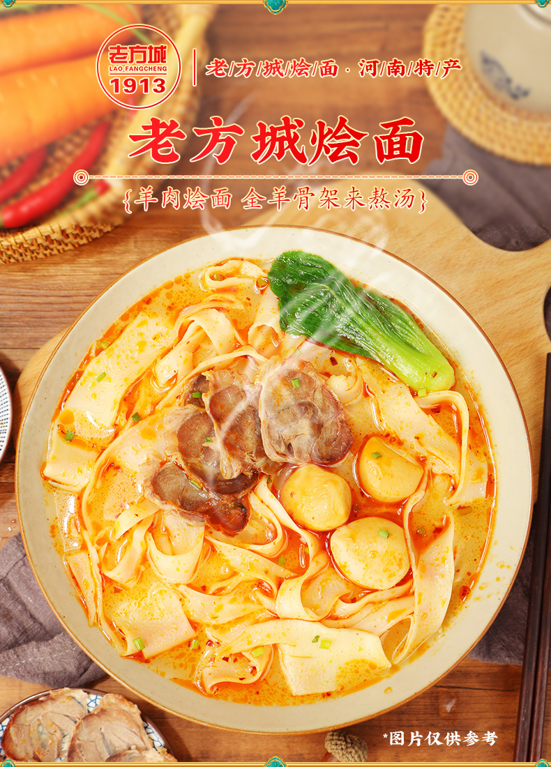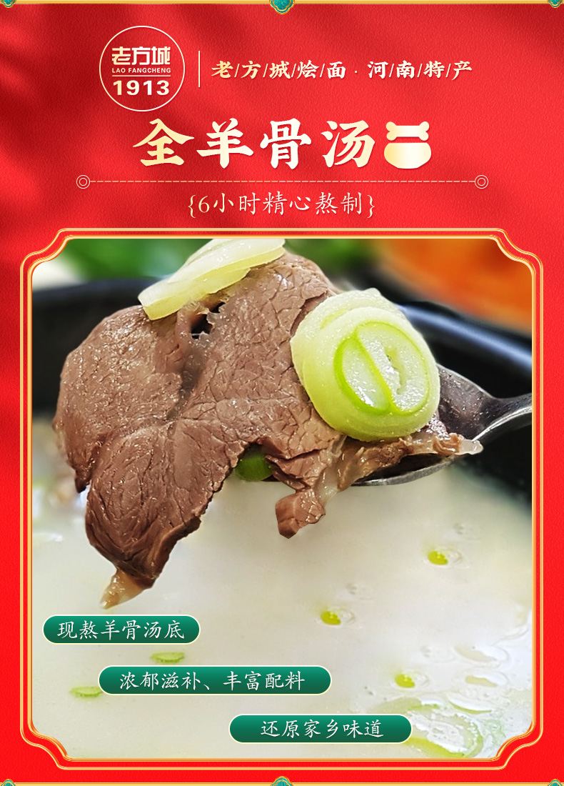 这款河南特产老方城 烩面,全羊骨架6小时精选熬制,劲道Q弹,香浓入口,料包十足,浓郁滋补、丰富配料,还原家乡味道。大片羊肉,真材实料。