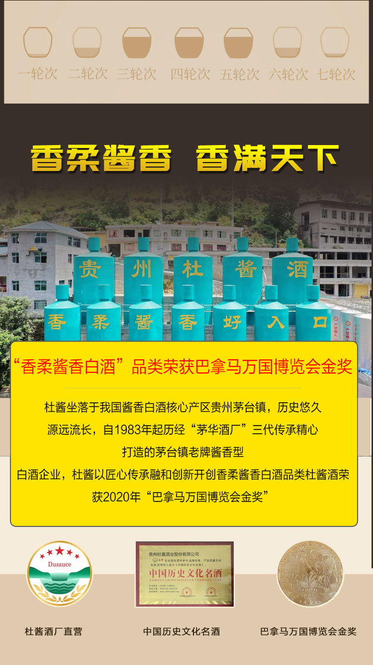 贵州杜酱酒业股份有限公司成立于2011年,前身是1983年成立于茅台镇中华村的茅华酒厂。经四代人的传承。位于酱香白酒核心产区——贵州茅台镇桂花村。与茅台酒厂同享当地得天独厚的气候,环境,水源,原料,工艺等酿酒资源。经过过反复研究实验和公司酒体设计师赵吉龙无数次打磨,巧妙地去除了传统酱香白酒枯、糊、苦的味道,形成杜酱独特的香柔风格。