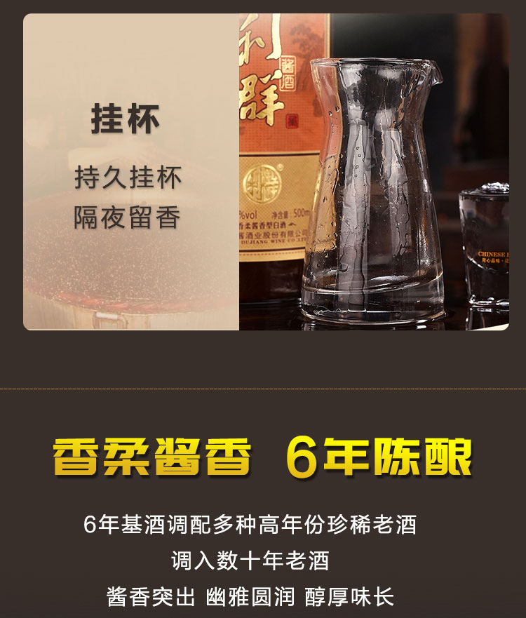 利群酱酒 是香柔酱香型白酒。茅台镇核心产区,甄选红缨子高粱、小麦为原料,坤沙工艺酿制,5斤粮出1斤酒,酒体微黄香柔酱香,酒线拉丝成线,酒花均匀细密,持久挂杯,隔夜留香,好喝不上头。