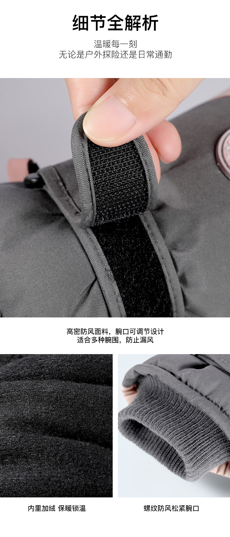 升级款此价,人体工程学设计,佩戴舒适,外层采用防风防泼水面料,内里加绒,锁温保暖,针织罗口,贴合腕部,掌心防滑设计,三指触屏,感应灵敏。无论是远足跋涉户外、登山、骑行或是极地探索,保暖户外手套总能适应你所在的环境。