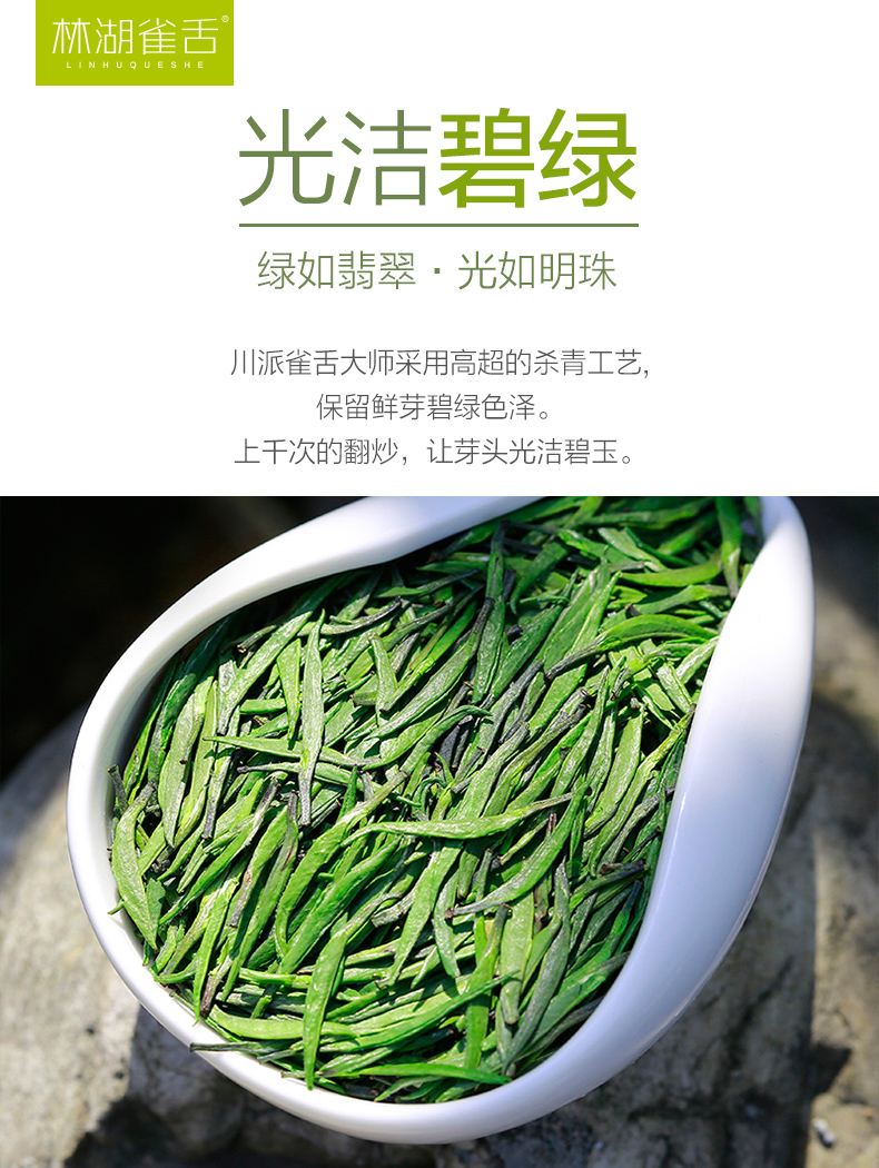 这款林湖雀舌,产自早茶之乡宜宾,明前特级春茶。采摘实心芽头,50000个以上芽头出1斤特级雀舌,每颗芽头都是颜值派。芽头细嫩,色脆香幽,味醇形美,口感醇厚,顺口清甜。