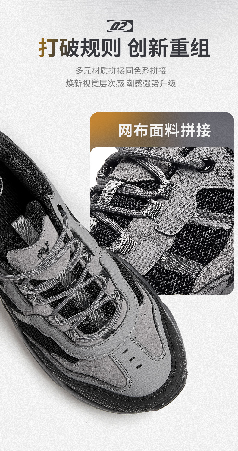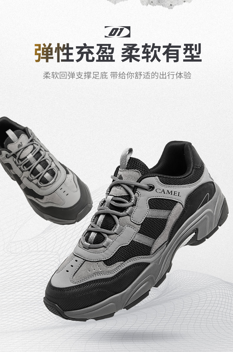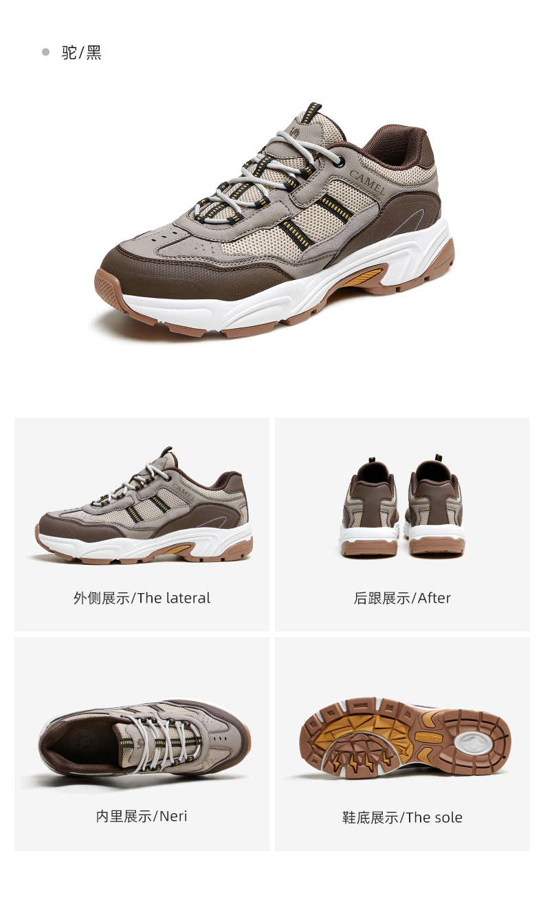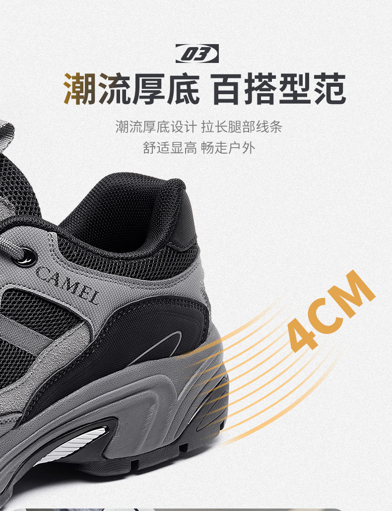 这款休闲运动鞋,鞋面采用皮革革+织物复合材质,复古拼接舒适包裹,富有层次感,兼具防护力与透气于一体,结合透气软弹鞋垫,久穿干爽不闷热。轻质防滑大底搭配立体底纹,具有优秀的抓地力,防滑耐磨,4cm后跟,拉长腿部线条更显高,日常休闲、运动都适合。
