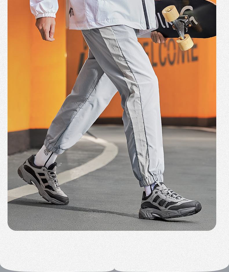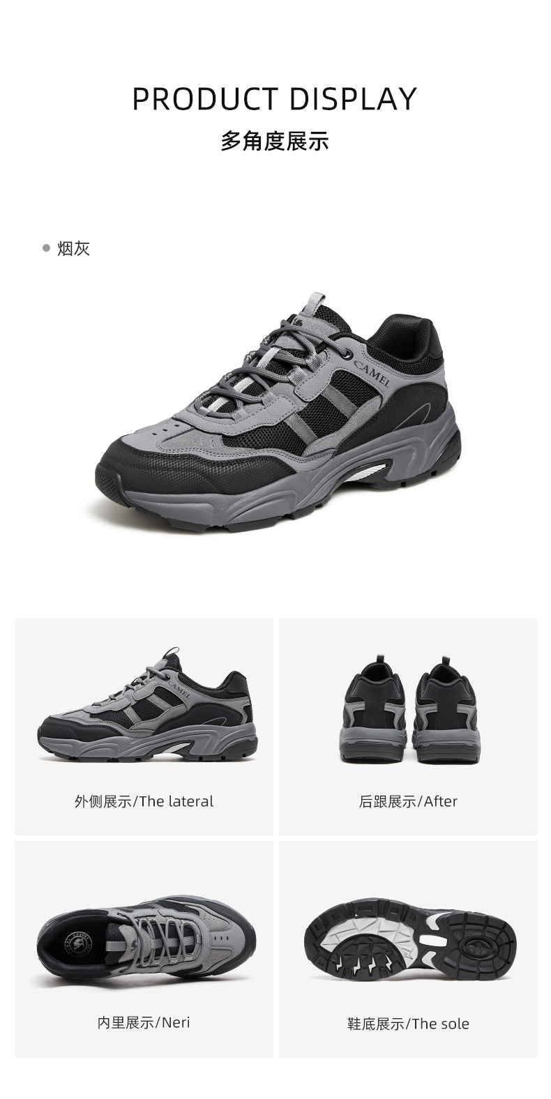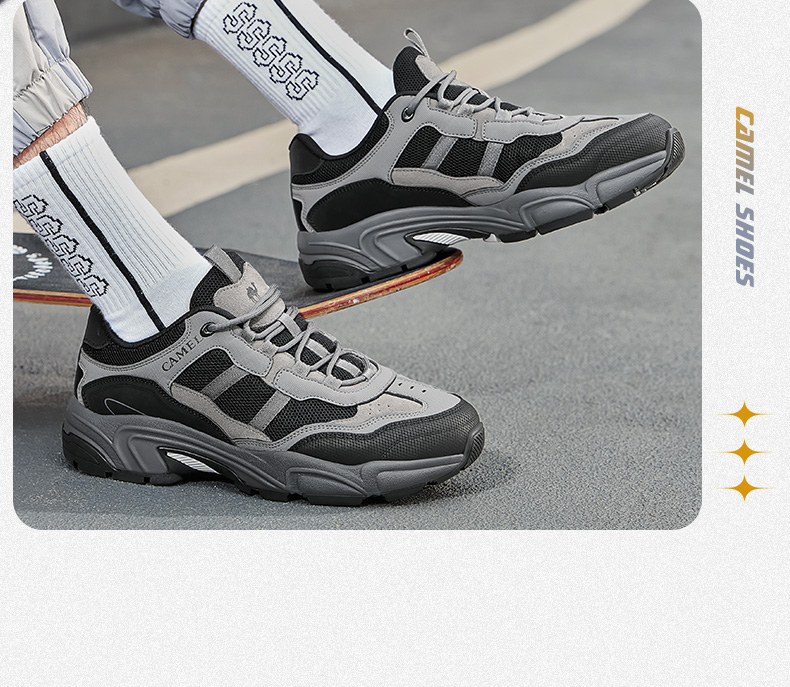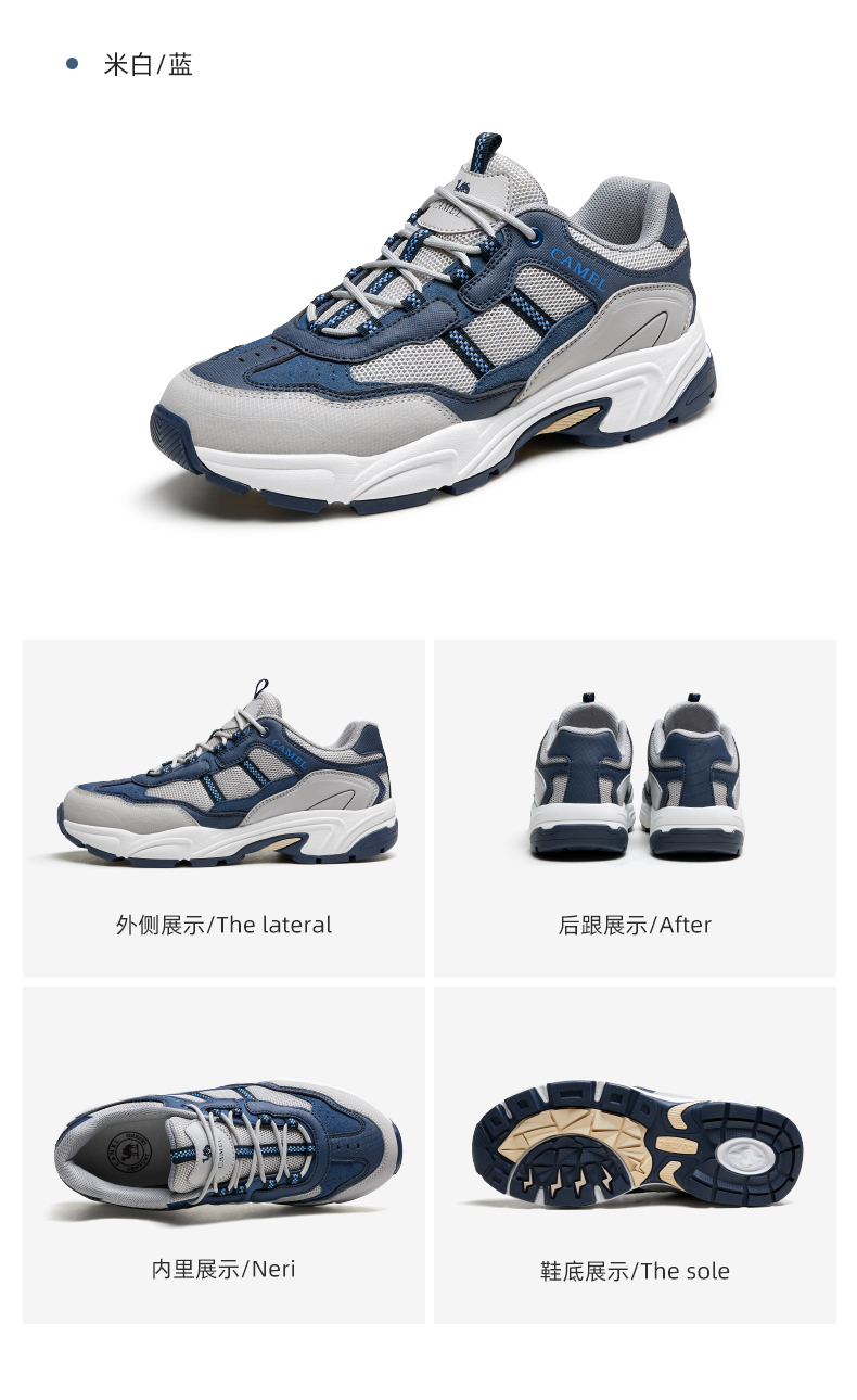 这款休闲运动鞋,鞋面采用皮革革+织物复合材质,复古拼接舒适包裹,富有层次感,兼具防护力与透气于一体,结合透气软弹鞋垫,久穿干爽不闷热。轻质防滑大底搭配立体底纹,具有优秀的抓地力,防滑耐磨,4cm后跟,拉长腿部线条更显高,日常休闲、运动都适合。