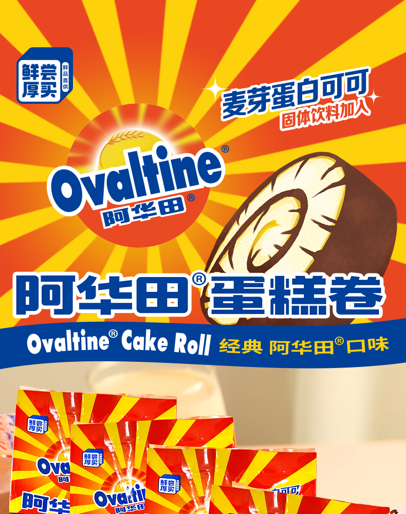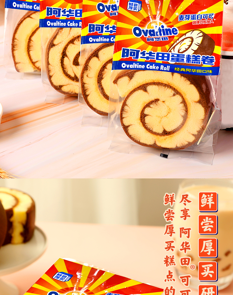 阿华田新品的蛋糕卷,精选优质小麦粉和新鲜土鸡蛋,搭配香醇乳粉和经典麦芽蛋白阿华田可可粉,新鲜制作,具有丝滑细腻的口感,单个便携独立包装,食用方便,很不错的小零食。