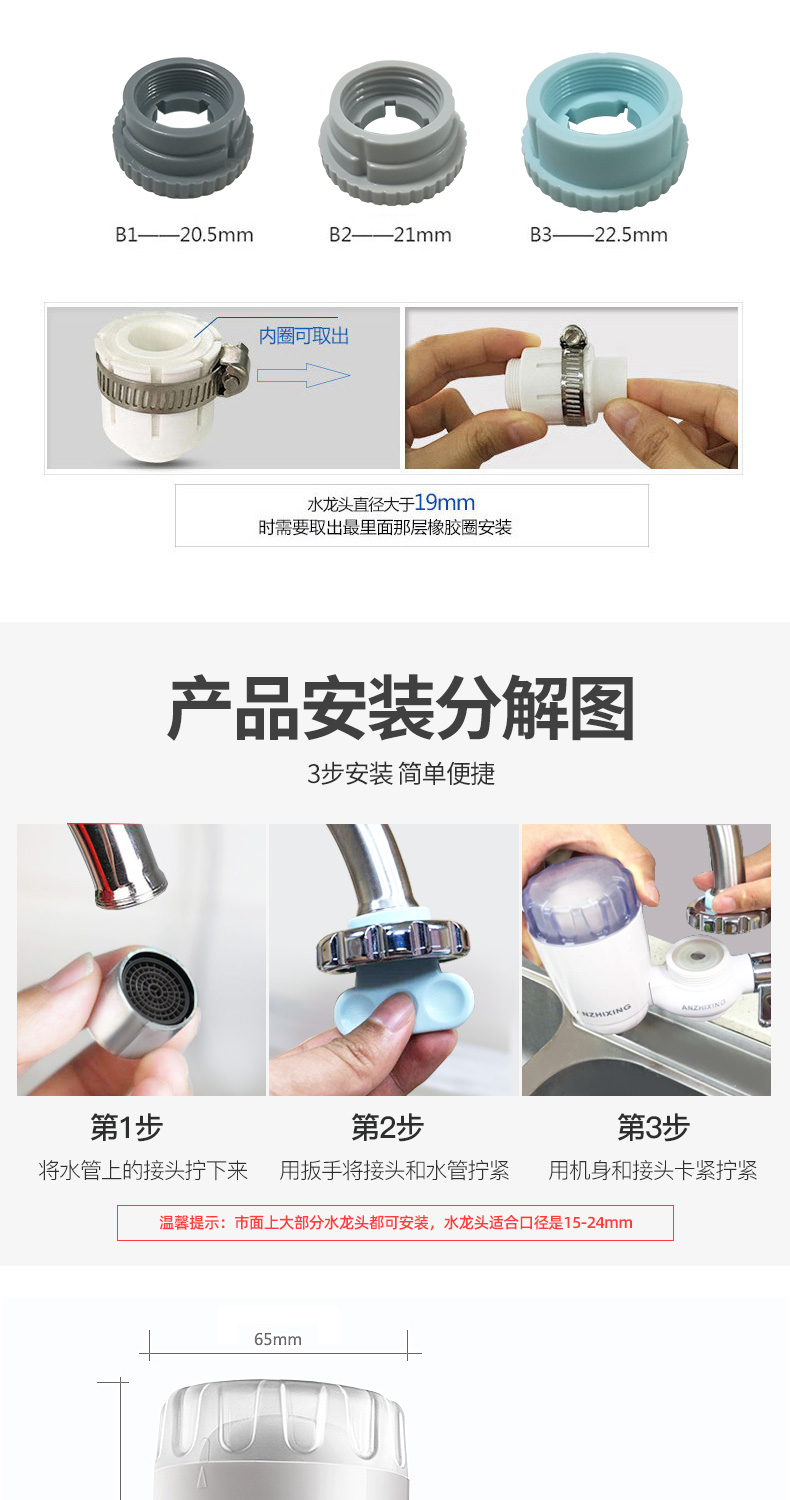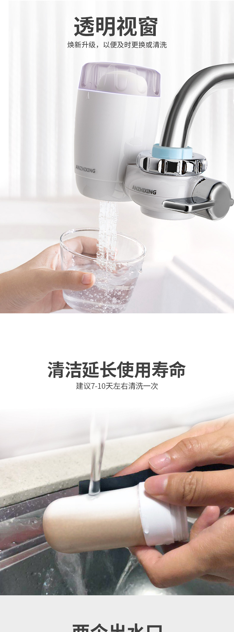 过滤精度可达到 0.1微米,有效滤除自来水中的泥沙、铁锈、胶体、余氯、异味等有害物质;带有可拆卸设计,滤芯表面脏污情况严重的话可以拿出用砂纸打磨,之后依然可以继续使用。