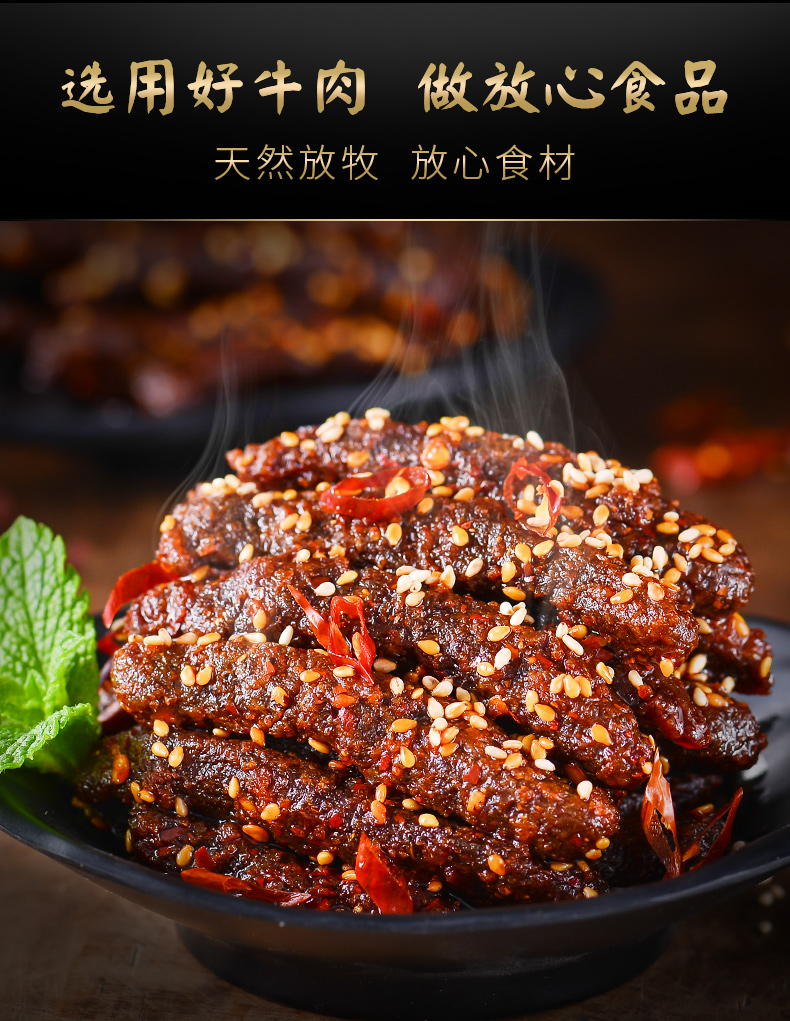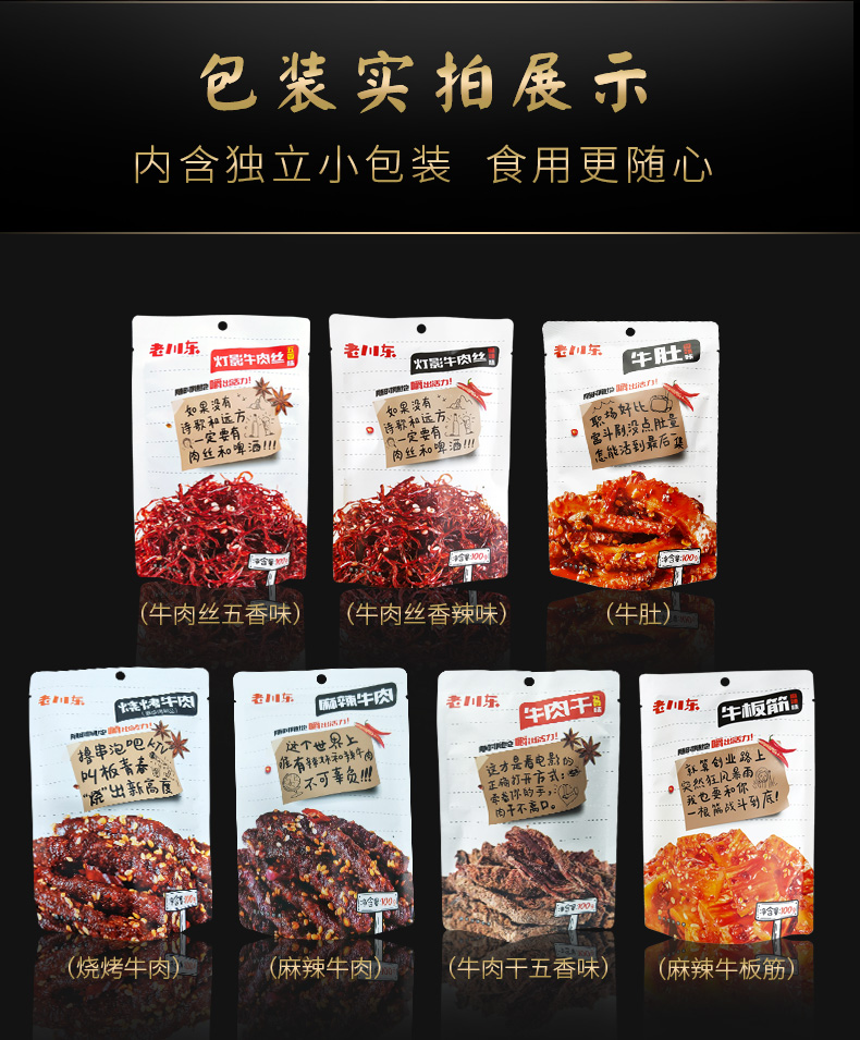 有麻辣牛肉、烧烤牛肉、麻辣牛板筋、麻辣牛肉丝、五香牛肉丝、麻辣猪肉脯6种口味任选。精选优质牛肉,肉质紧实有嚼劲,地道川味,麻辣鲜香,好吃的停不下来!