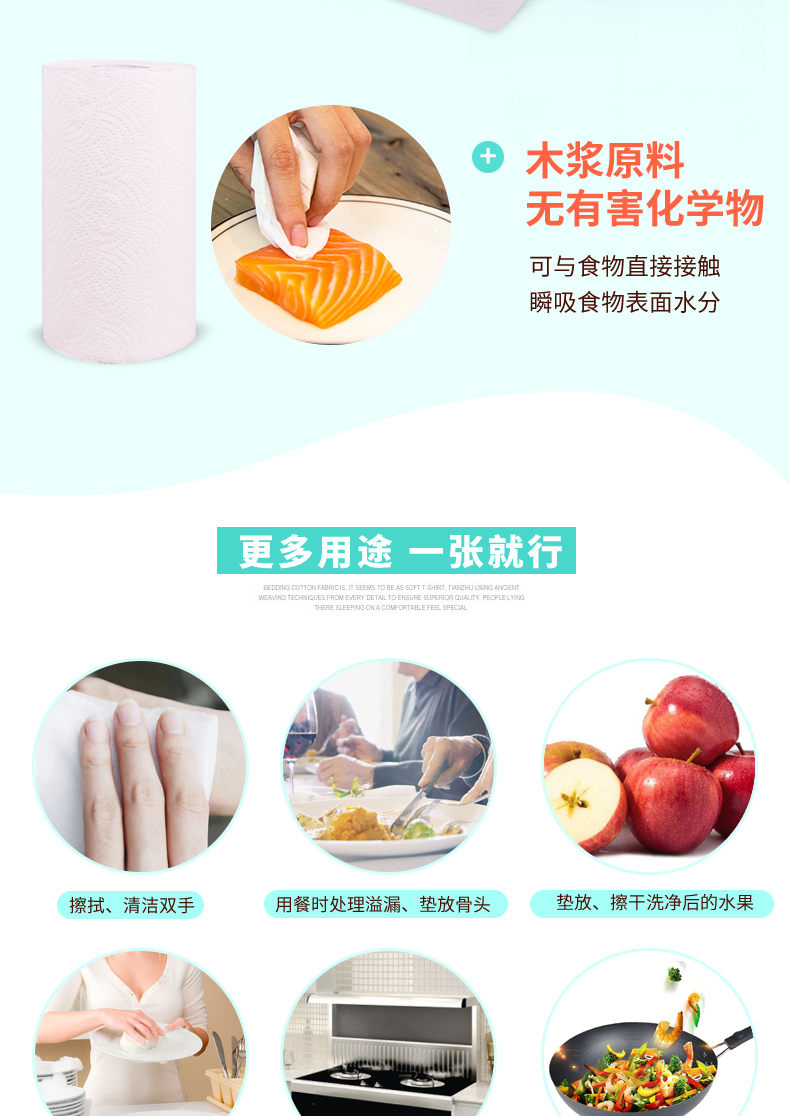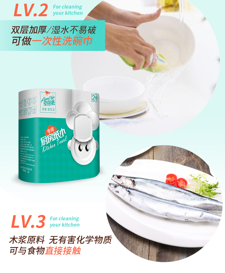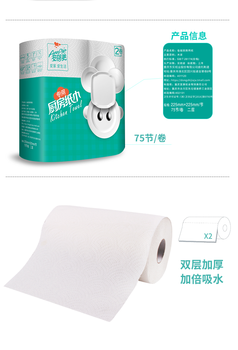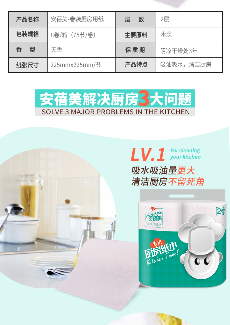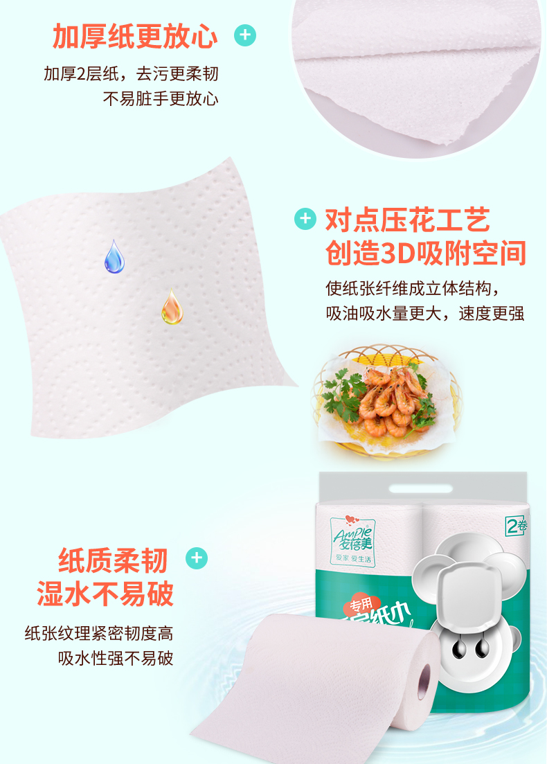 安蓓美厨房用纸,木浆原料,双层加厚,吸水吸油量更大,湿水不易破;替代传统抹布,可用于清洁油污/餐具炊具/擦干果蔬,厨房必备小神器!规格:225型大尺寸 8卷独立装。