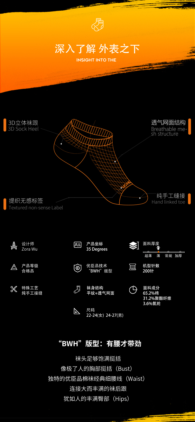 这款袜子面料以65.2%棉为主,混31.2%聚酯纤维,在添加了3.6%氨纶,经过过特殊处理,触感柔软亲肤,拒绝刺痒,抗菌环保健康,袜底无感提织LOGO,高端大气上档次,不影响穿着舒适度。有四大系列:抗菌止痒系列,VC润足系列,天然香薰系列,抑汗吸排系列。采用环保染色更安心~