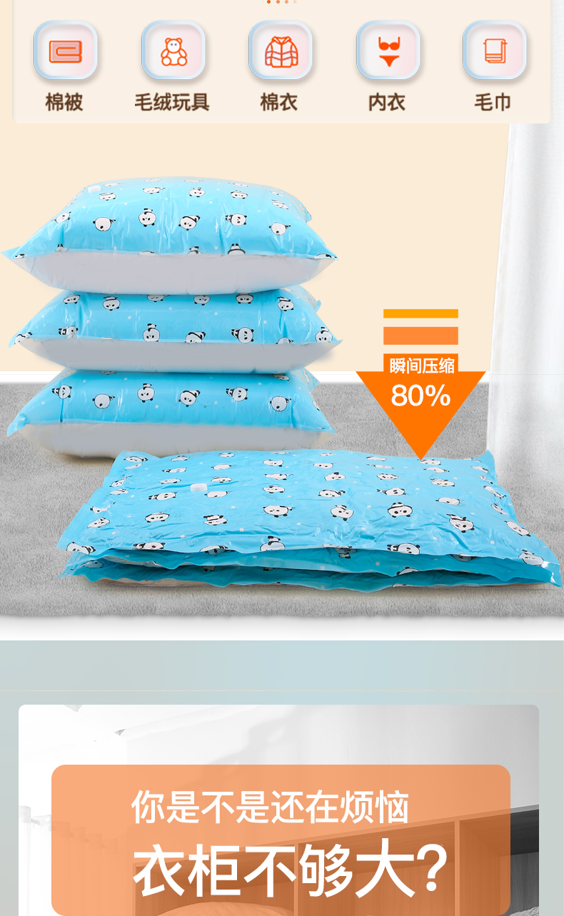 天猫贝易纳旗舰店29.9元,可领10元优惠券,实付19.9元到手,第一款这个价格。包含:大号100*70cm*2、中小号70*50cm*3、手卷50*35cm*3、手泵*1。此外还有多种套餐可选,略有差价。专业家居收纳整理,打造高品质生活。优质的PAPE材质健康环保,防潮防霉,防菌防尘,轻松解决各种收纳问题。