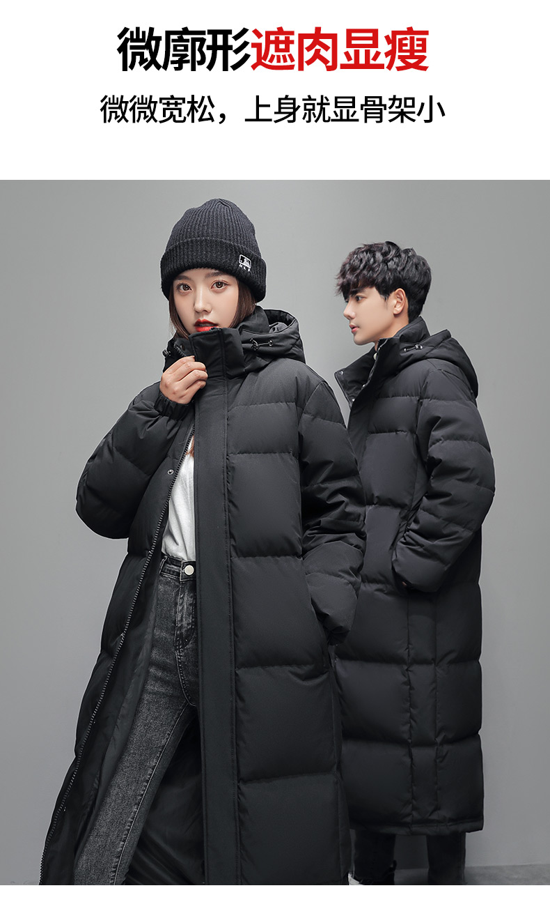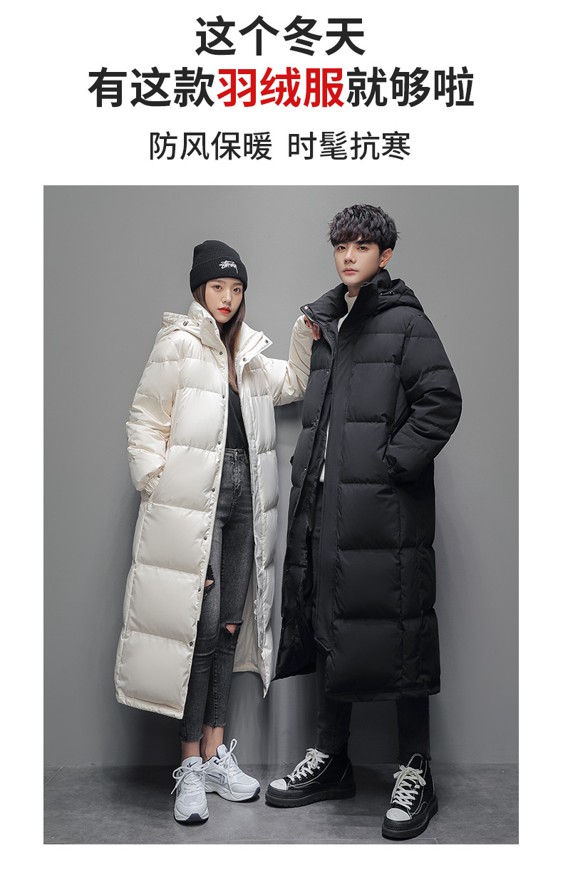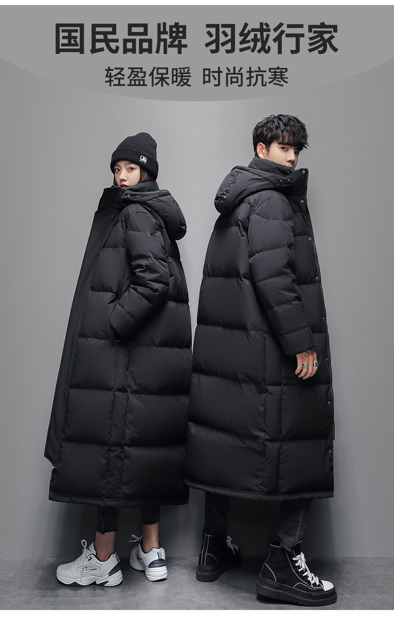 这款鸭鸭 冬季加长版加厚过膝情侣羽绒服 ,高品质防风抗皱面料,保暖防风防钻绒,90%优质鸭绒填充,无异味,干爽透气,不闷汗;立领连帽设计,简洁大方,防风保暖;微廓形,遮肉显瘦,微微宽松,上身就显骨架小;隐形拉链口袋设计,美观实用。