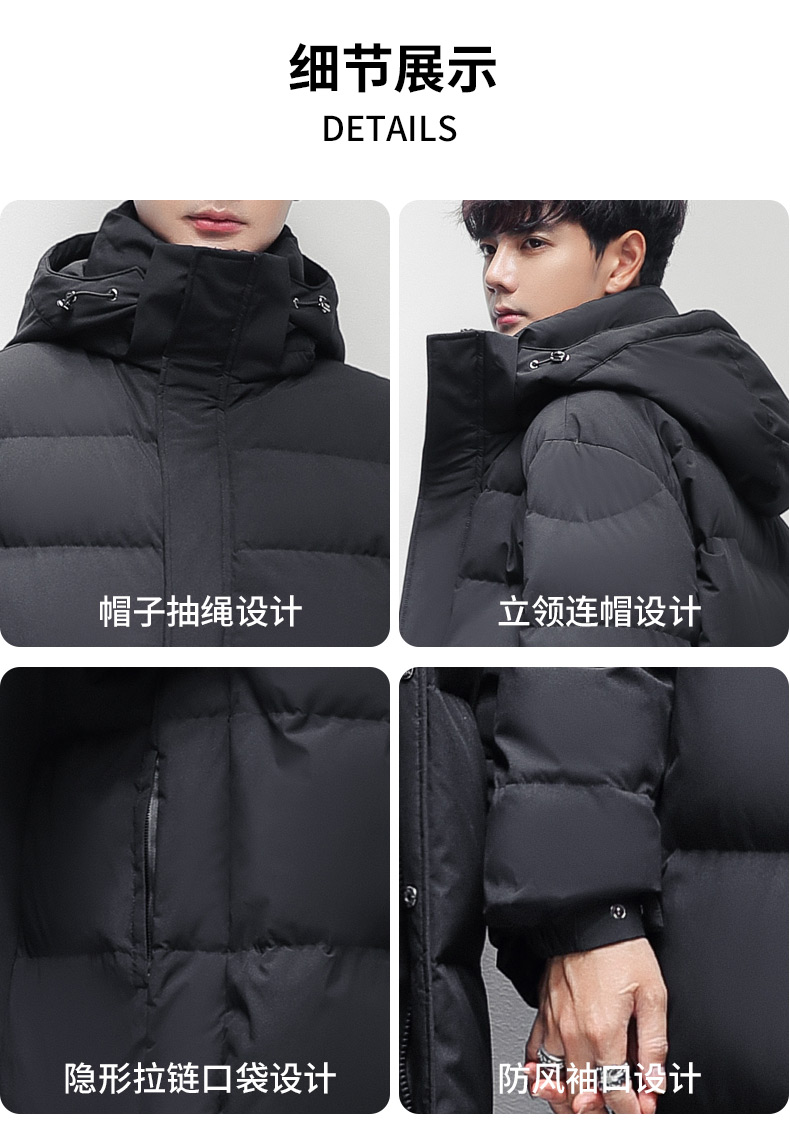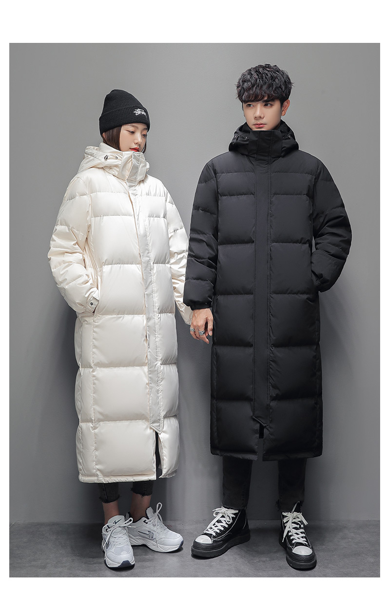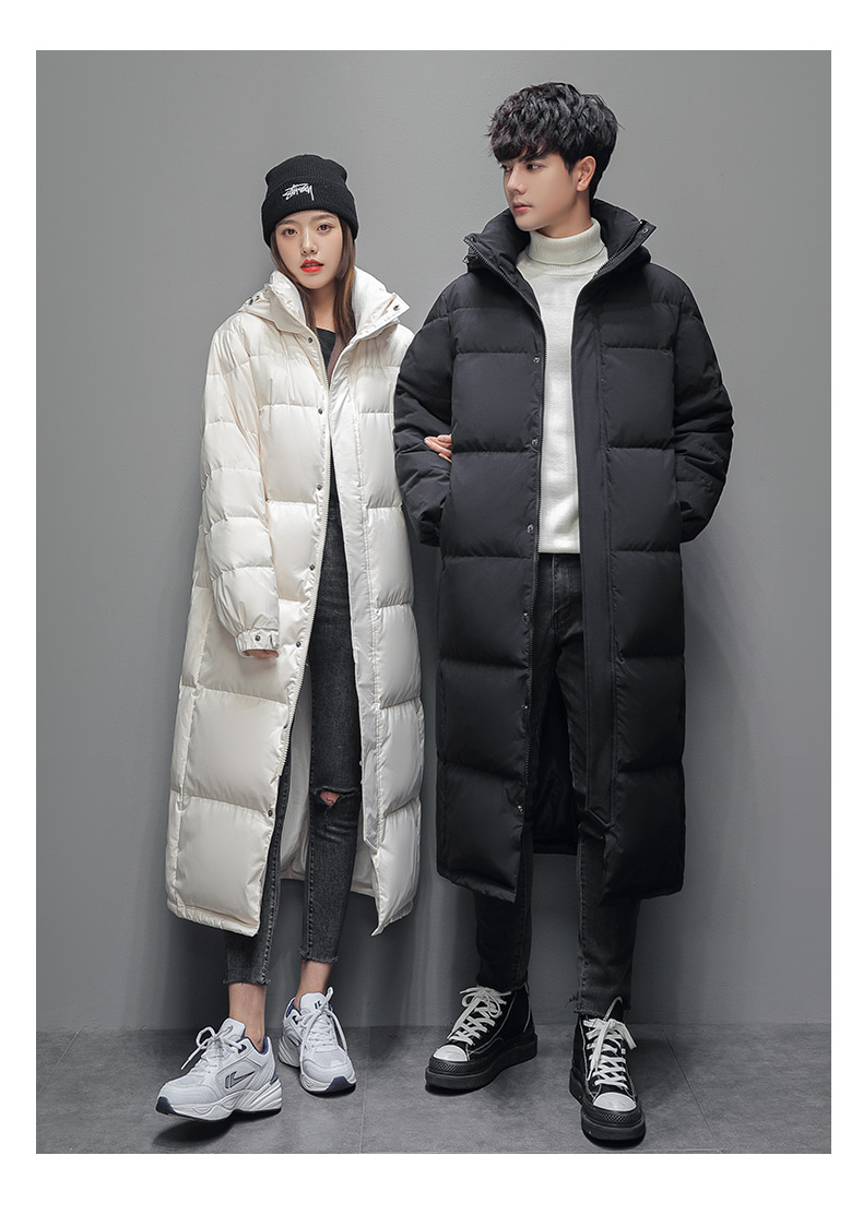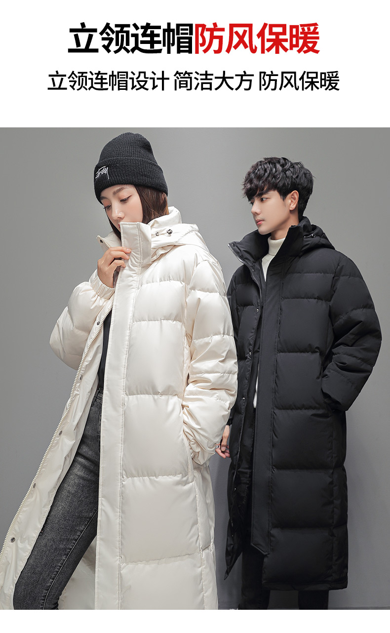 这款鸭鸭 冬季加长版加厚过膝情侣羽绒服 ,高品质防风抗皱面料,保暖防风防钻绒,90%优质鸭绒填充,无异味,干爽透气,不闷汗;立领连帽设计,简洁大方,防风保暖;微廓形,遮肉显瘦,微微宽松,上身就显骨架小;隐形拉链口袋设计,美观实用。
