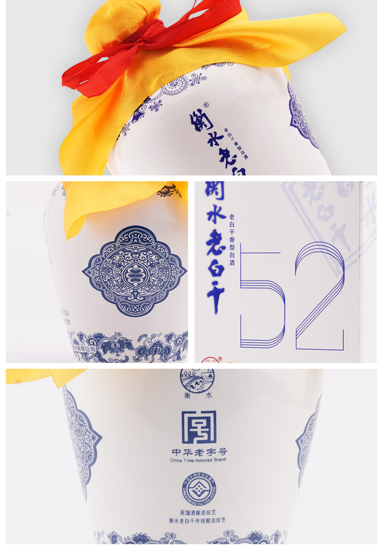 这款衡水老白干 青花52 纯粮白酒,甄选优质小麦制曲,在微生物的作用下,产生浓烈的酒香,甄选东北优质红高粱,纯粮地缸固态发酵,老五甄传统发酵工艺酿造,芳香秀雅、醇厚丰柔、甘冽爽净、回味悠长。酸脂平衡,杂醇油少,不易上头。规格:500ml*4瓶,52度