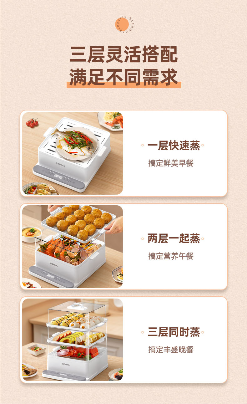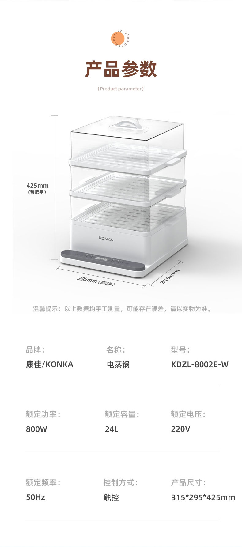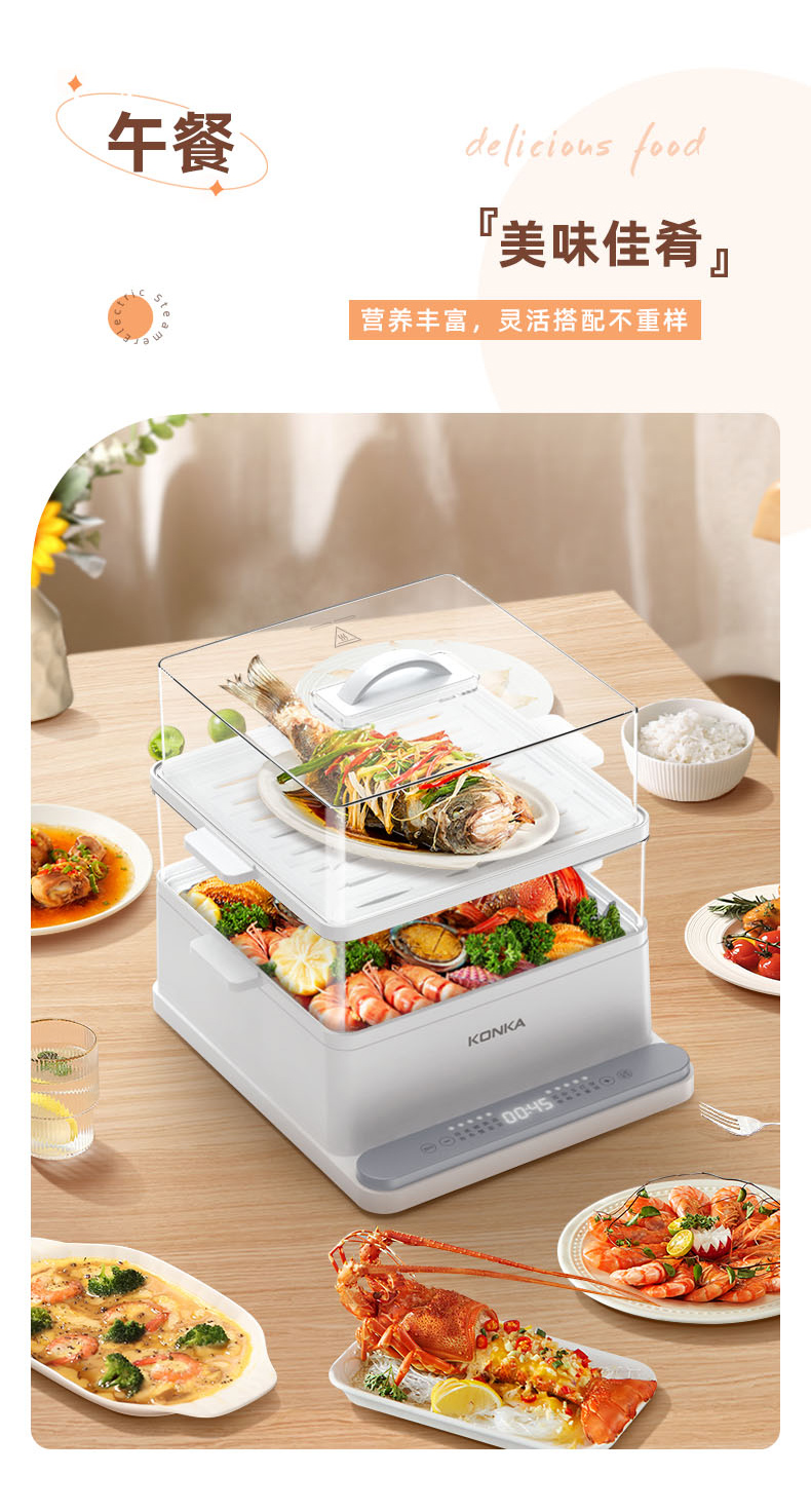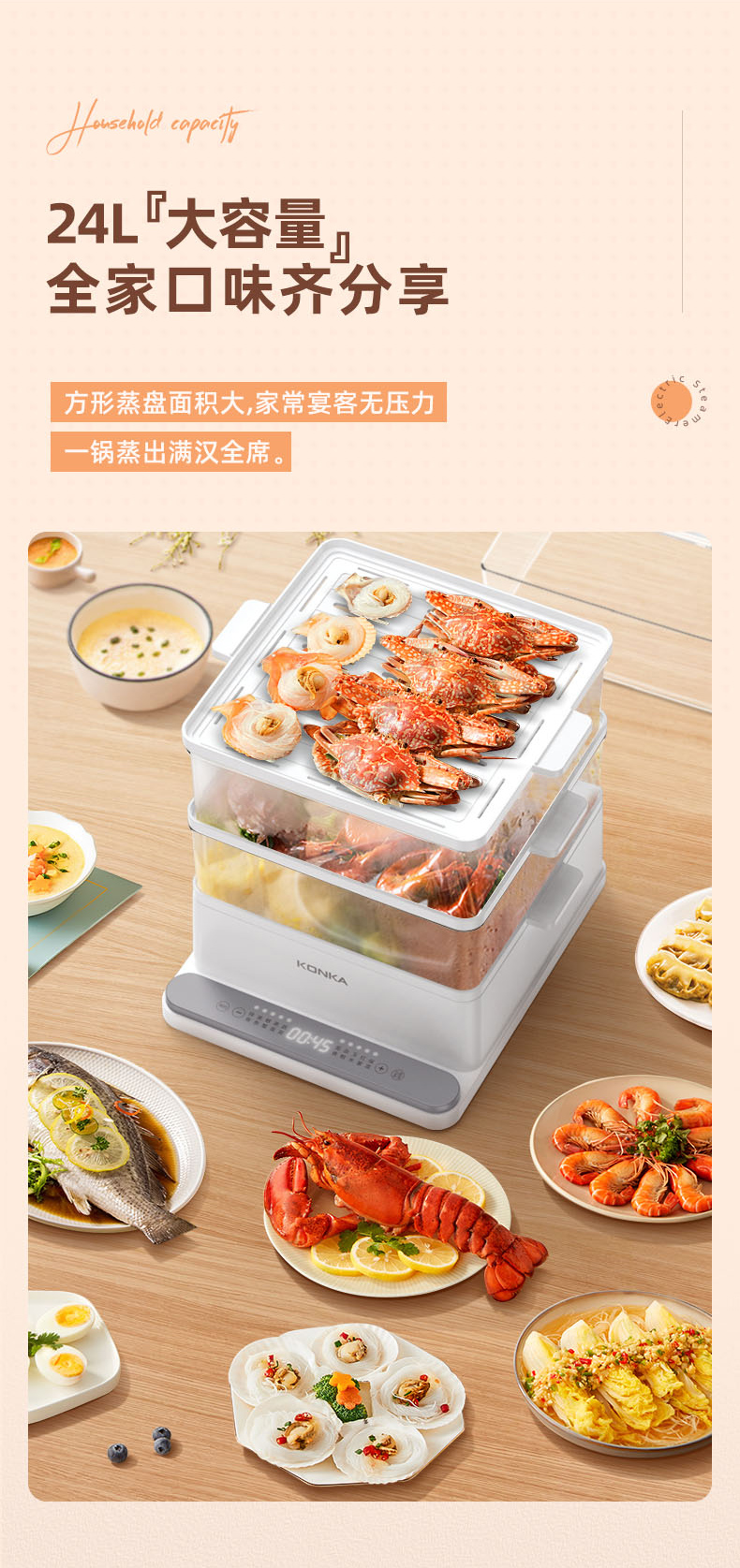 康佳 多功能电蒸锅,铝合金聚能柱设计,9秒速热,澎湃蒸汽,蒸的快熟的透,食品级PC材质,透明可视,三层蒸格24L大容量。智能控制面板,10大功能,轻松搞定一日三餐,24小时智能预约,蒸好自动保温,做早餐不再起早贪黑,轻松应对家庭聚餐!
