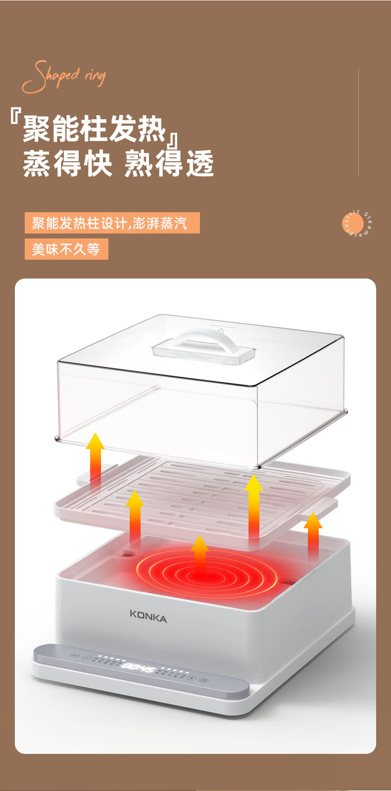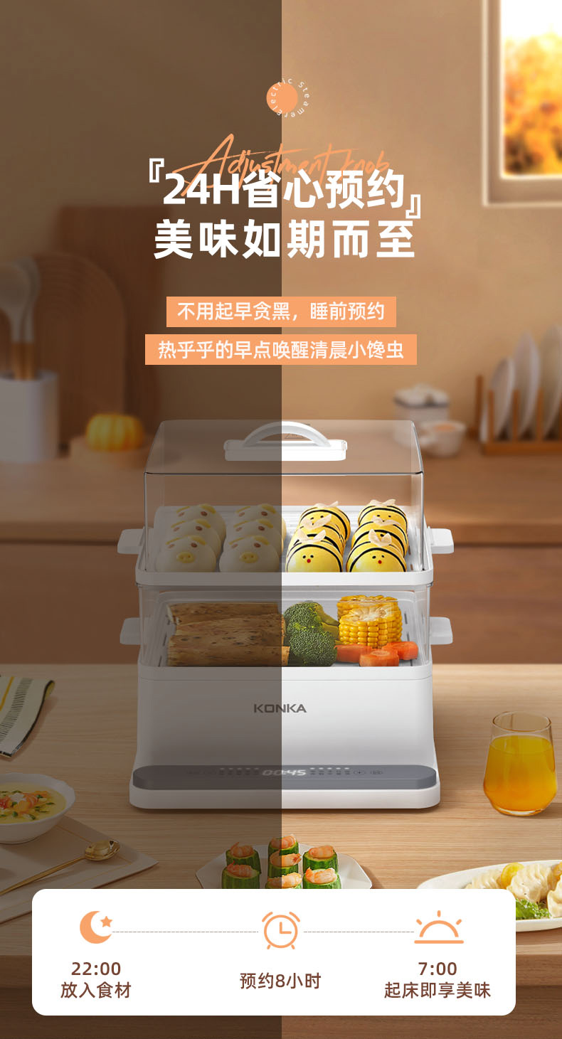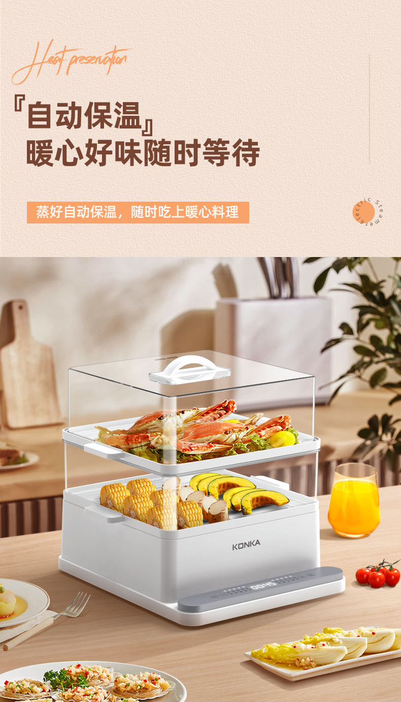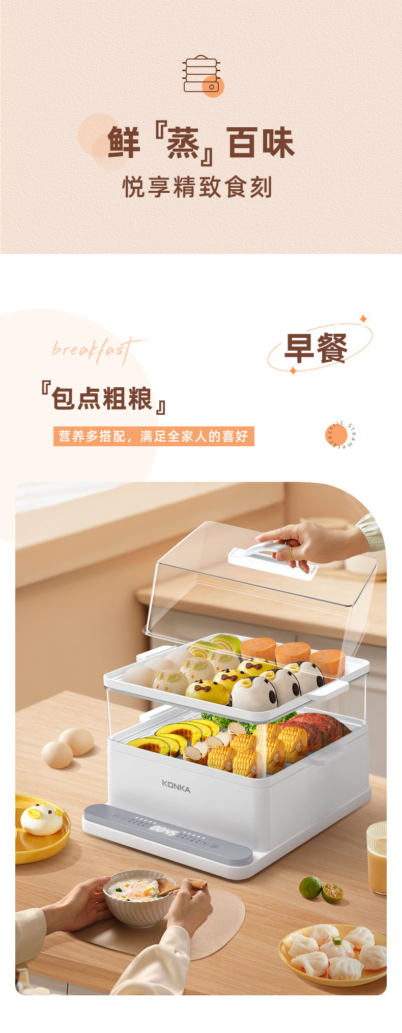 康佳 多功能电蒸锅,铝合金聚能柱设计,9秒速热,澎湃蒸汽,蒸的快熟的透,食品级PC材质,透明可视,三层蒸格24L大容量。智能控制面板,10大功能,轻松搞定一日三餐,24小时智能预约,蒸好自动保温,做早餐不再起早贪黑,轻松应对家庭聚餐!