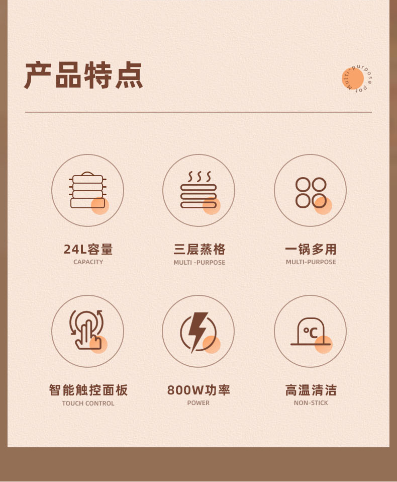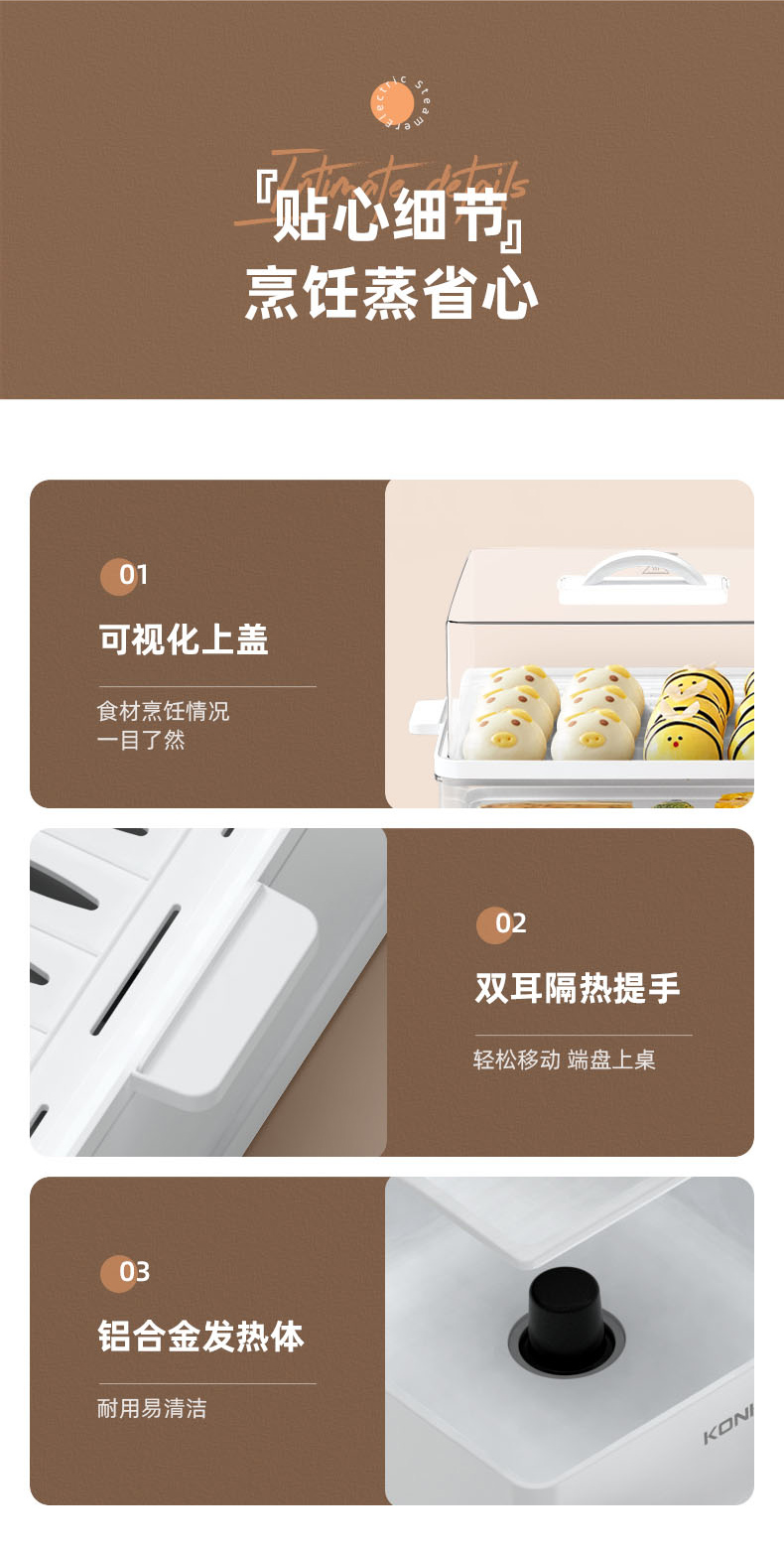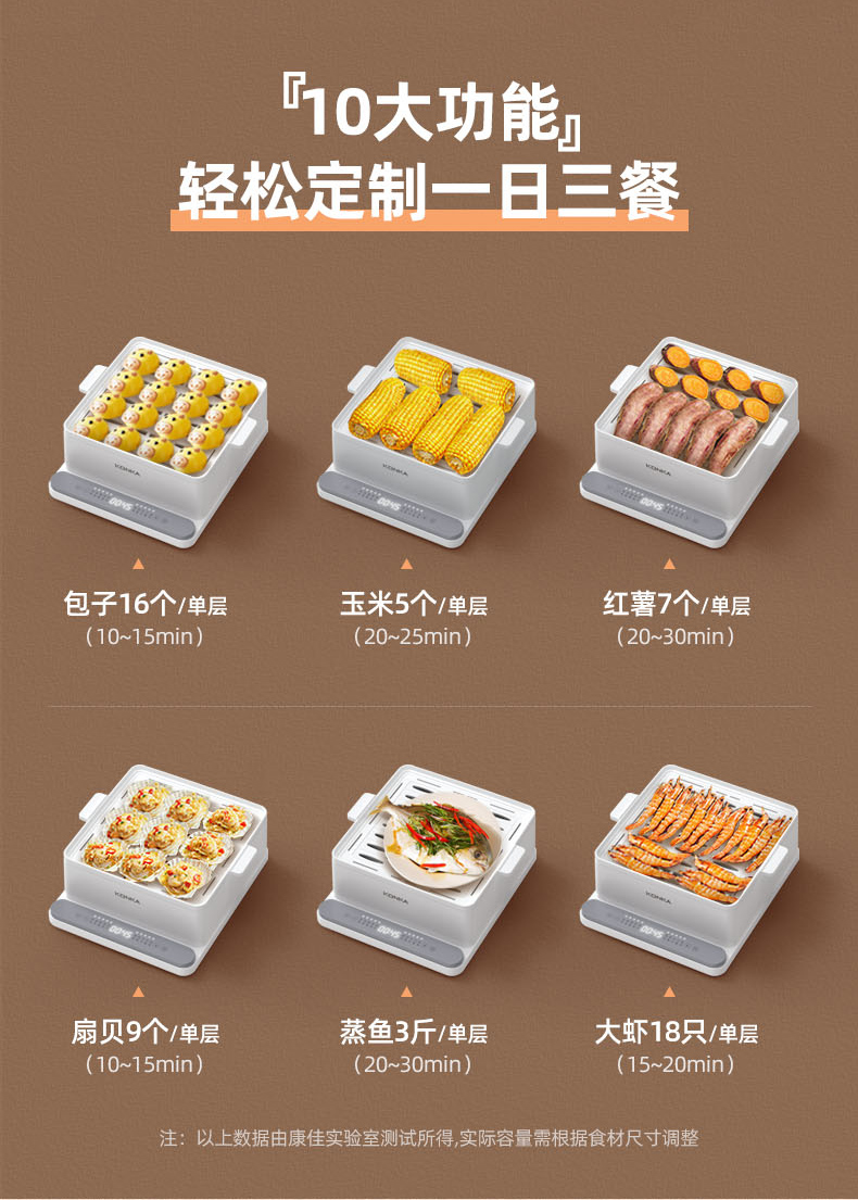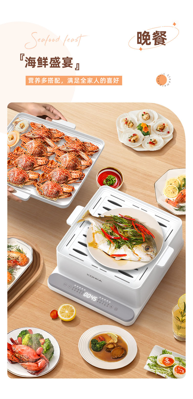 康佳 多功能电蒸锅,铝合金聚能柱设计,9秒速热,澎湃蒸汽,蒸的快熟的透,食品级PC材质,透明可视,三层蒸格24L大容量。智能控制面板,10大功能,轻松搞定一日三餐,24小时智能预约,蒸好自动保温,做早餐不再起早贪黑,轻松应对家庭聚餐!