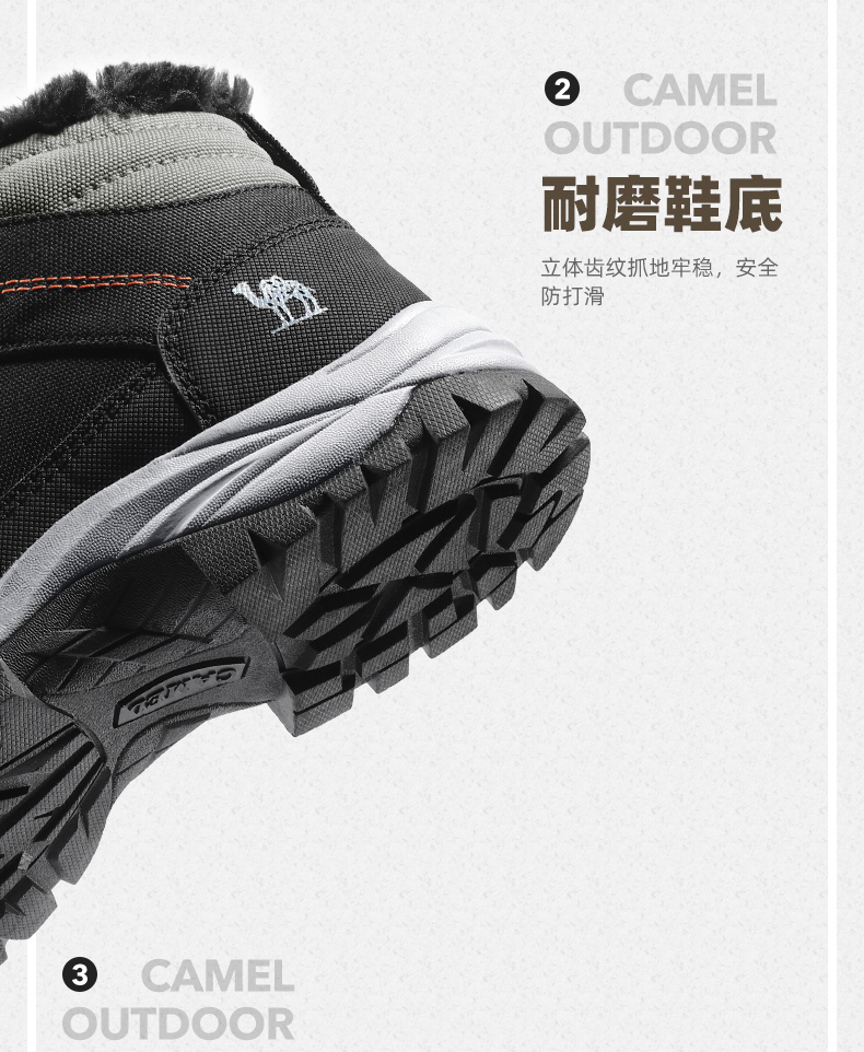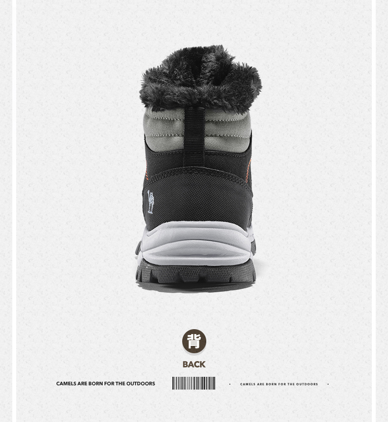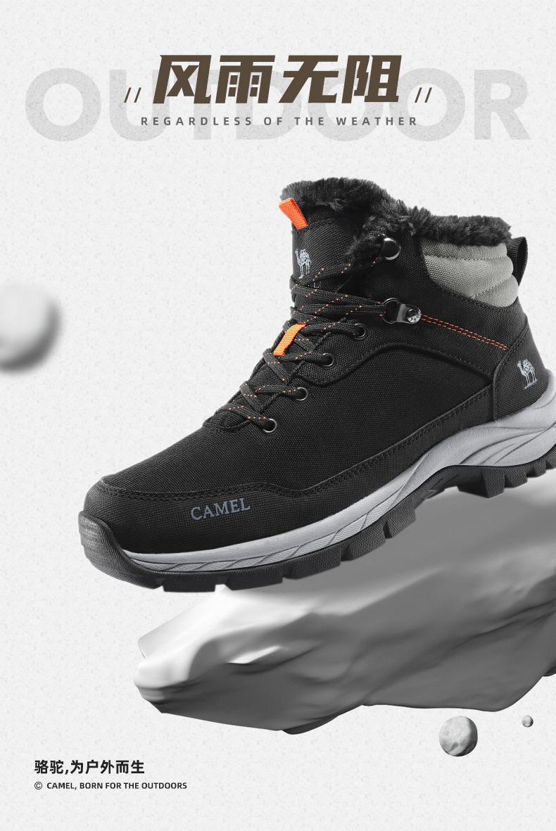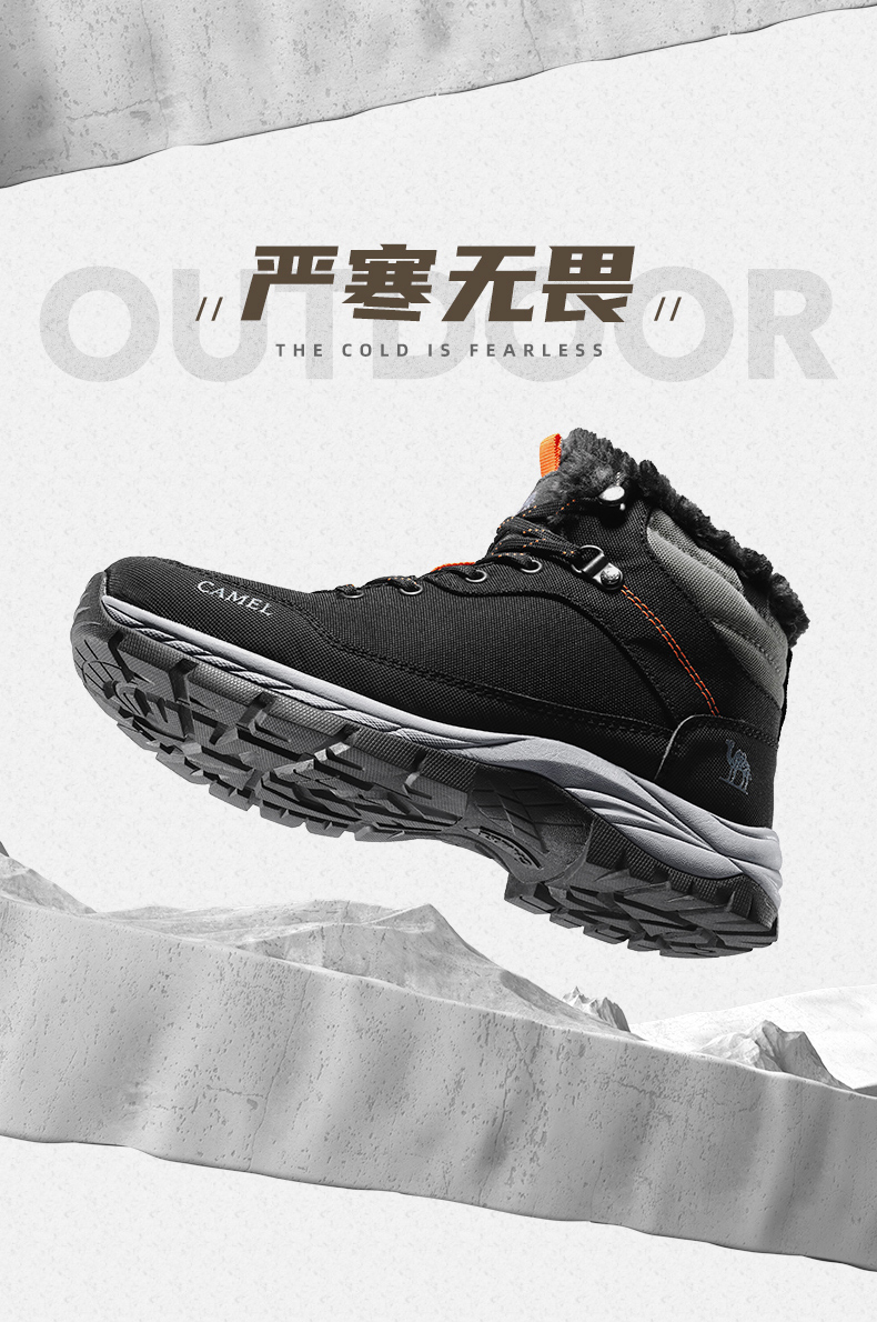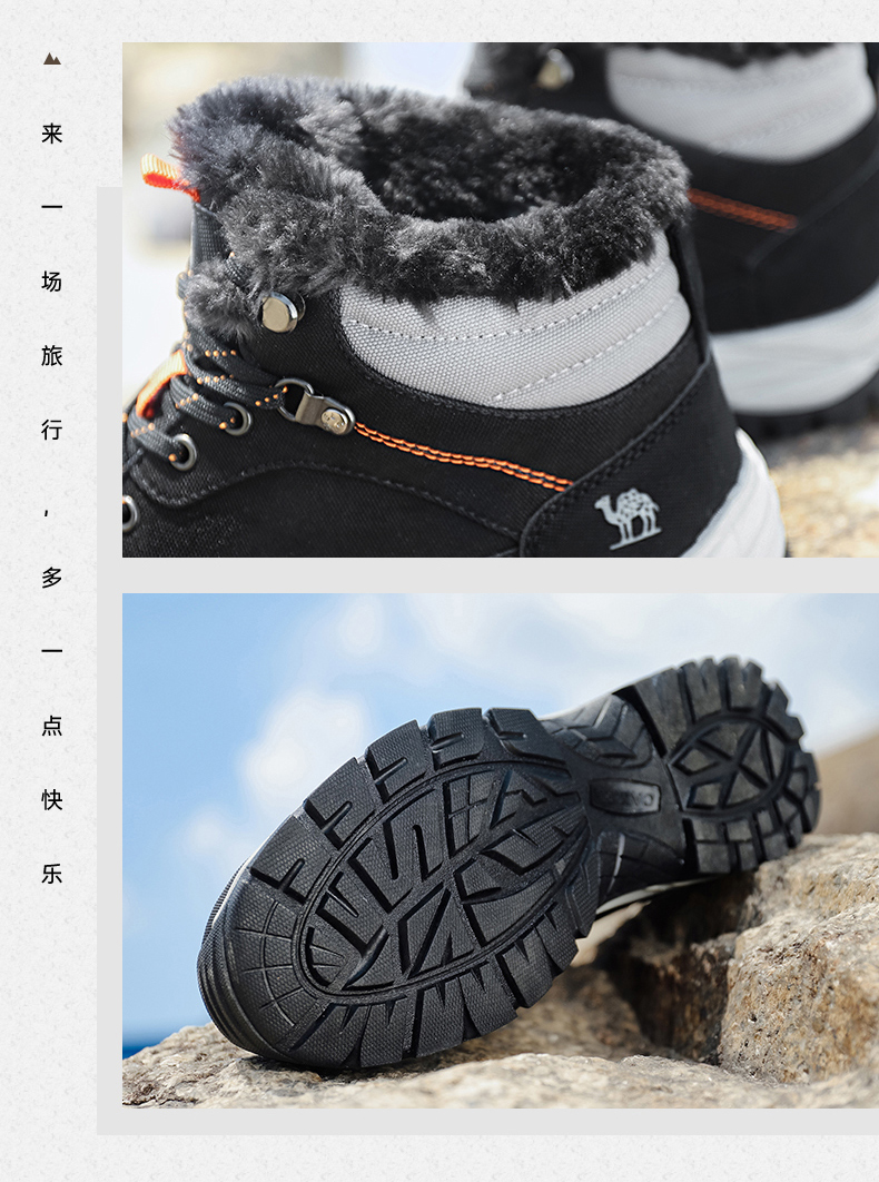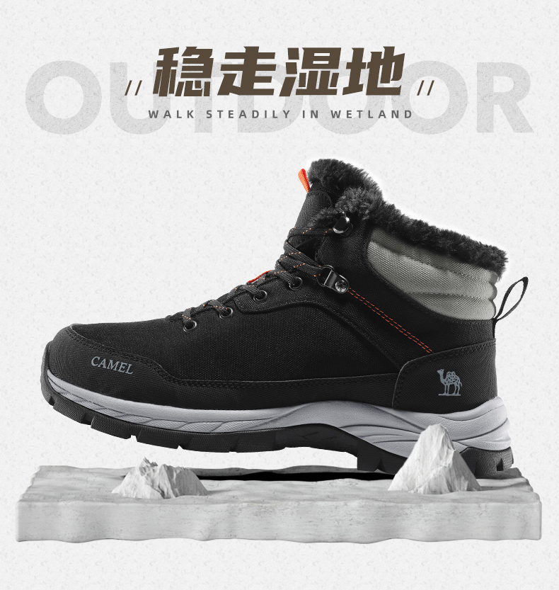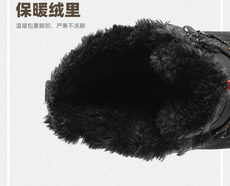 鞋面经拒水防泼处理,遇水不易沾湿,穿着干爽舒适,另有舒适绒毛内里,亲肤不刺激,舒适保暖,轻松抵御严寒天气,MD+RB组合大底,质地轻盈,搭配创意立体止滑颗粒,提升抓地性能,轻松应对崎岖路面。