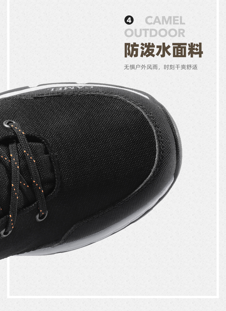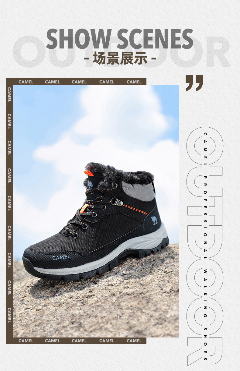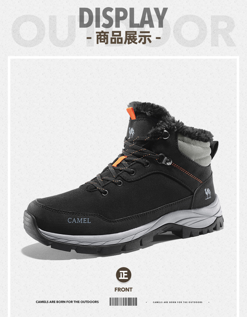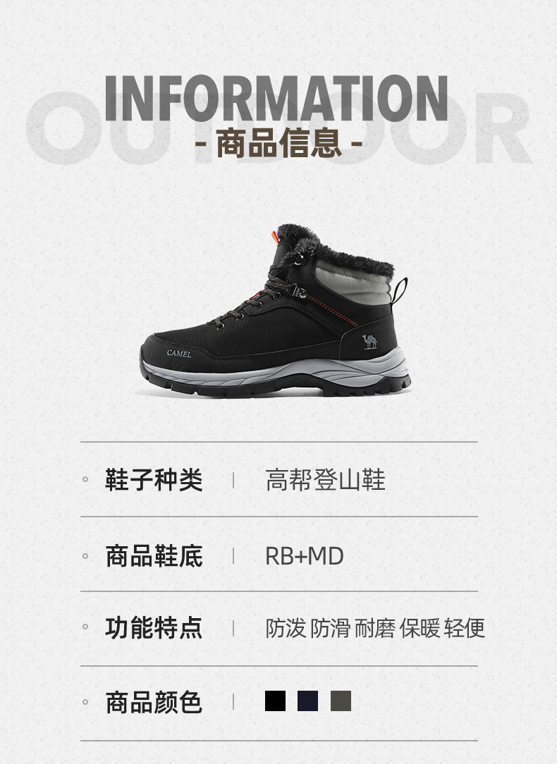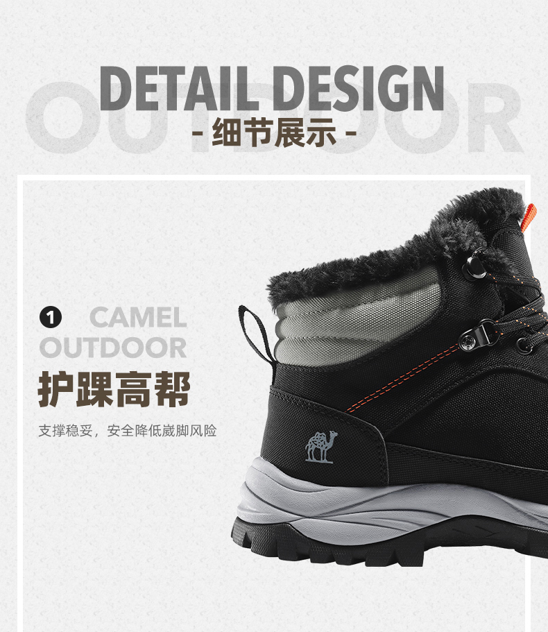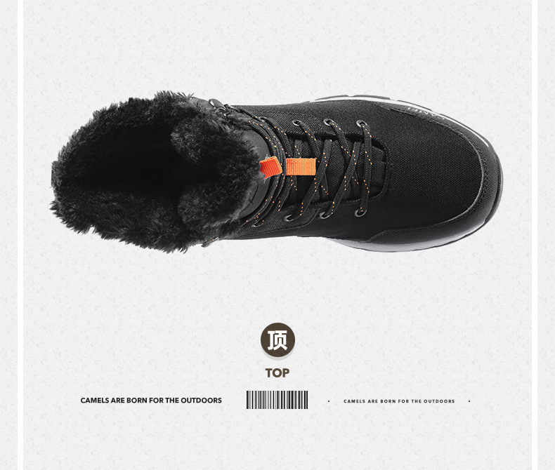 鞋面经拒水防泼处理,遇水不易沾湿,穿着干爽舒适,另有舒适绒毛内里,亲肤不刺激,舒适保暖,轻松抵御严寒天气,MD+RB组合大底,质地轻盈,搭配创意立体止滑颗粒,提升抓地性能,轻松应对崎岖路面。