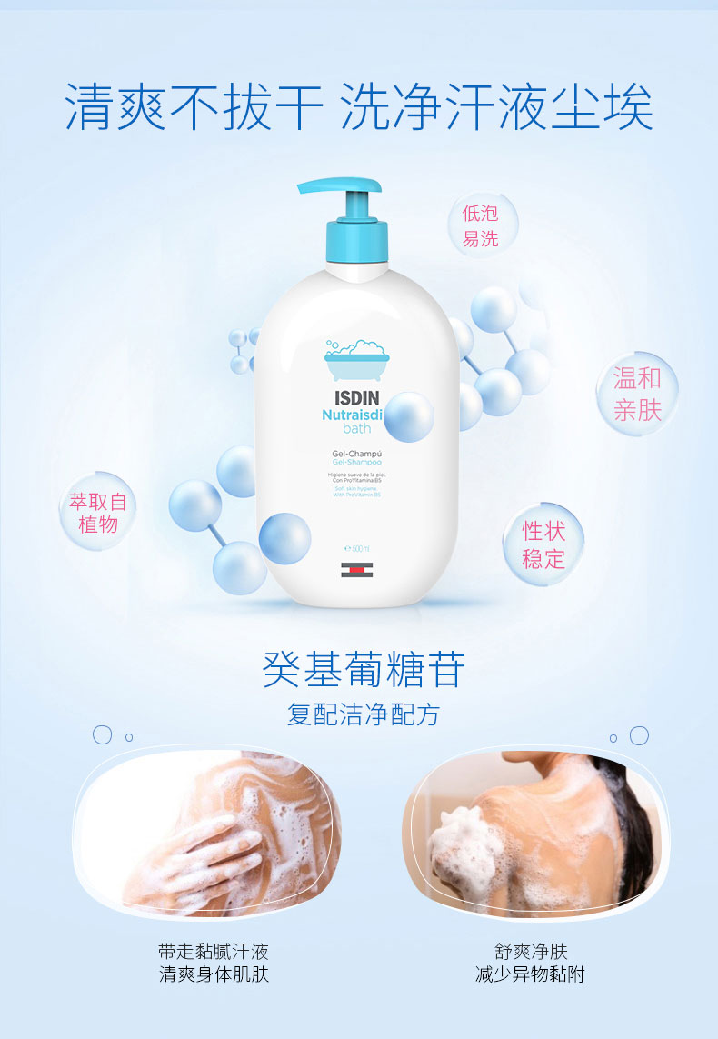 这款ISDIN 怡思丁 婴儿二合一沐浴露洗发水,专为宝宝肌、敏感肌温和护理,主打0皂基、0乳化剂、0防腐剂,科学配比,配方平衡,含有癸基葡糖苷、甘油、维他命原B5,ph值贴近肌肤,细腻亲肤不刺激,滋润修护,活性配方,温和洁净、舒缓发痒,出生婴儿也可用。低泡容易冲洗,洗后不干燥。