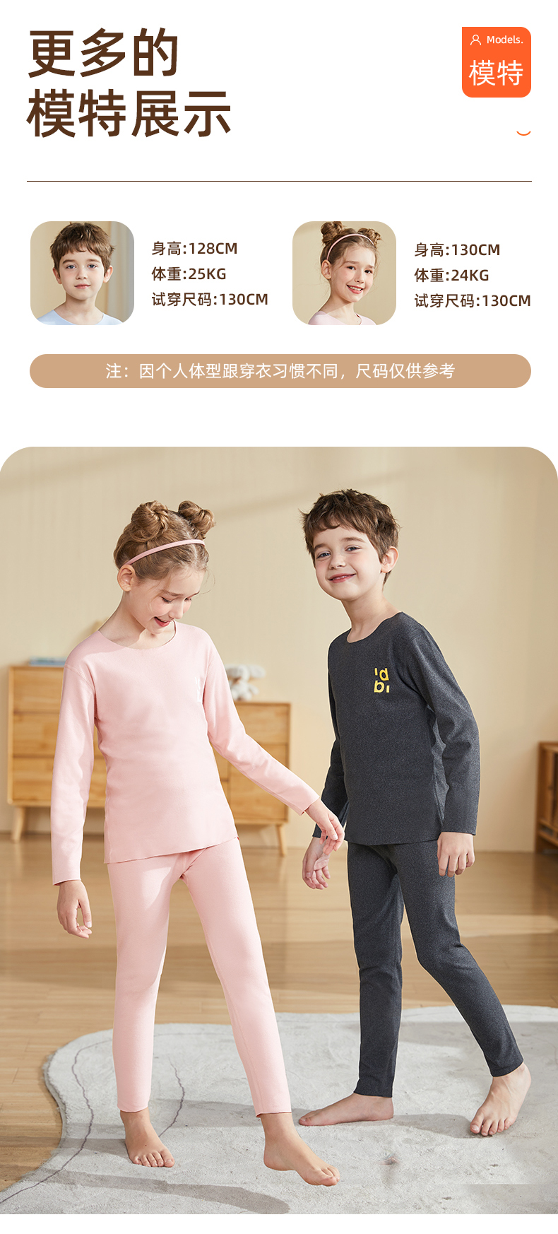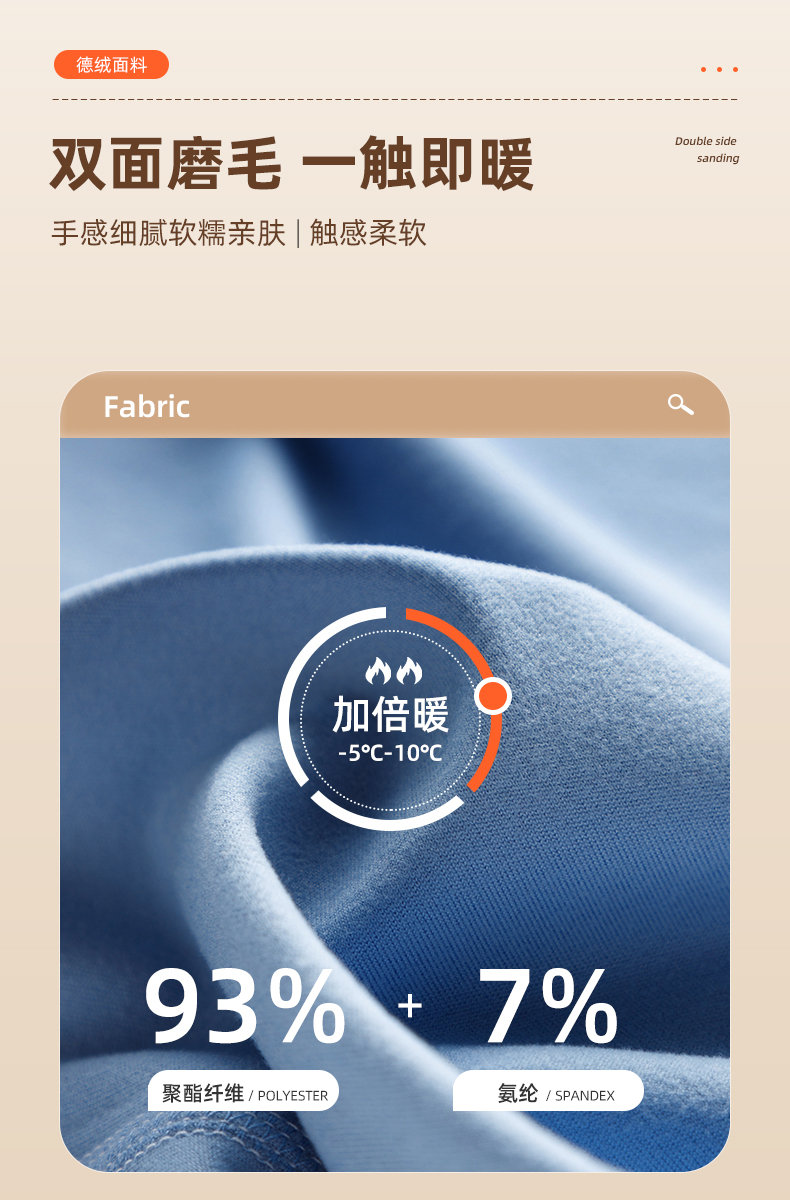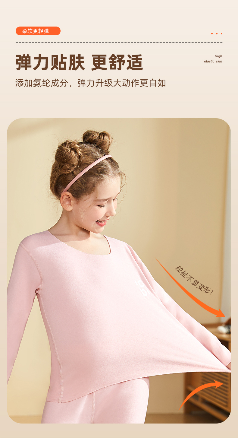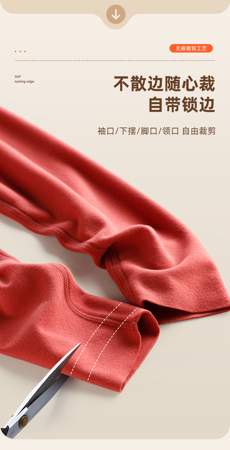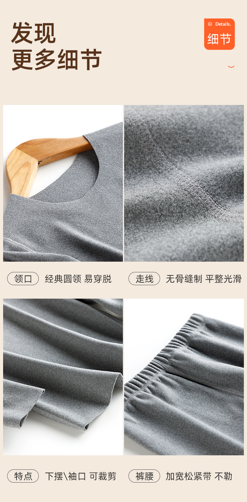 这款秋衣套装,面料成分为93%聚酯、混入7%的氨纶增加弹力,面料四面高弹,穿着贴身不易变形,双面磨绒,亲肤柔软,有优良的吸湿透气性,采用四针六线无骨缝纫,过度平滑,不磨皮肤,穿着更舒适,领口、袖口、脚口采用无痕工艺,可随意裁剪,秋冬保暖,打底无痕。