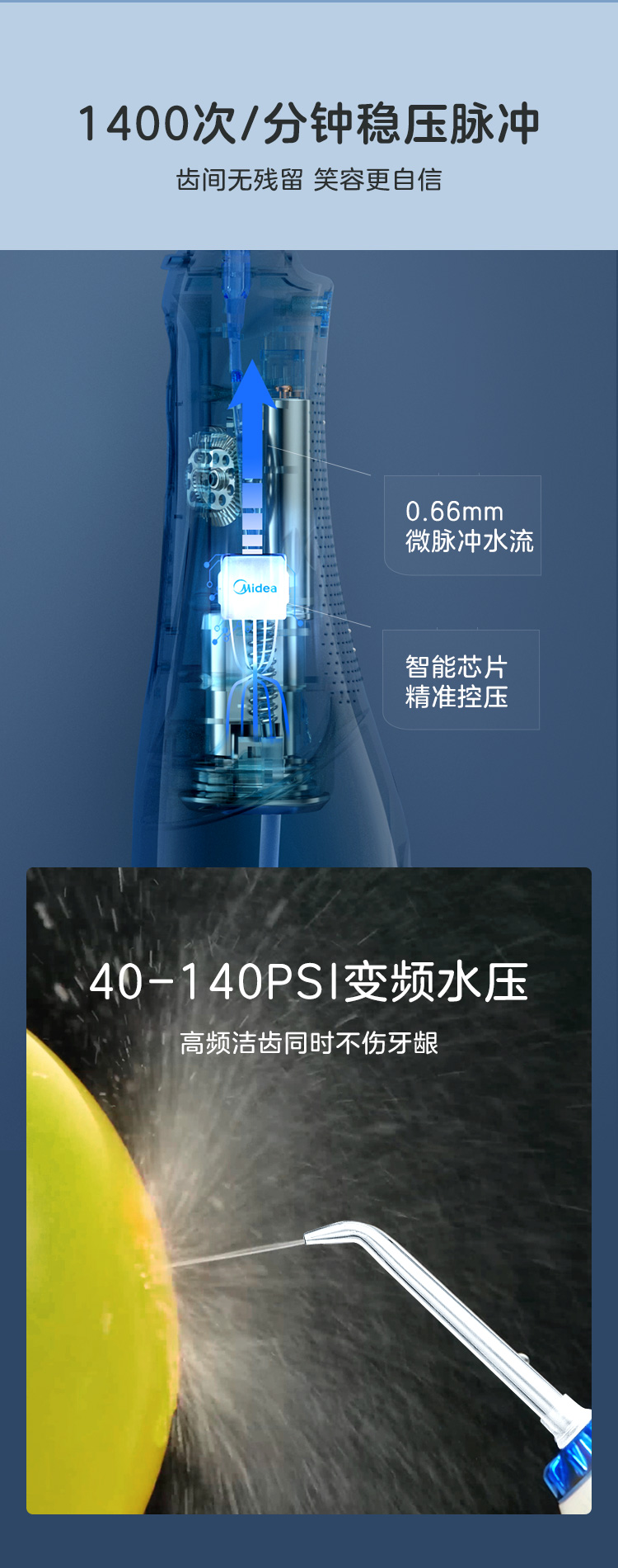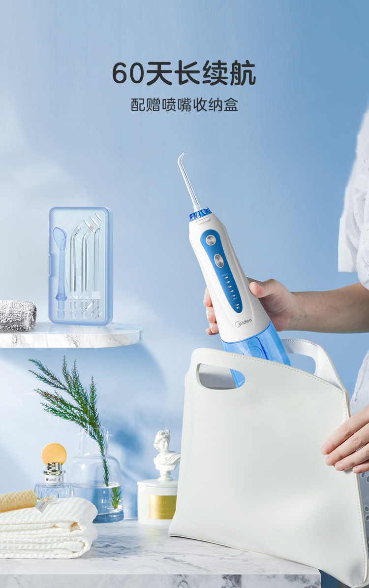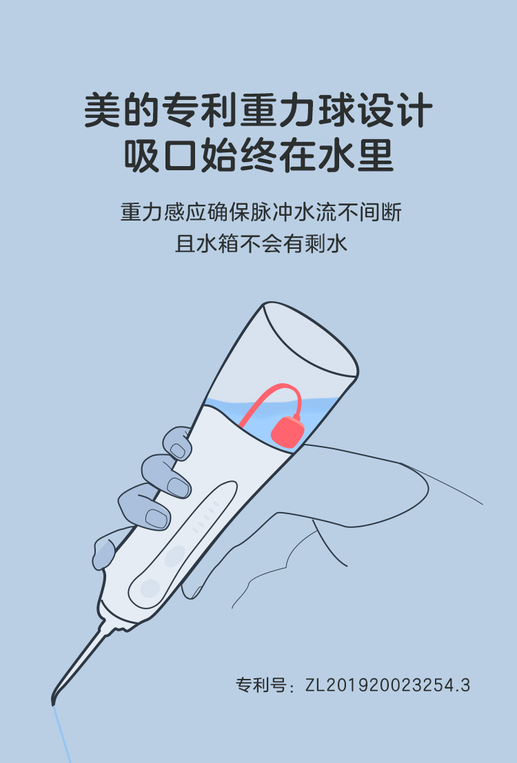 美的这款小蓝鲸 冲牙器水箱容量有240ml,比常规产品水箱容量要高出20%,接一次水就能把牙缝冲干净,不用中途再加水。独特的重力球设计,可以实现万向供水。无论你竖着拿、斜着拿还是倒着拿,都没问题。这样就便于从不同角度深入清洁口腔内侧,包括智齿、后槽牙这些位置,都不会成为清洁死角。