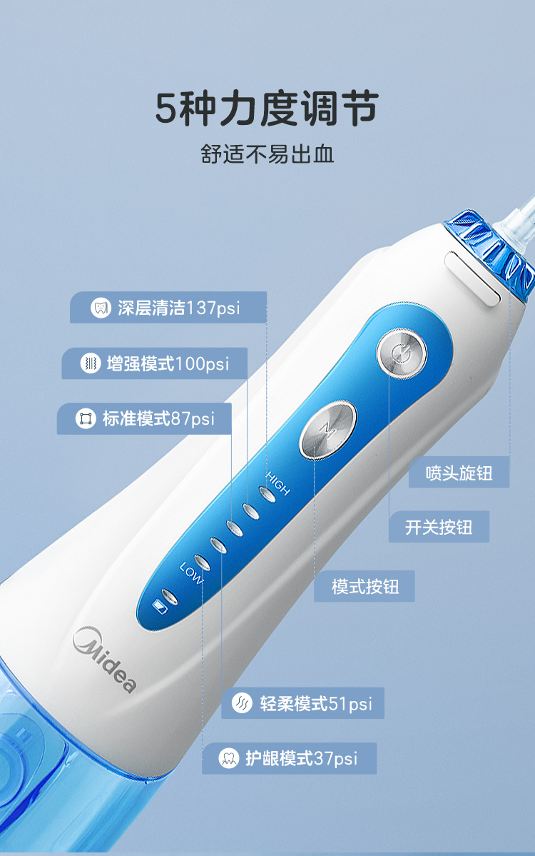 有五档清洁模式可选,如果处于牙齿容易出血的敏感时期,或者第一次使用冲牙器,建议选择低频模式。此外还搭载了按摩牙龈模式,能够缓解出血。搭配了四种可选喷嘴,牙套党可以选用正畸喷嘴,帮助餐后清洁。