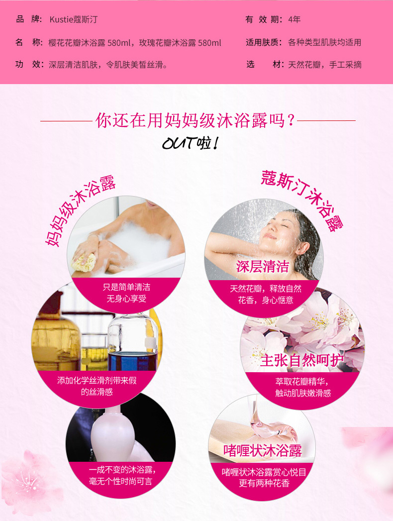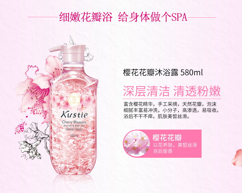 天猫kustie蔻斯汀海外旗舰店119.9元,可领77元优惠券,实付42.9元到手。这款kustie 蔻斯汀 樱花花瓣沐浴露,每1ml蕴含1片真樱花精华,配伍世界公认提亮效果的烟酰胺,东京樱花含有丰富的花青素和多种植物维生素,达到天然洗护的效果,促进皮肤深层清洁,肌肤粉粉嫩嫩。来自矢车菊的快乐因子,可以激活klotho蛋白。提升愉悦感及幸福感,从此让洗澡也成为一件快乐的事。留香特点:前调:梨、苹果、桃、杏,中调:铃兰、樱花、茉莉、粉香,后调:檀香、雪松、麝香、龙涎香。