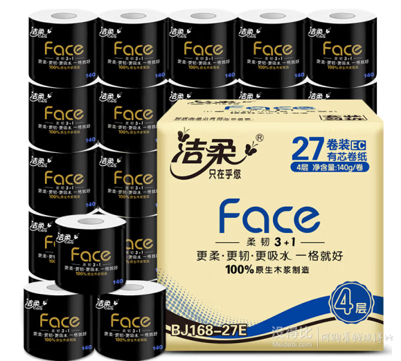 此款洁柔FACE卷纸优选原生木浆制作,质感柔软舒适,纤维细密,不易掉屑,4层加厚,吸水性超强,湿水不易破,带筒芯,可放置于滚筒式卷纸盒中,取用方便,使用时无需反复折叠,一格就可使用。规格:4层140克,101*138mm。