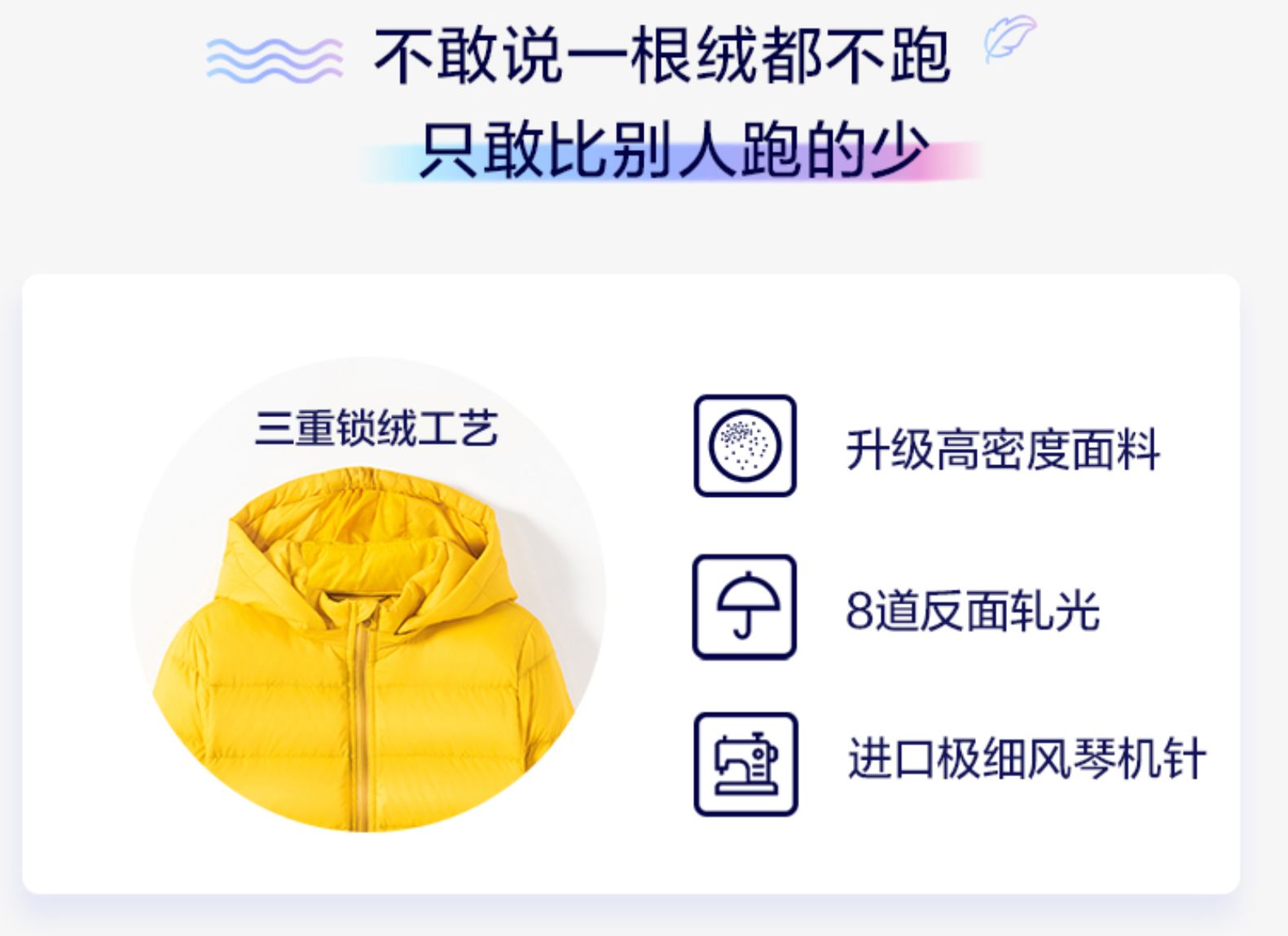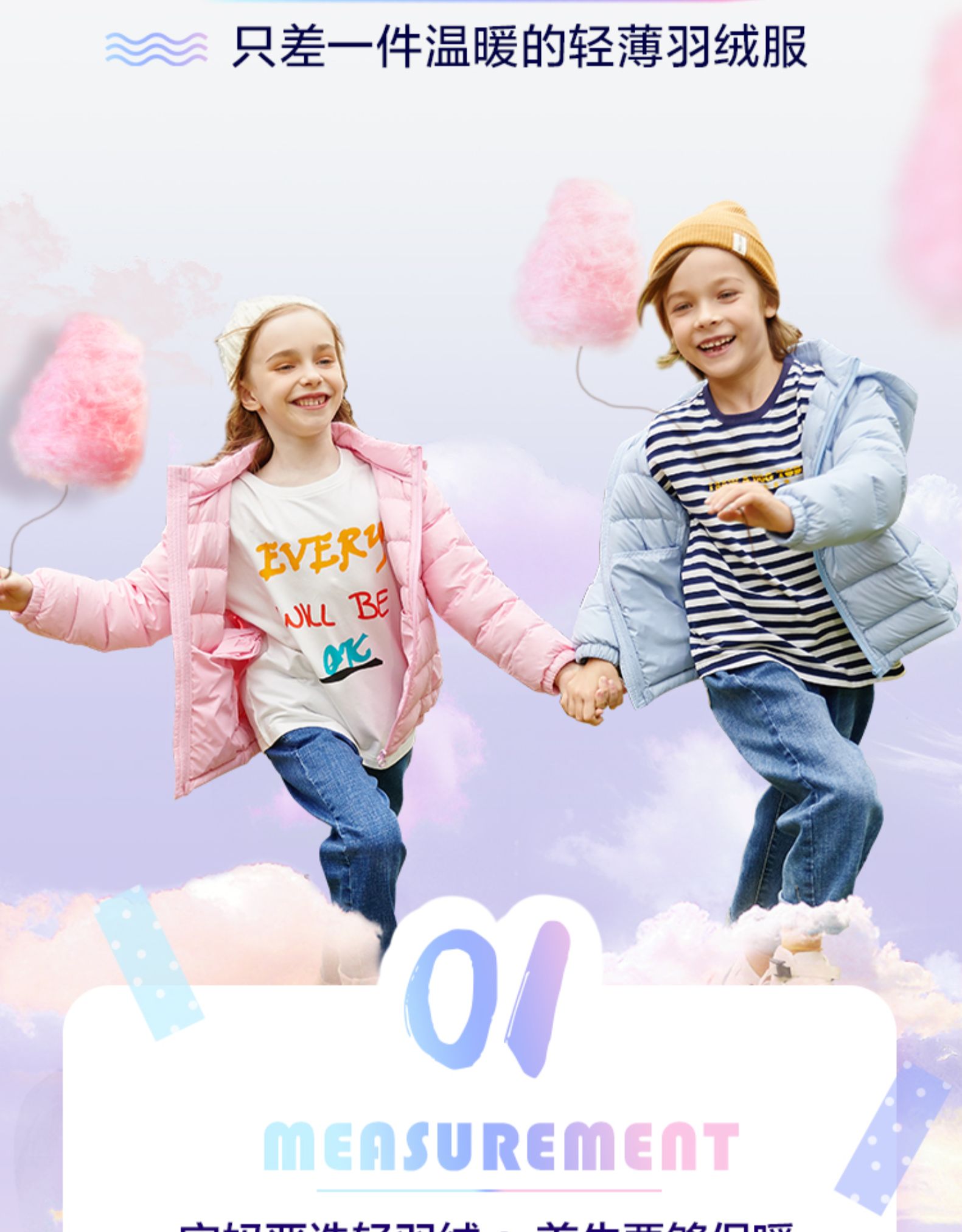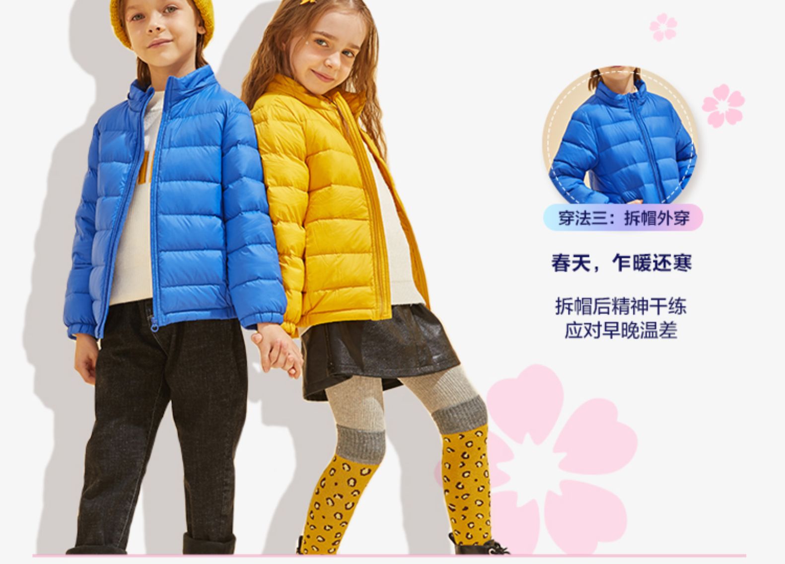 这款羽绒服主打“棉花糖”轻盈,内里填充90%白鸭绒,精选鸭腹部大绒朵羽毛,保暖效果好,轻盈不压身,小朋友没有压身束缚感,穿着更舒适。此外,羽绒经多道消毒工序处理,清洁度高,健康卫生,更为放心。