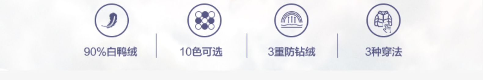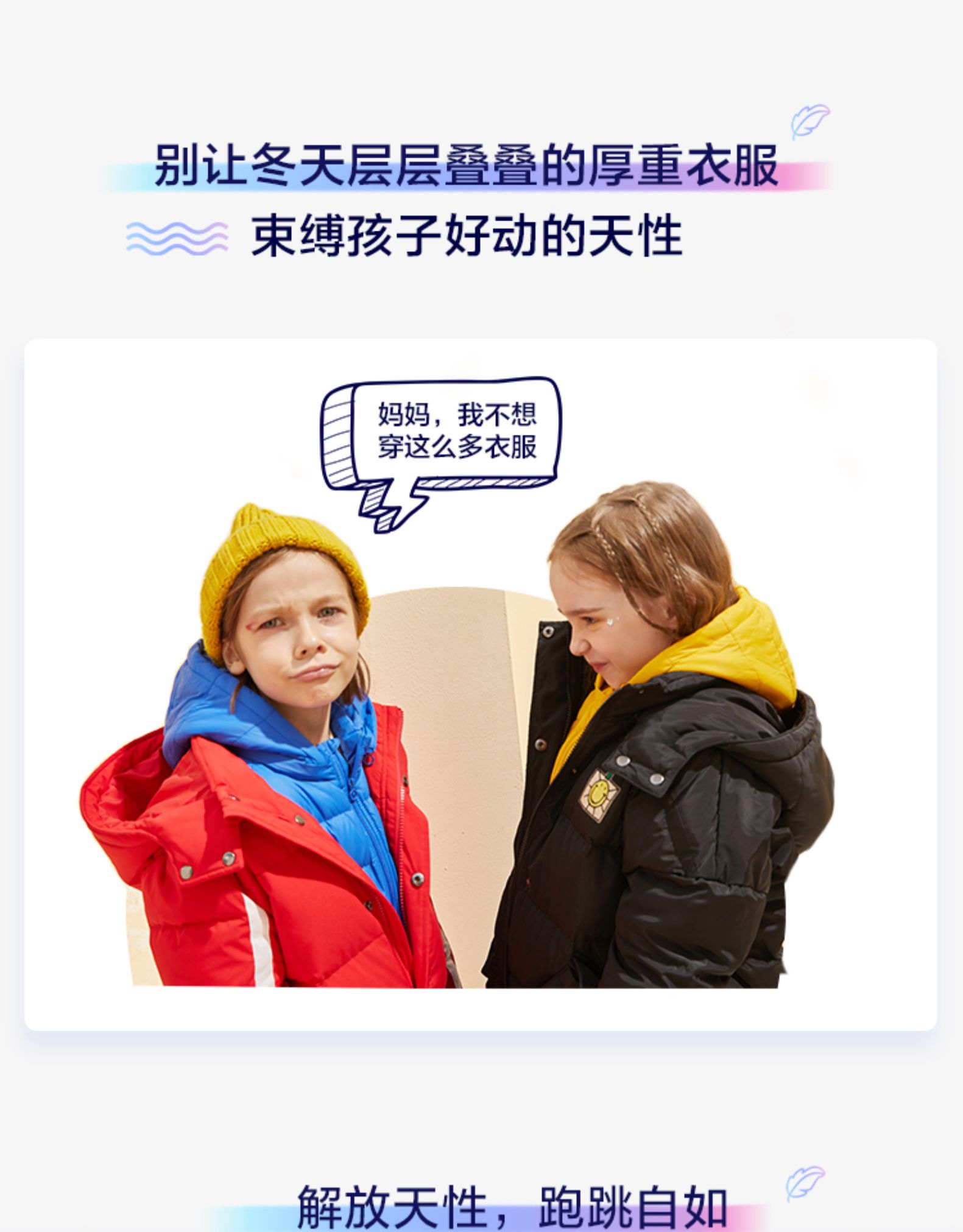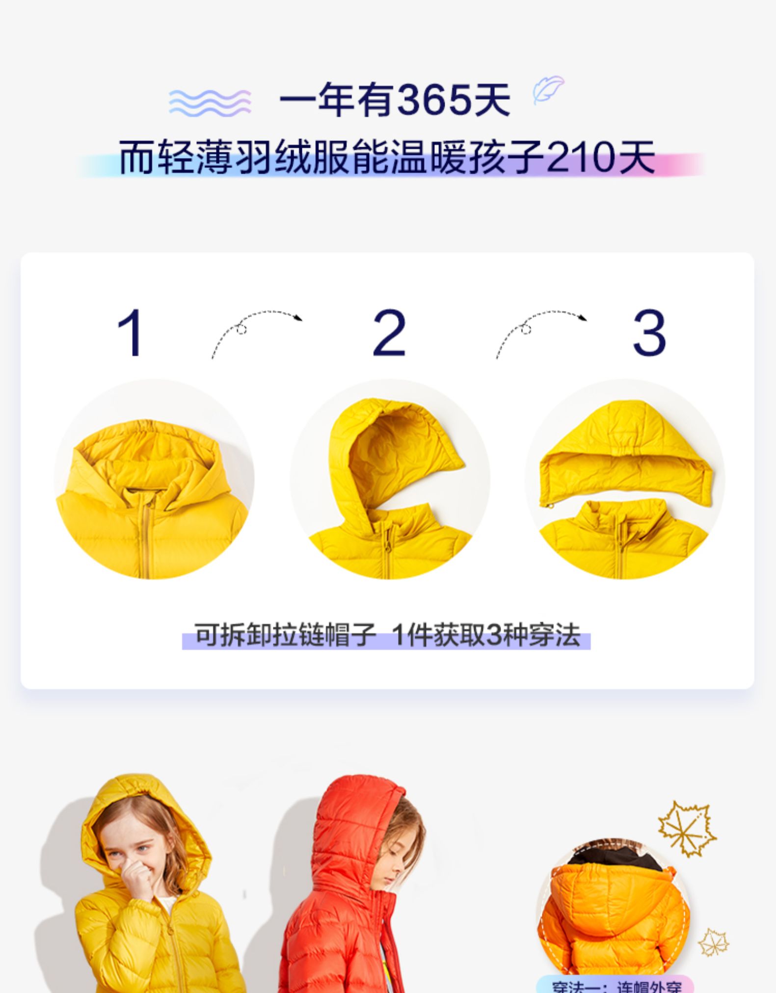 这款羽绒服主打“棉花糖”轻盈,内里填充90%白鸭绒,精选鸭腹部大绒朵羽毛,保暖效果好,轻盈不压身,小朋友没有压身束缚感,穿着更舒适。此外,羽绒经多道消毒工序处理,清洁度高,健康卫生,更为放心。