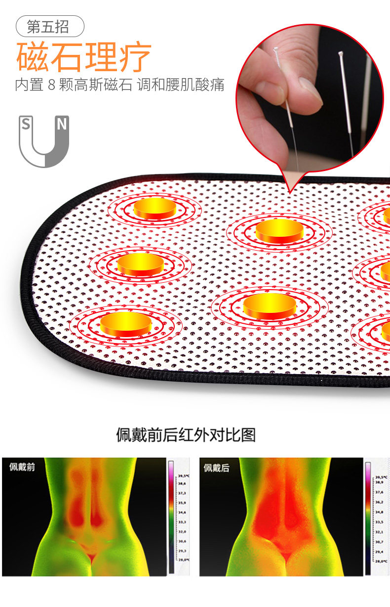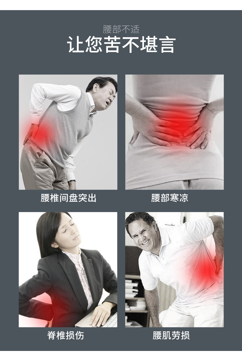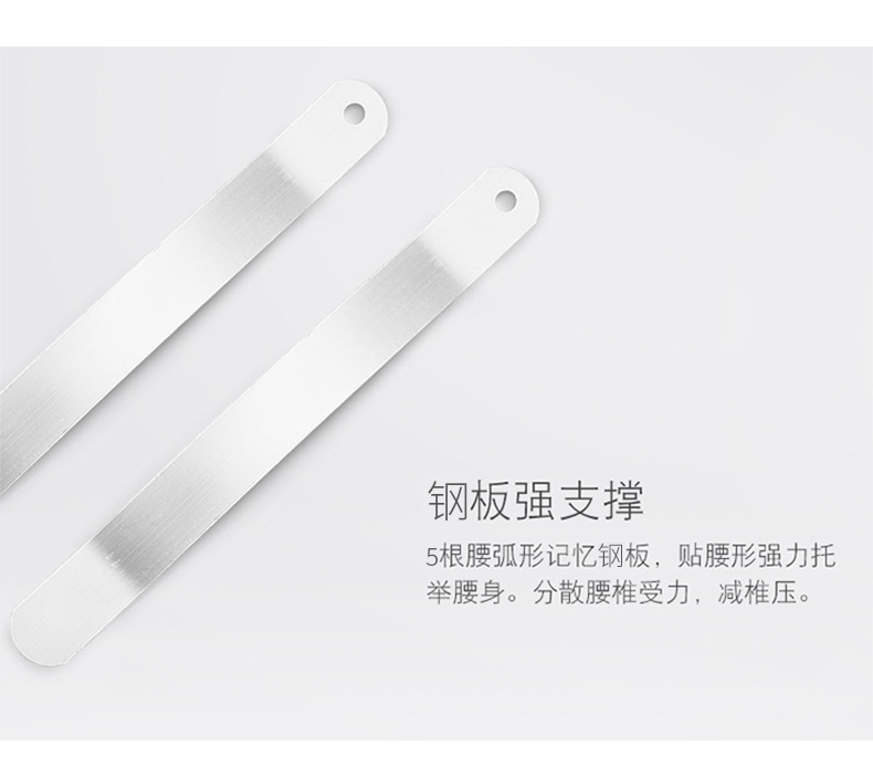 这款护腰带采用自发热设计,内置8颗理疗磁石,热敷理疗。4-5根弧度铝板分列支撑,贴合人体腰部曲线,固定修复病变的脊椎,引导正确姿势,稳定支撑。
