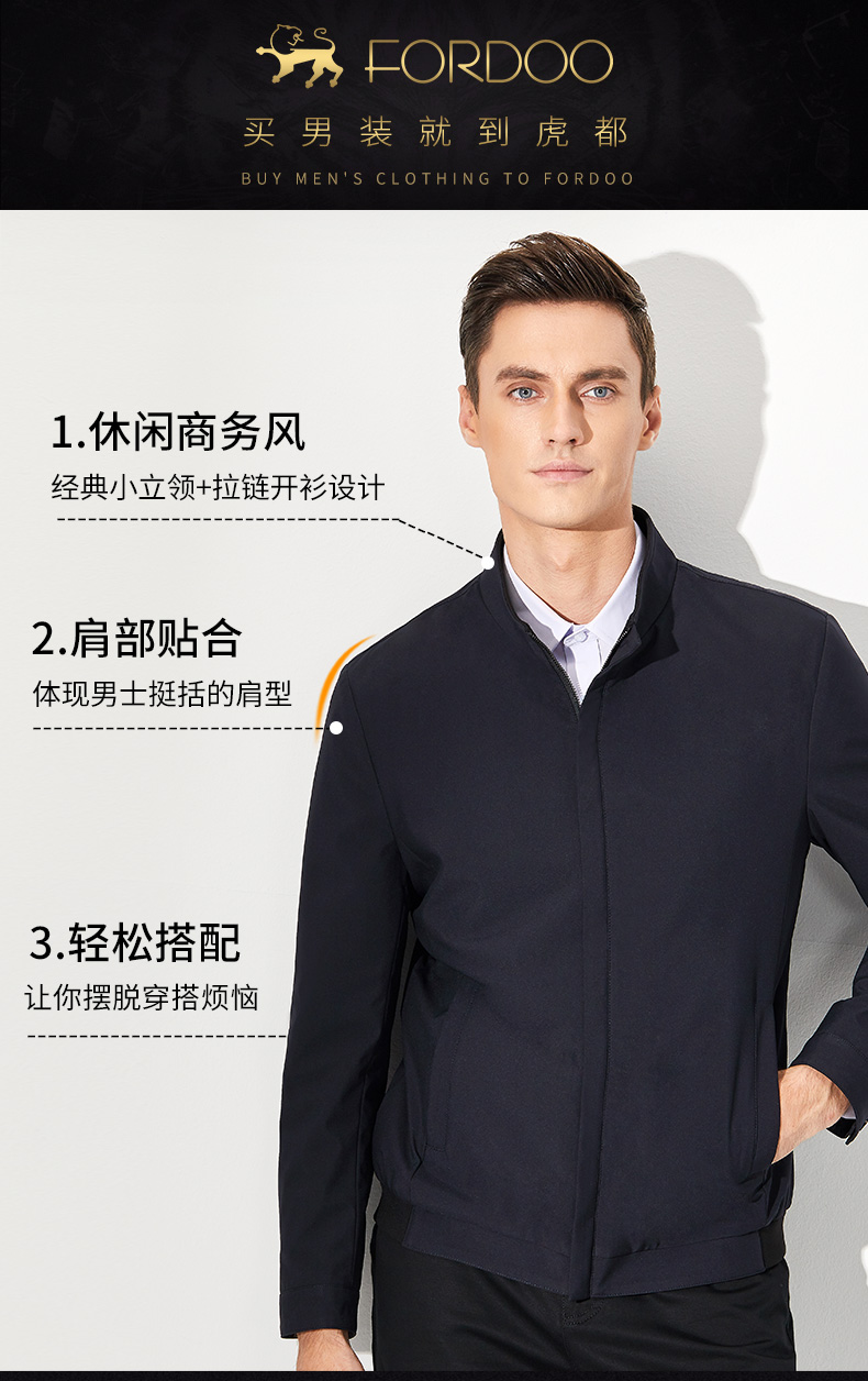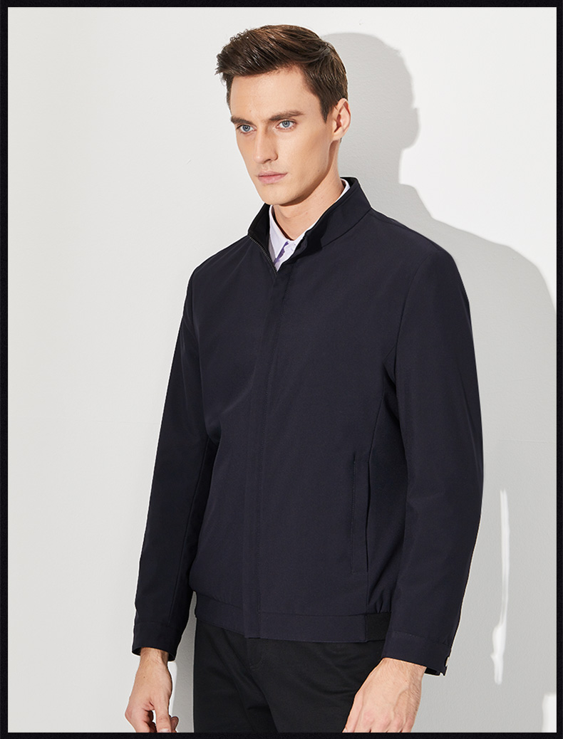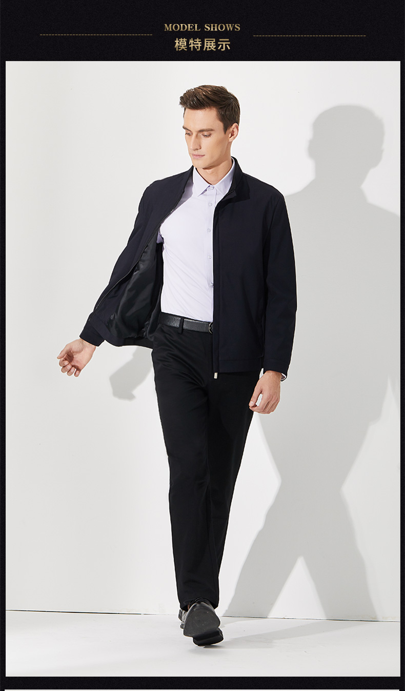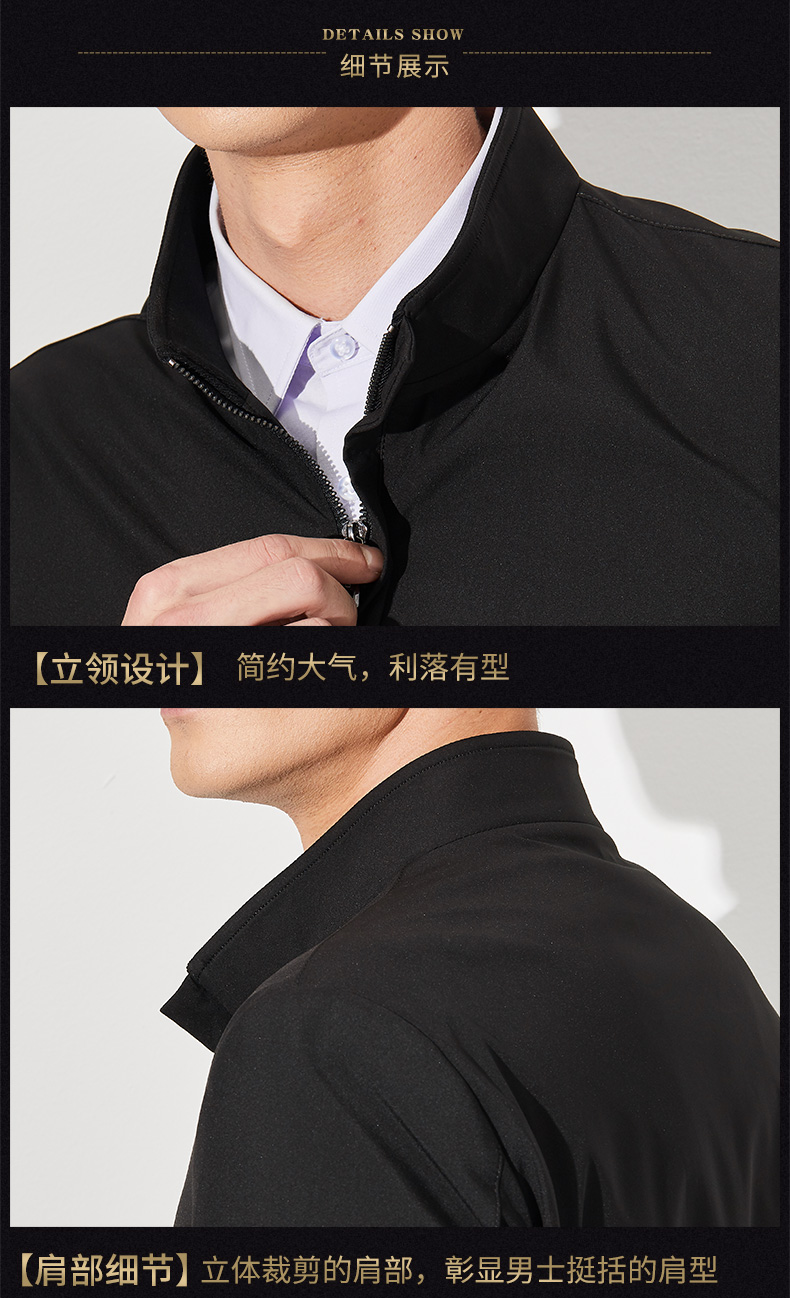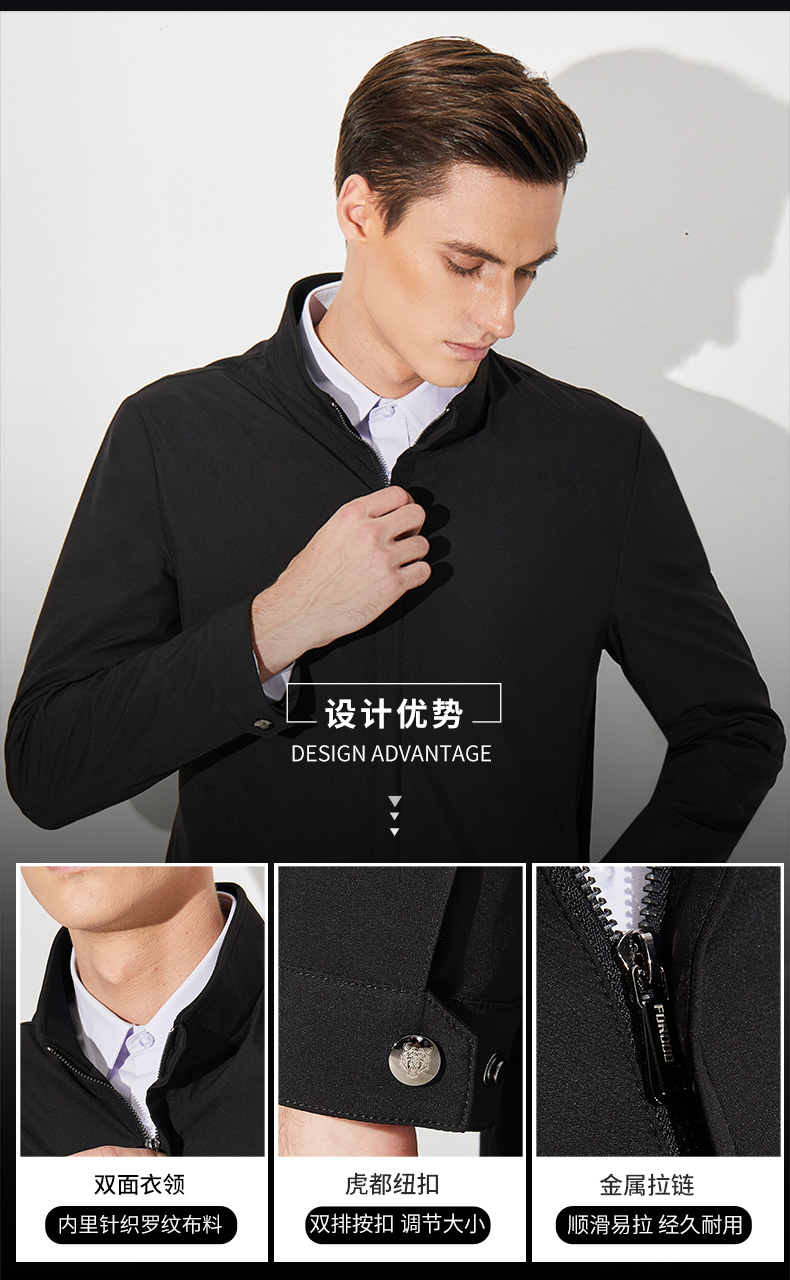 精选涤纶材质,版型挺括,且不易起球褶皱;表面有光泽,视觉档次也高。立体裁剪工艺,经典小立领+拉链开衫设计,挺拔有型。门襟处使用品牌Logo定制款纽扣和拉链,这些都是高档服饰的配置,细节精致到位。