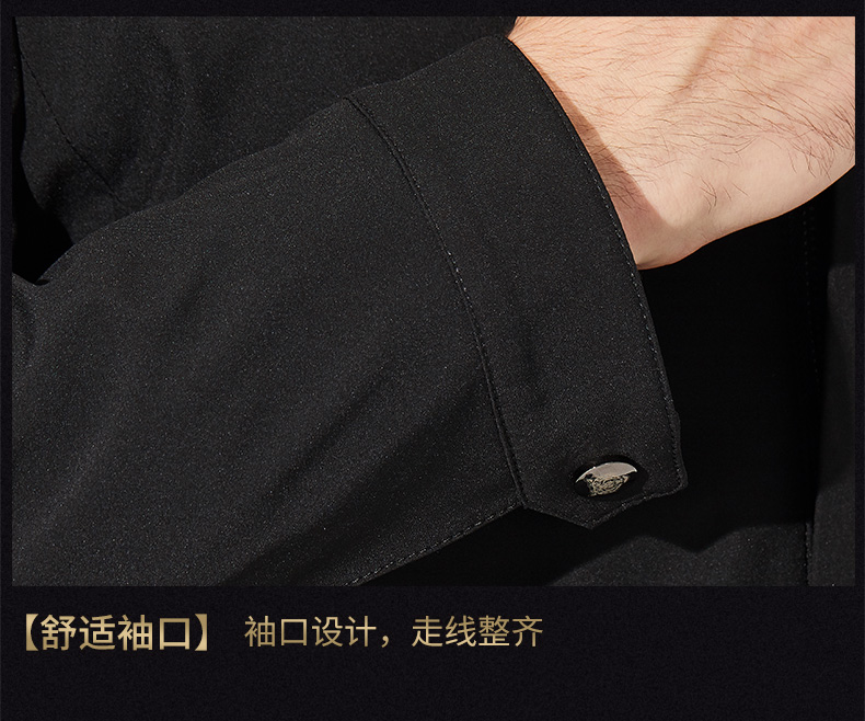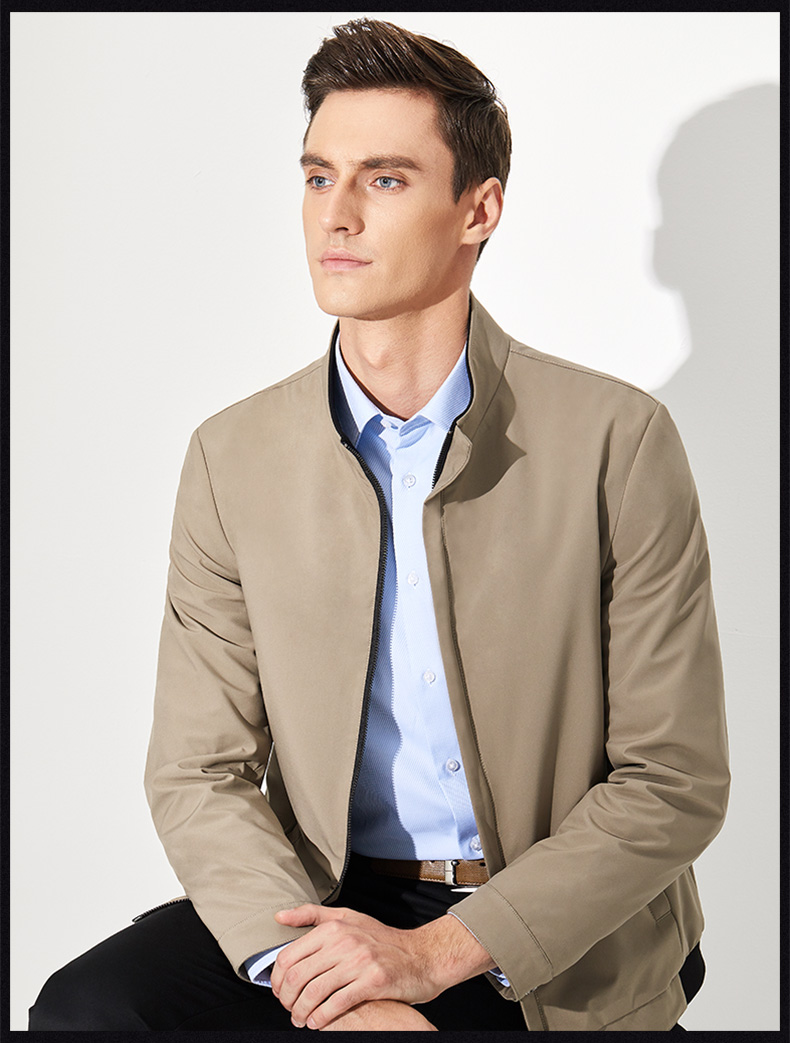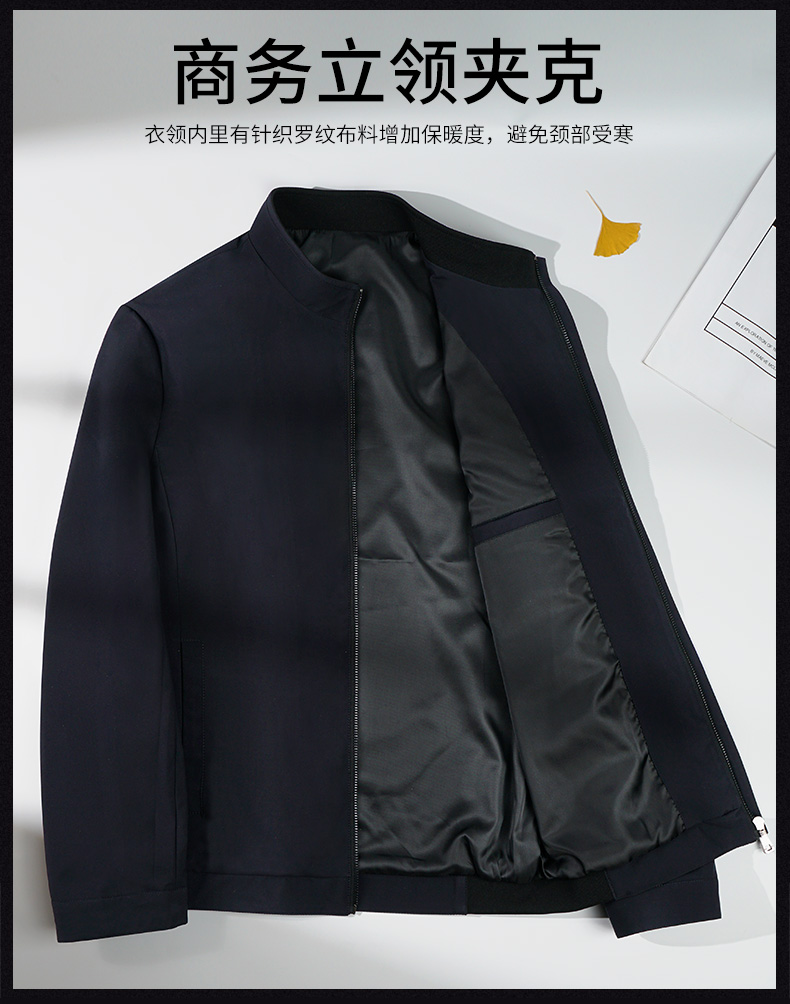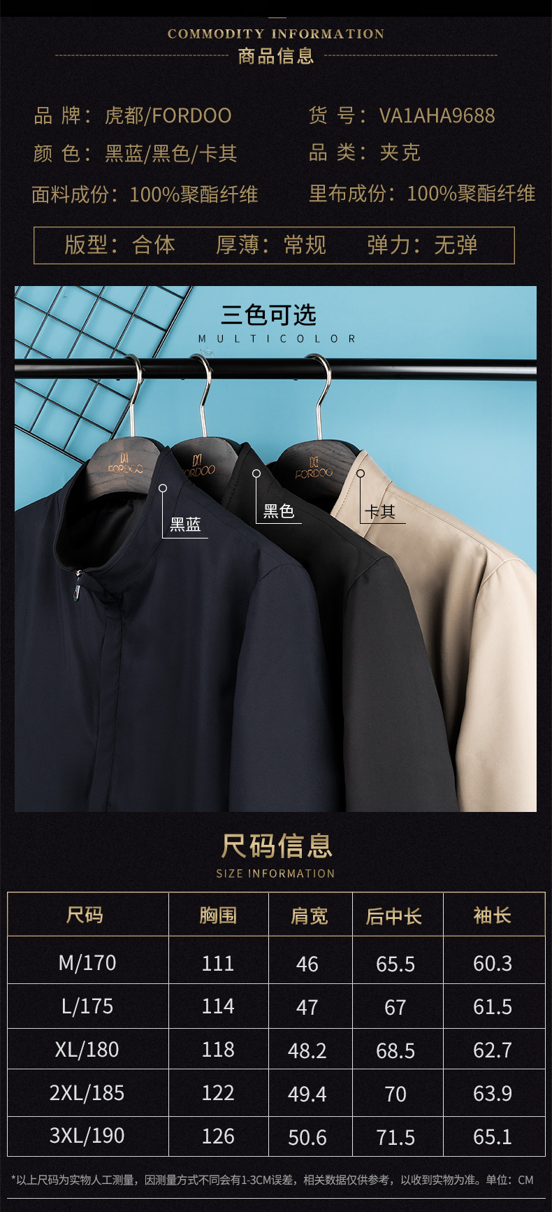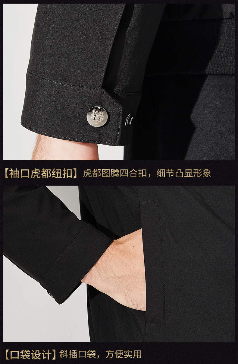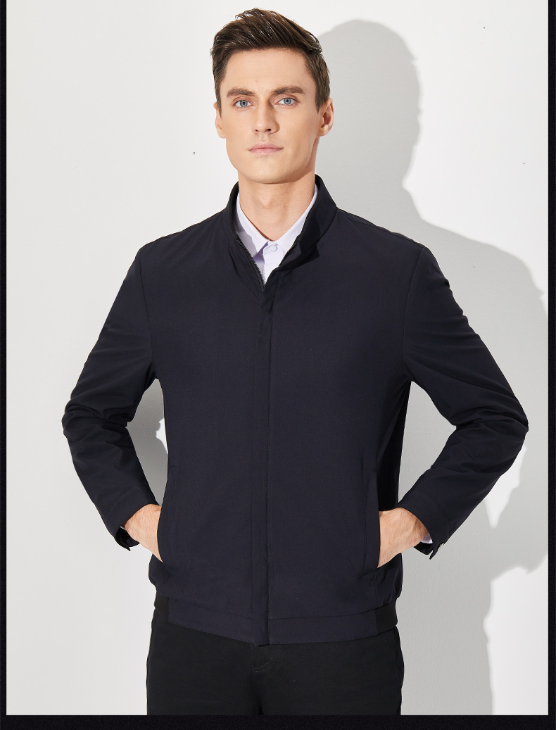 精选涤纶材质,版型挺括,且不易起球褶皱;表面有光泽,视觉档次也高。立体裁剪工艺,经典小立领+拉链开衫设计,挺拔有型。门襟处使用品牌Logo定制款纽扣和拉链,这些都是高档服饰的配置,细节精致到位。