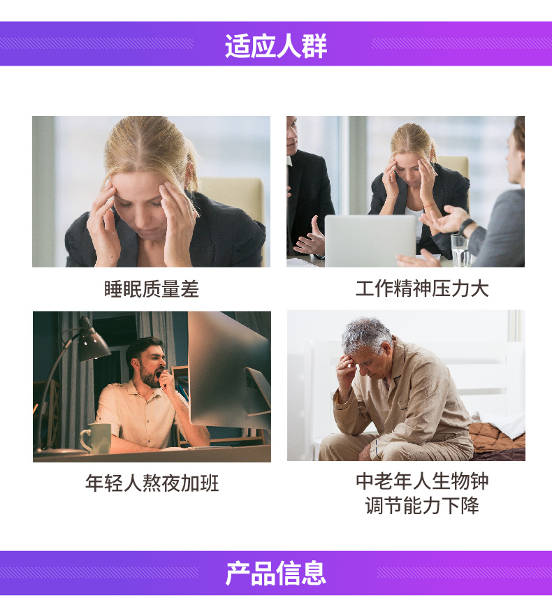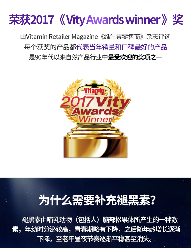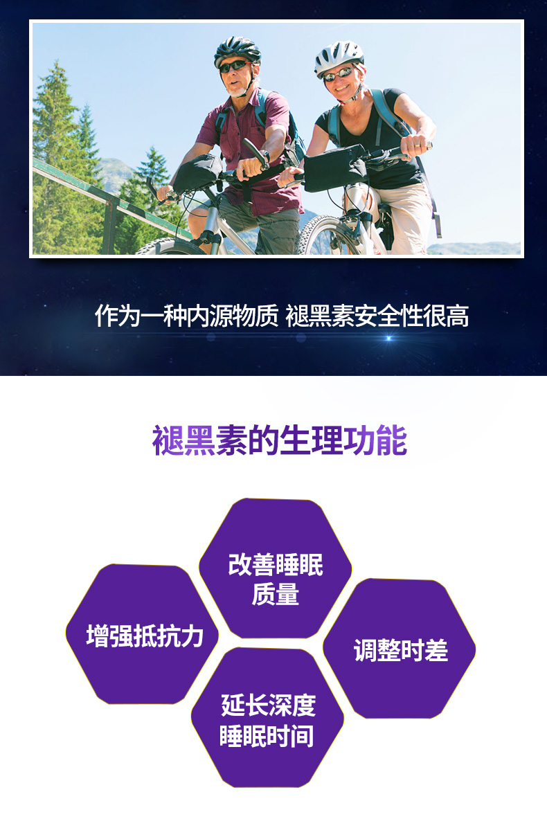 褪黑素(又称脑白金、松果体素),是人体大脑松果中每晚分泌的一种控制人体信息的重要活性物质。它控制并影响 其它不同激素的分泌,从而直接控制人体生理的各种机能。所以必需摄取并补充足够的褪黑素,使人体的含量维持在年轻人分泌量的状态,才能有效维持人体脑部环 境动态平衡,提高免疫力,减缓衰老速度,同时调整人体生物钟,促进睡眠,提高睡眠质量,可替代有较强副作用的安眠药。
